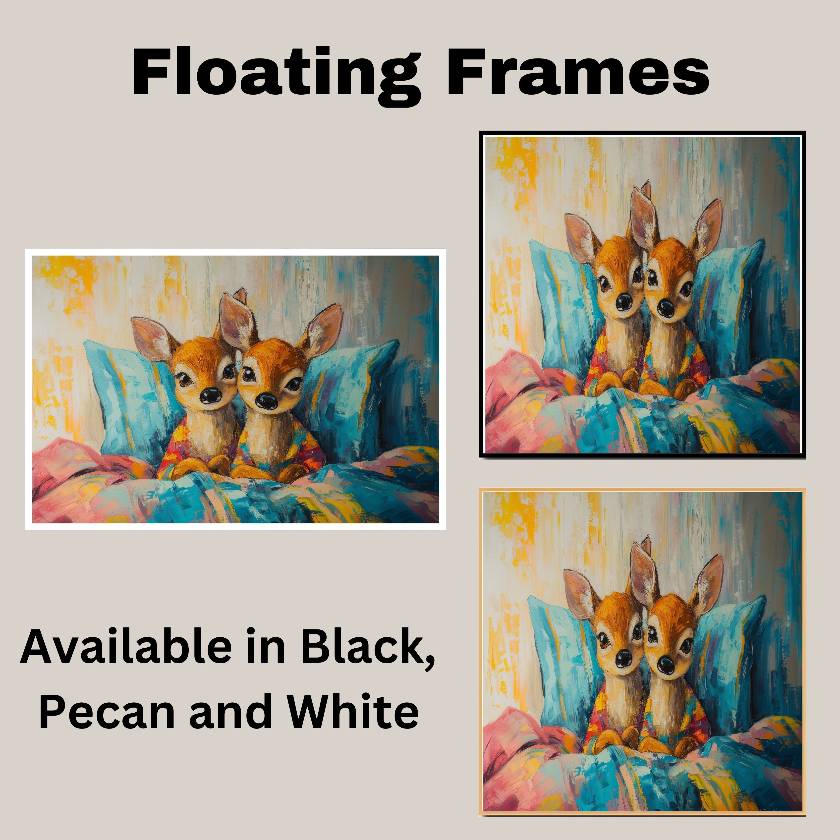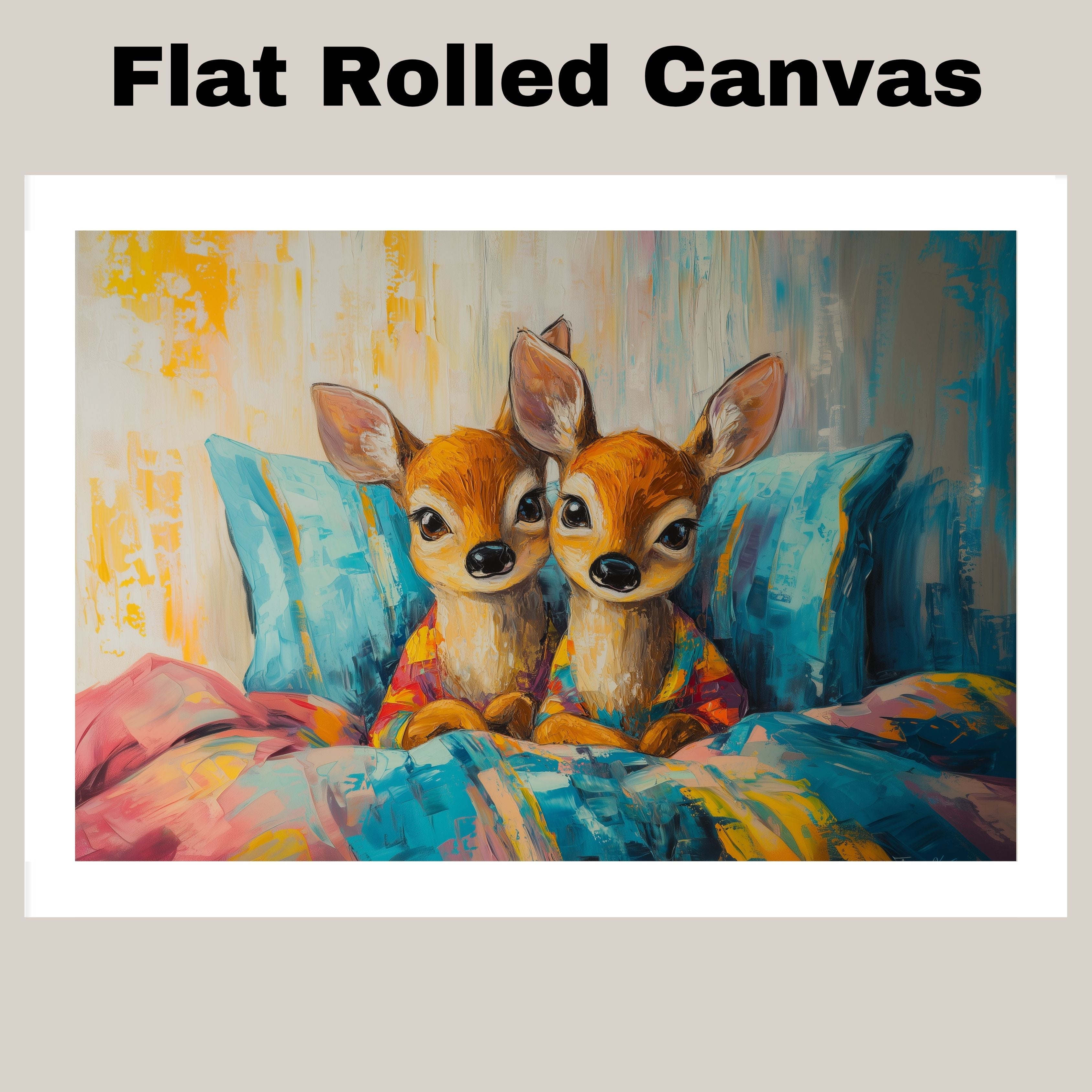Painting of Two Cute Deer in Colorful Pajamas Sitting on a Vibrant Bed with Bright Pillows Surrounded by Playful Brush Strokes and Warm Whimsical Details on Ready to Hang 1.5" Thick Canvas Wrap, Floating Framed Canvas, Flat Rolled Canvas