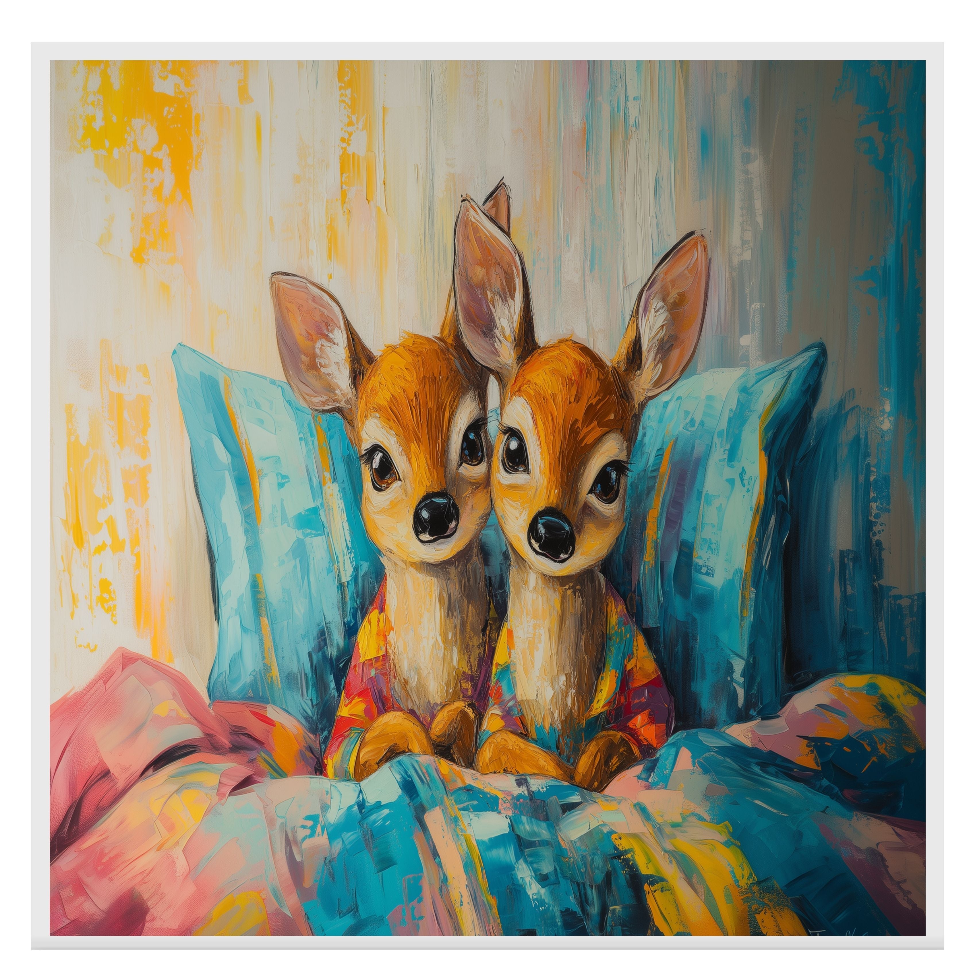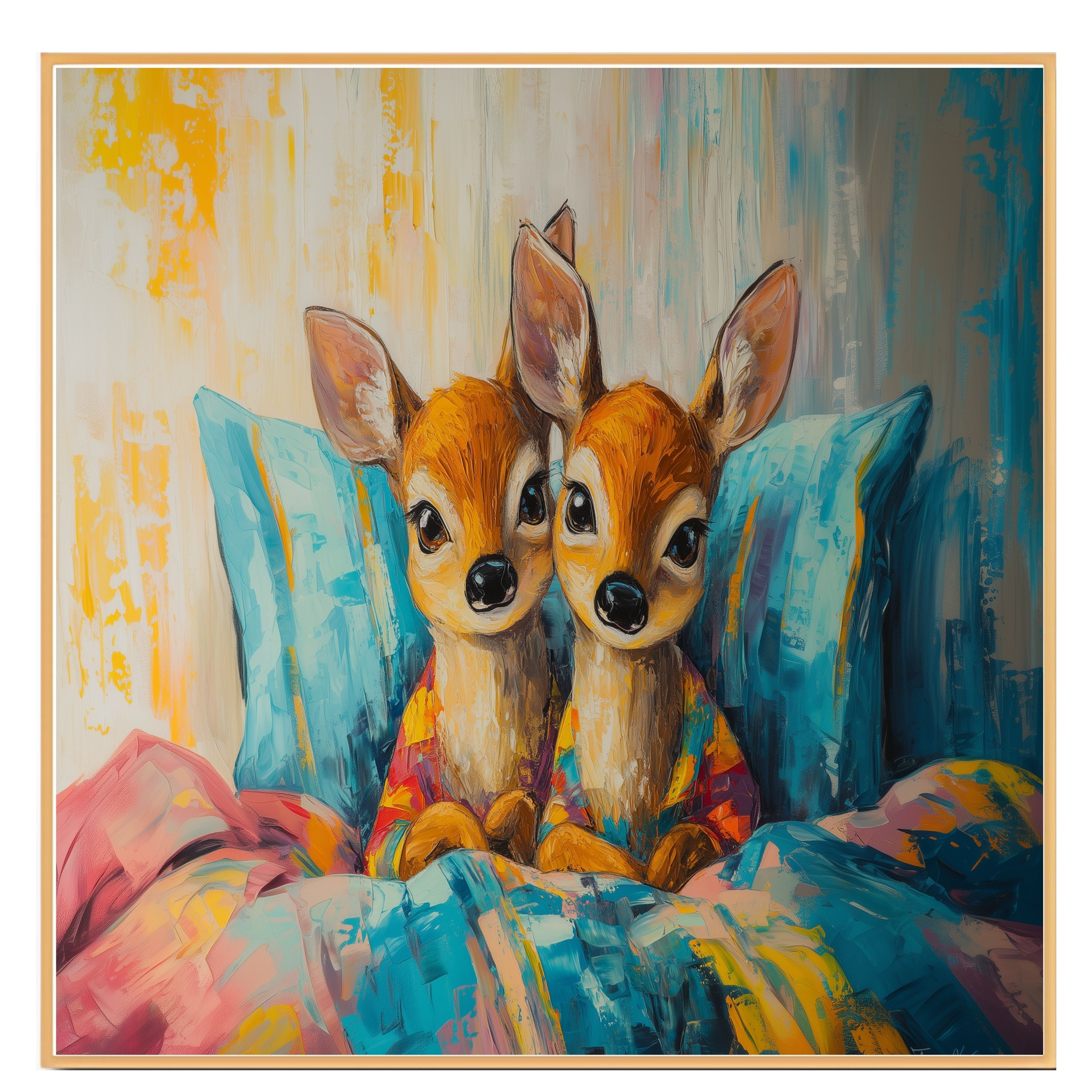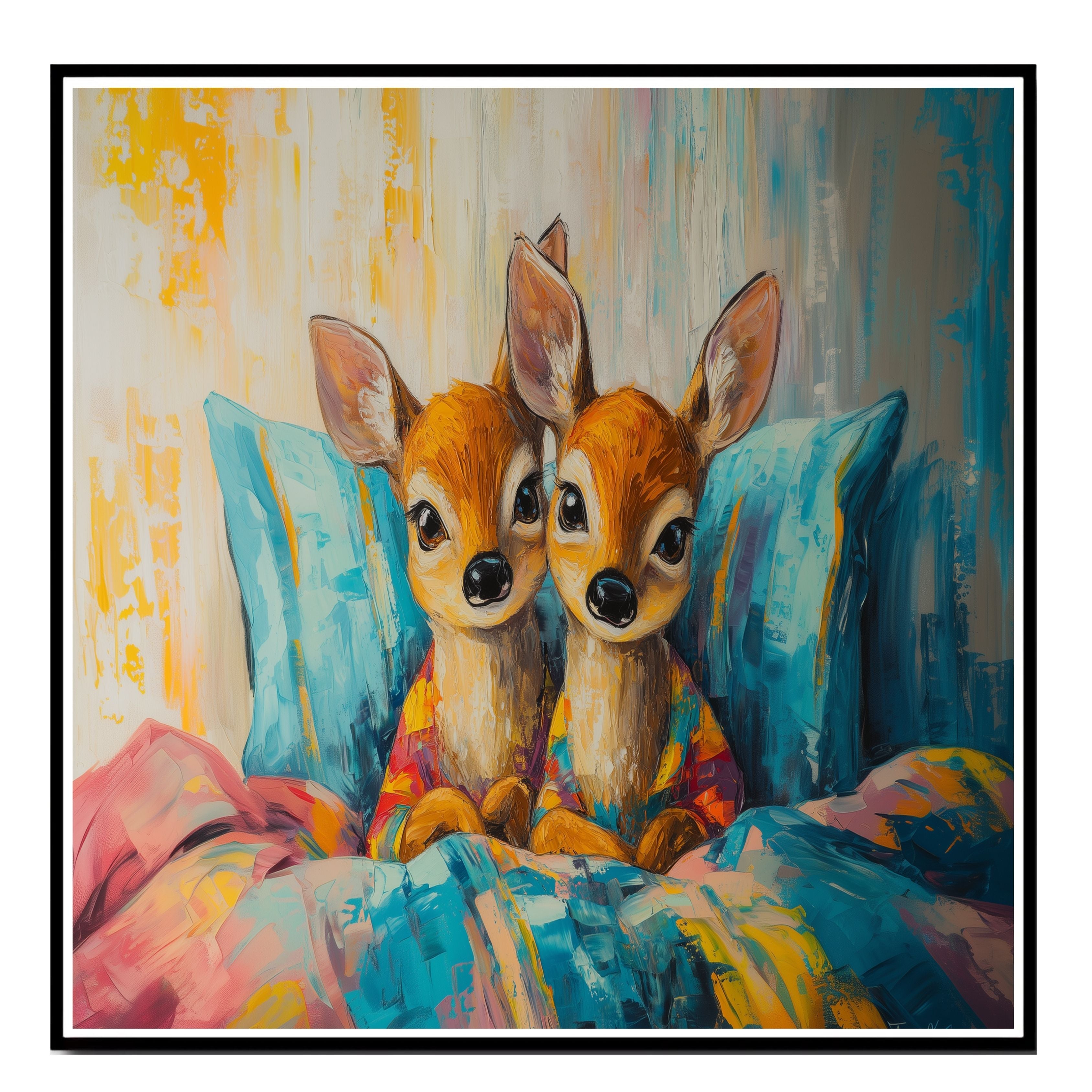 This delightful painting features two sweet deer snuggled up in vibrant pajamas on a colorful bed with bright pillows. Their gentle expressions, big eyes, and playful brush strokes bring warmth and whimsy to the scene. Perfect for animal lovers, nursery decor, or anyone who enjoys cheerful and imaginative artwork.