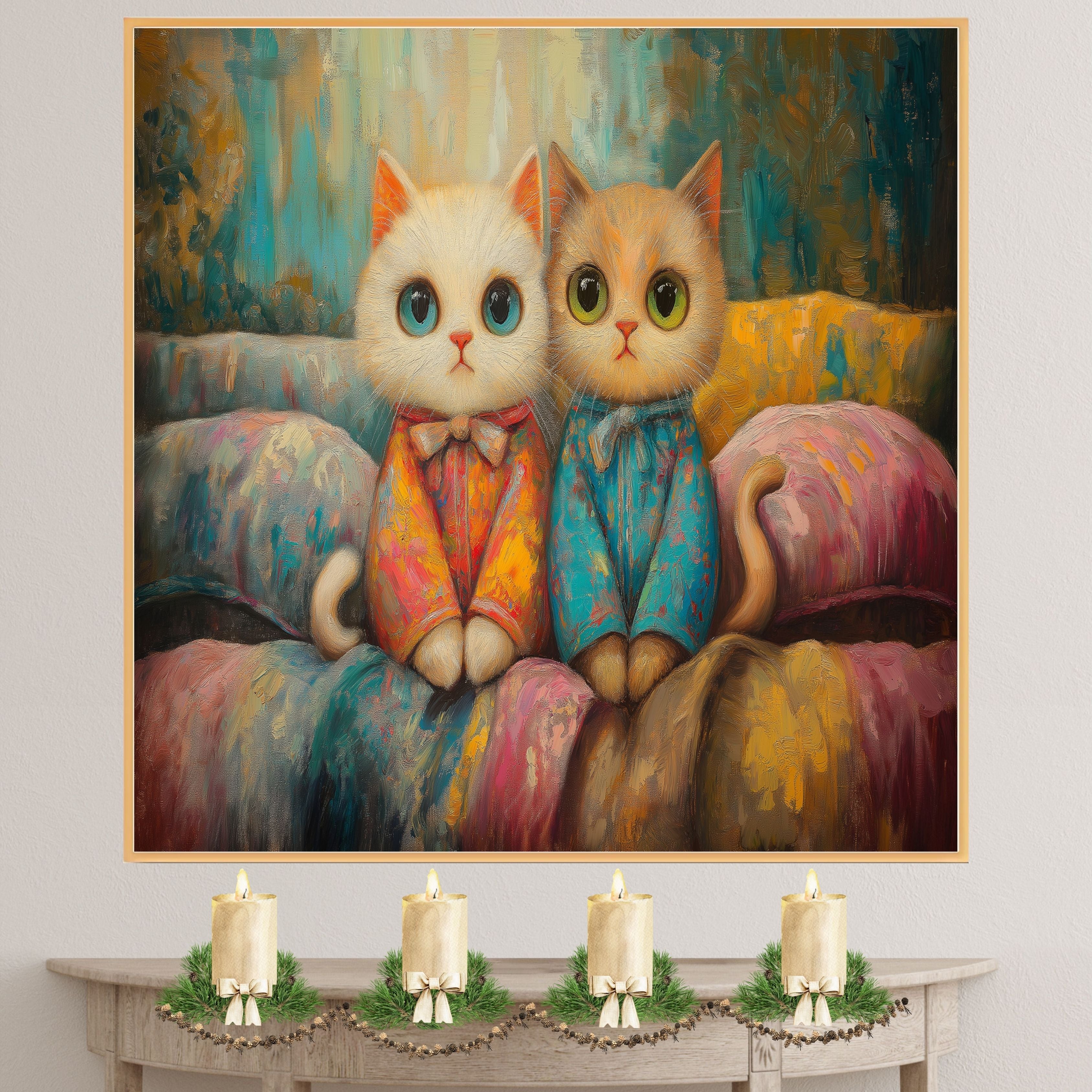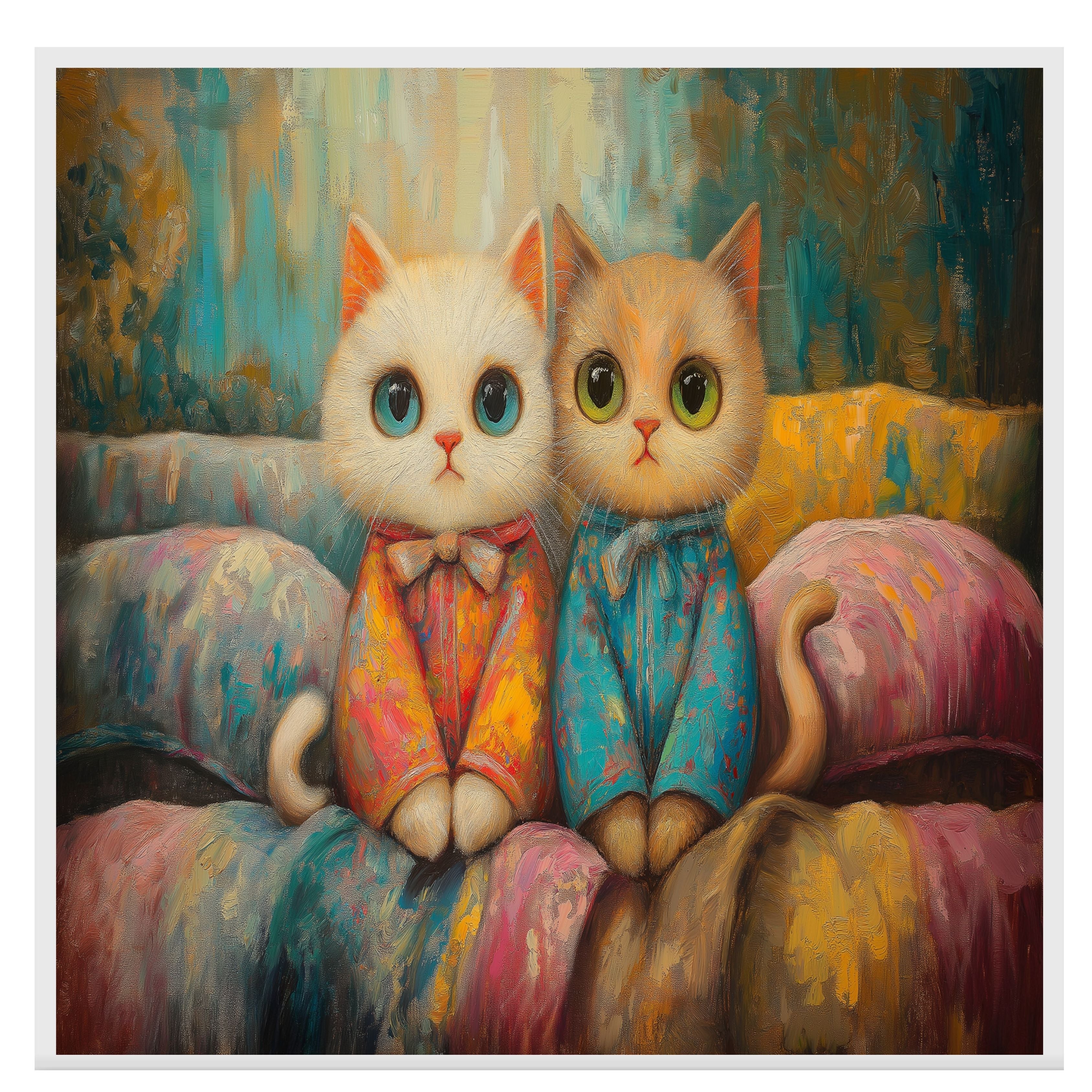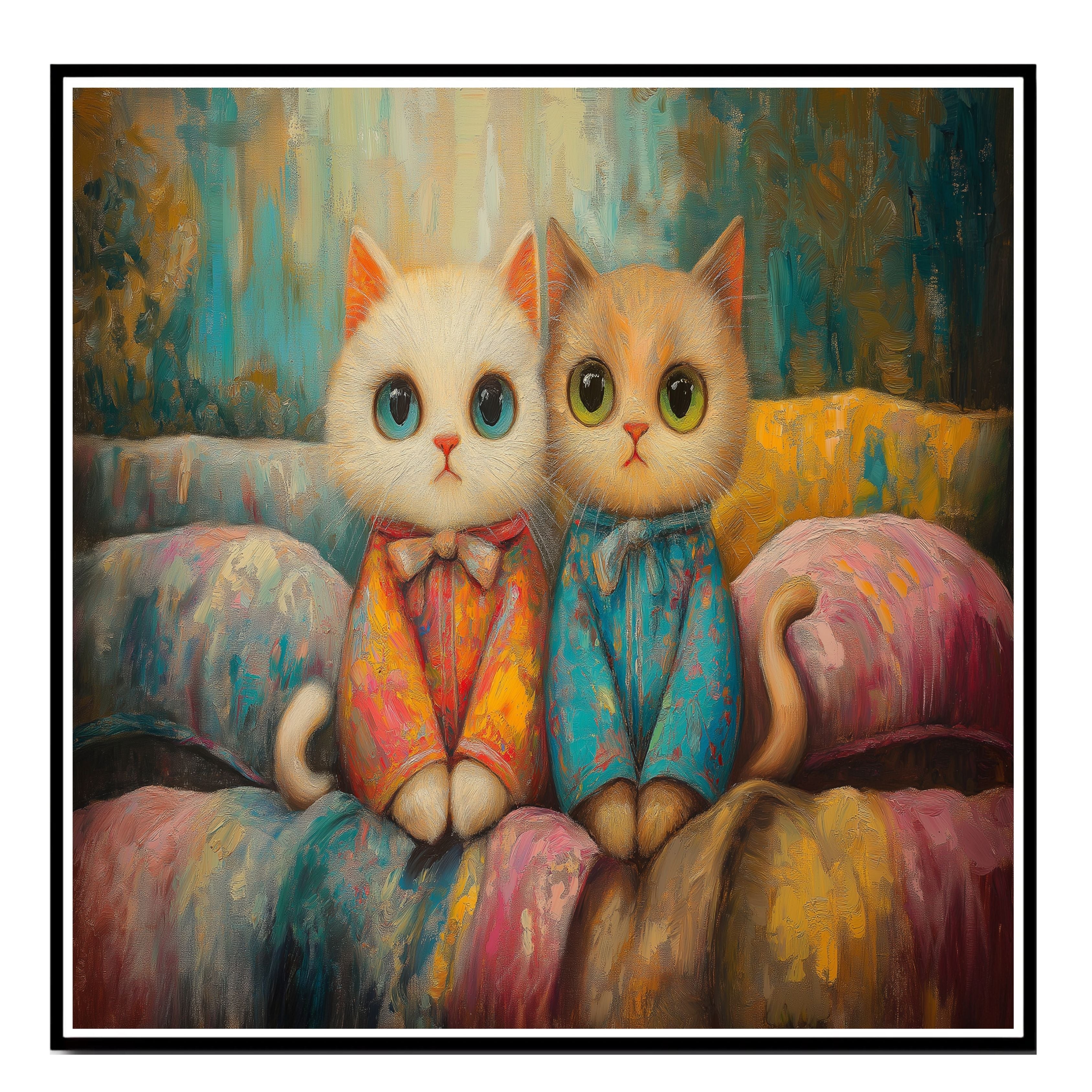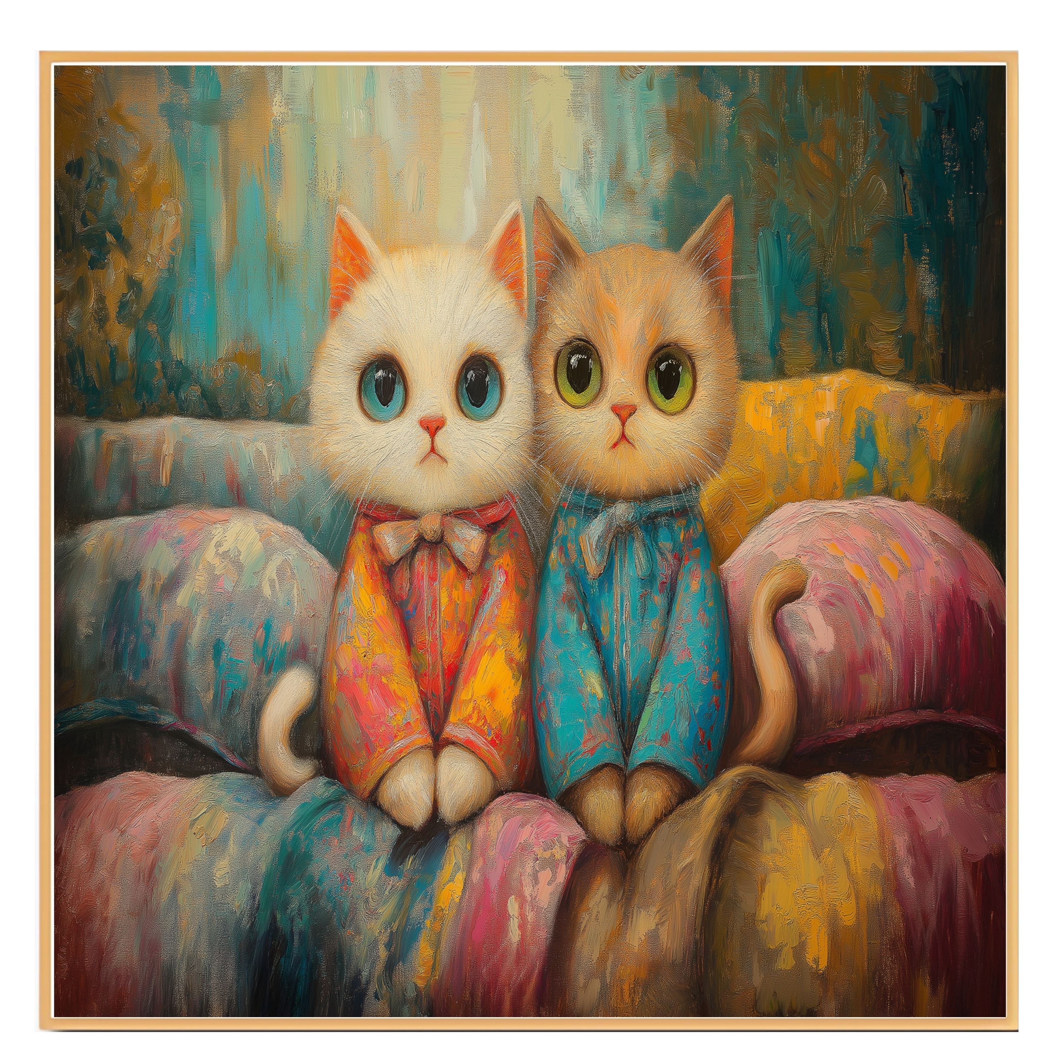 This sweet and whimsical painting features two wide-eyed kittens in colorful pajamas, sitting close together on a cozy bed. Surrounded by soft pastels and textured brushwork, their gentle expressions and fluffy fur bring a comforting charm perfect for cat lovers, children's rooms, or anyone who enjoys playful and cozy art.
