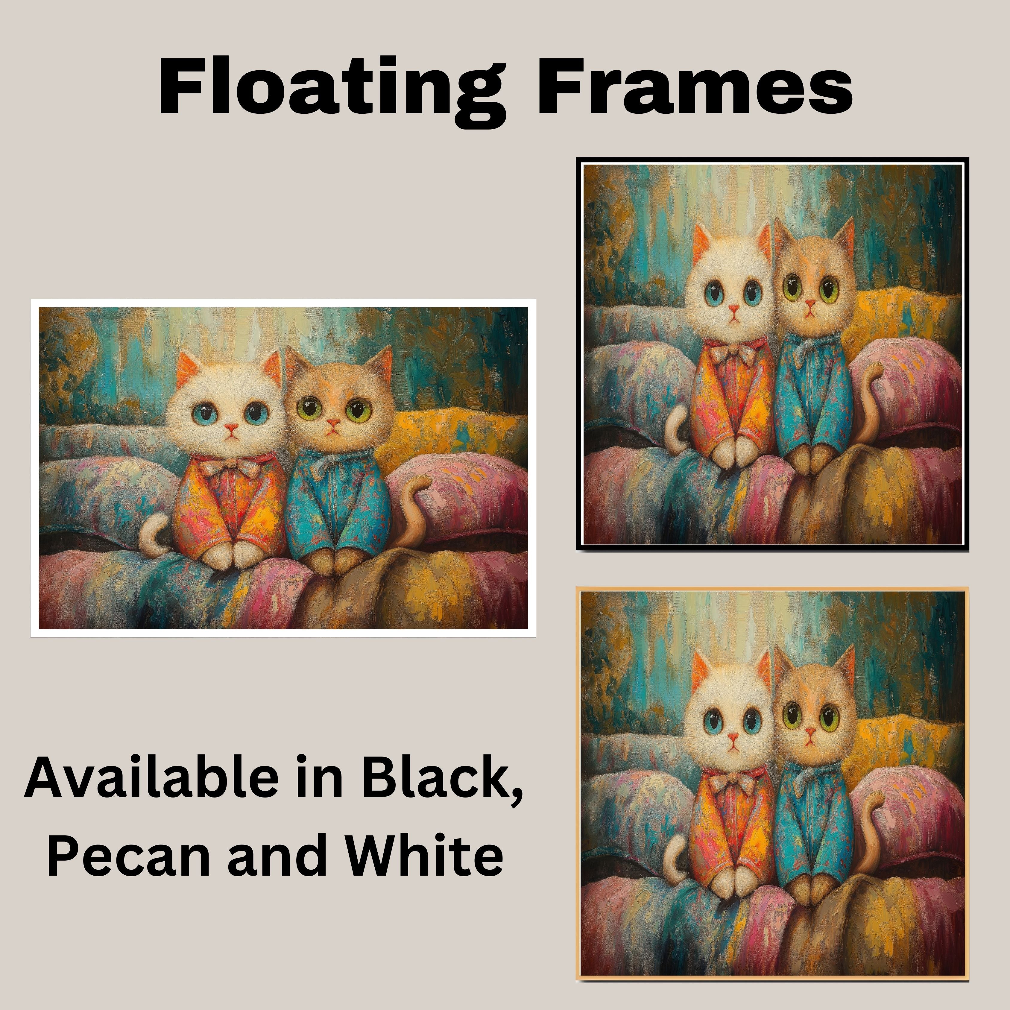1.5" Thick Floating Framed Canvas: Available in Black, Pecan, and White Grain. Durable shrink-resistant frame. Comes with easy-to-install hanging kits, ready for immediate display.