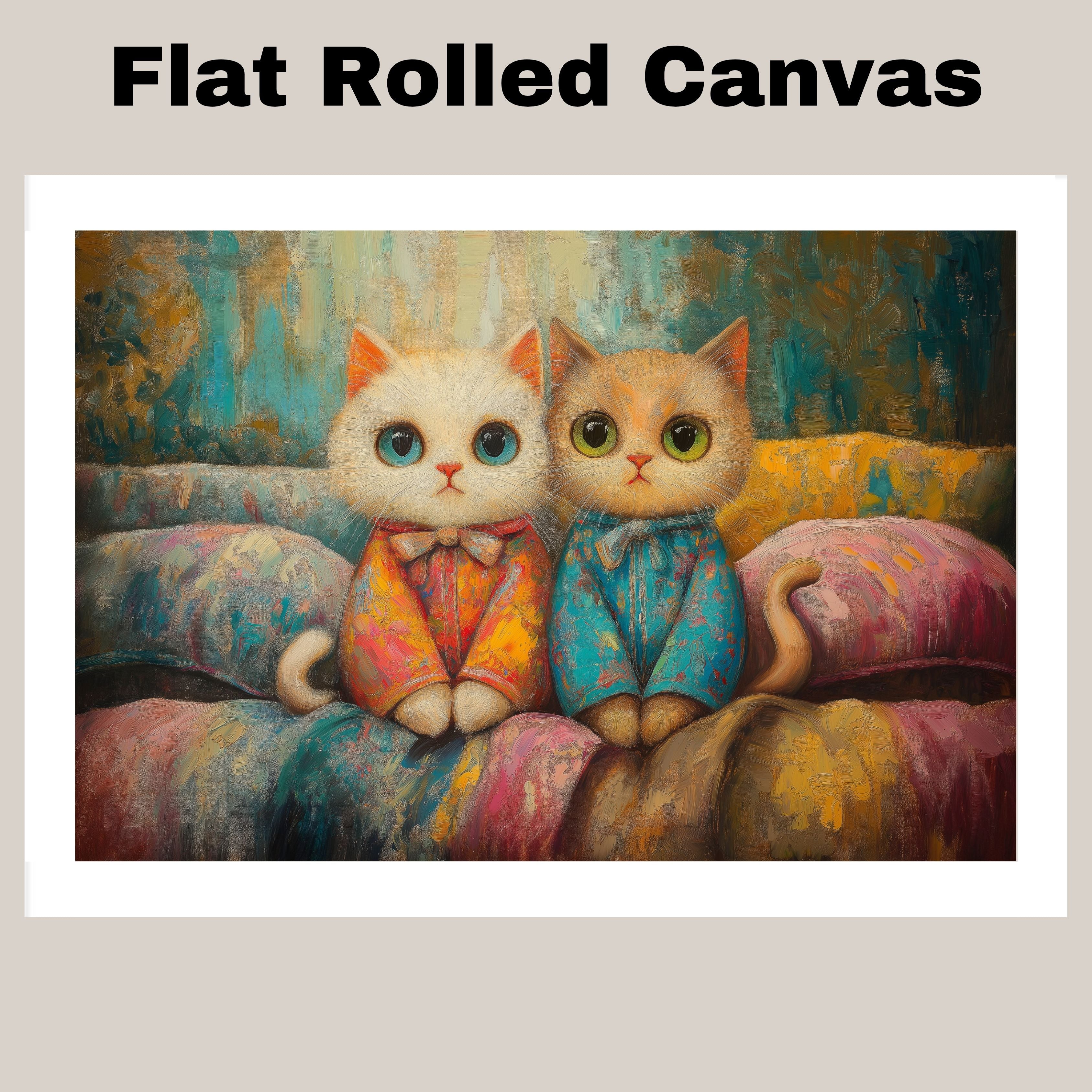 Painting of Two Cute Kittens Sitting Side by Side in Colorful Pajamas with Big Eyes and Soft Fur on a Cozy Bed Surrounded by Pastel Colors and Whimsical Textures on Ready to Hang 1.5" Thick Canvas Wrap, Floating Framed Canvas, Flat Rolled Canvas