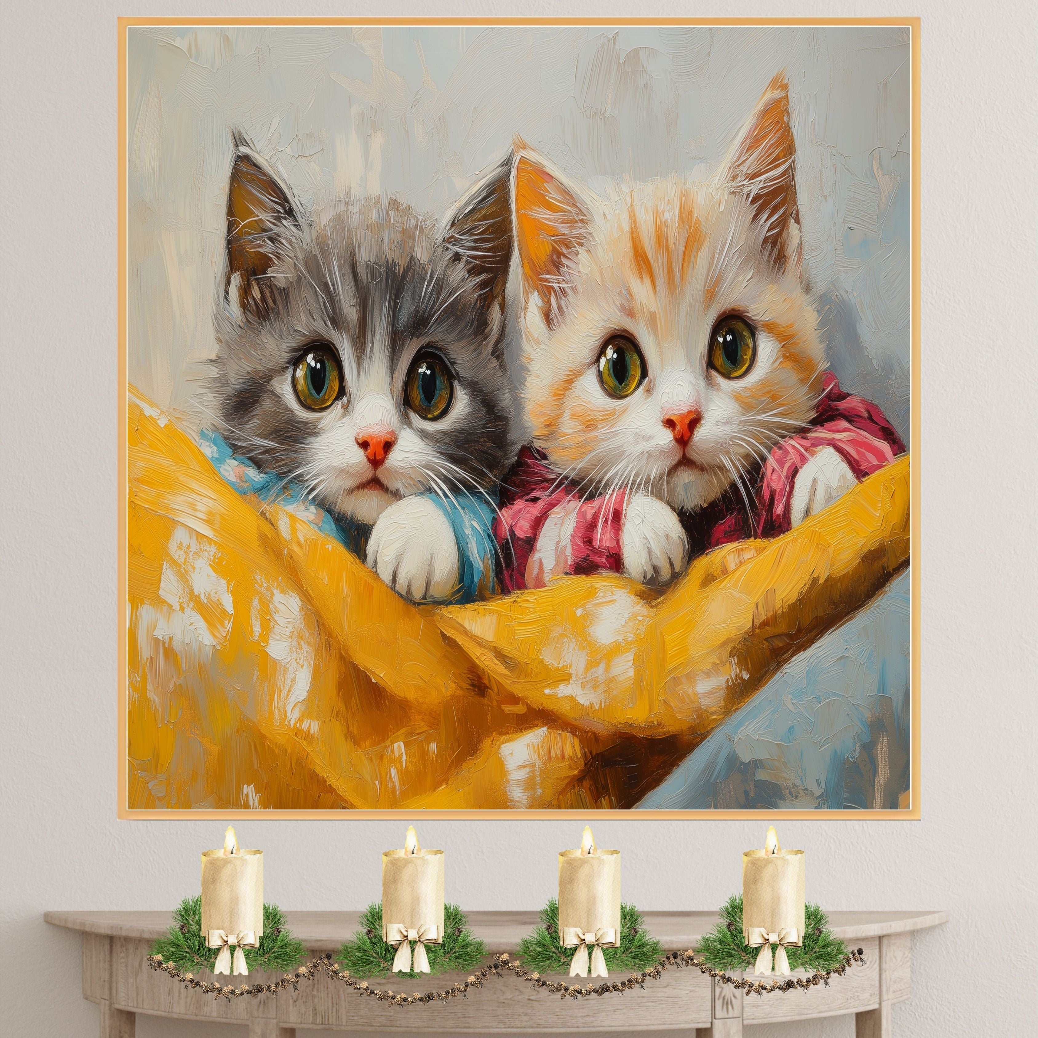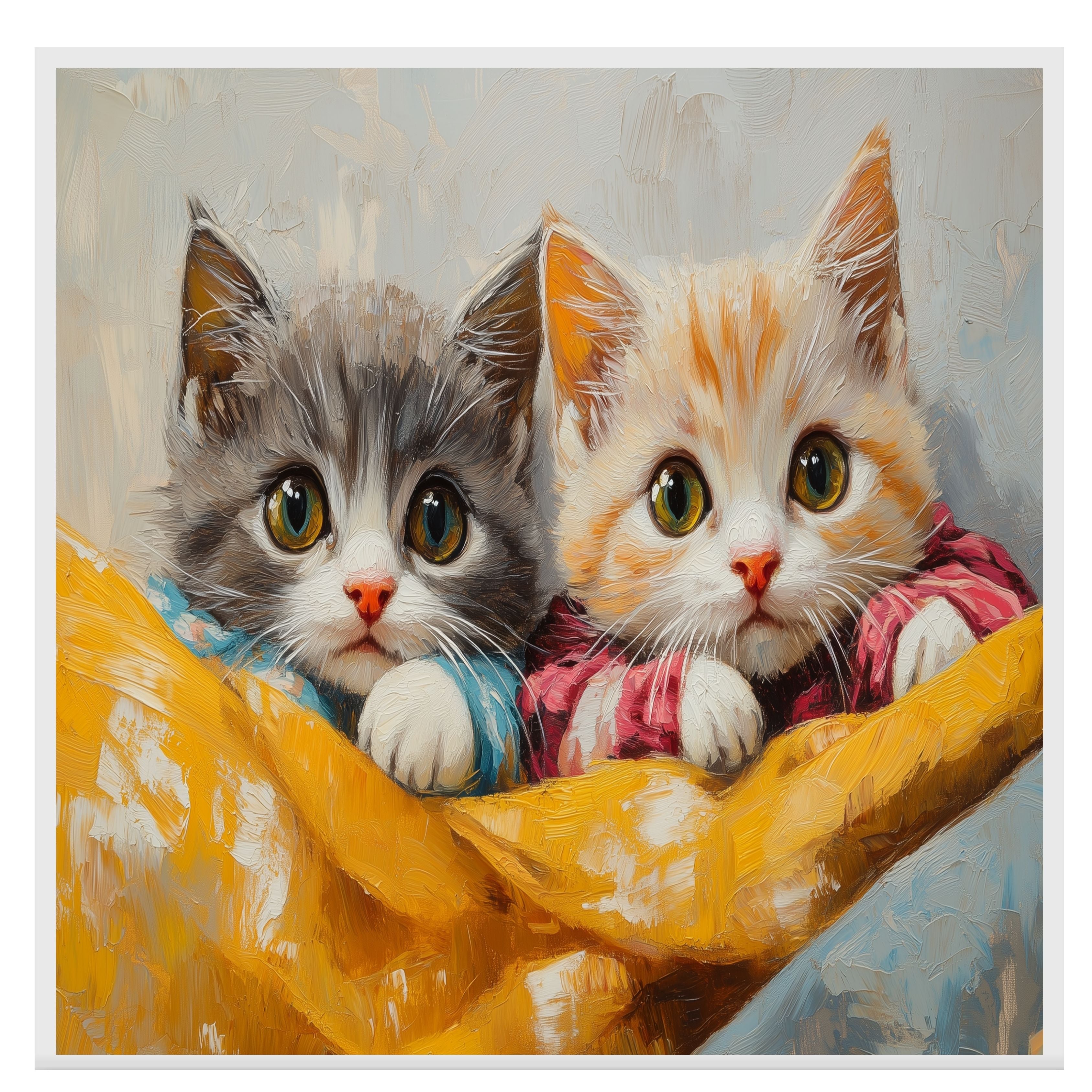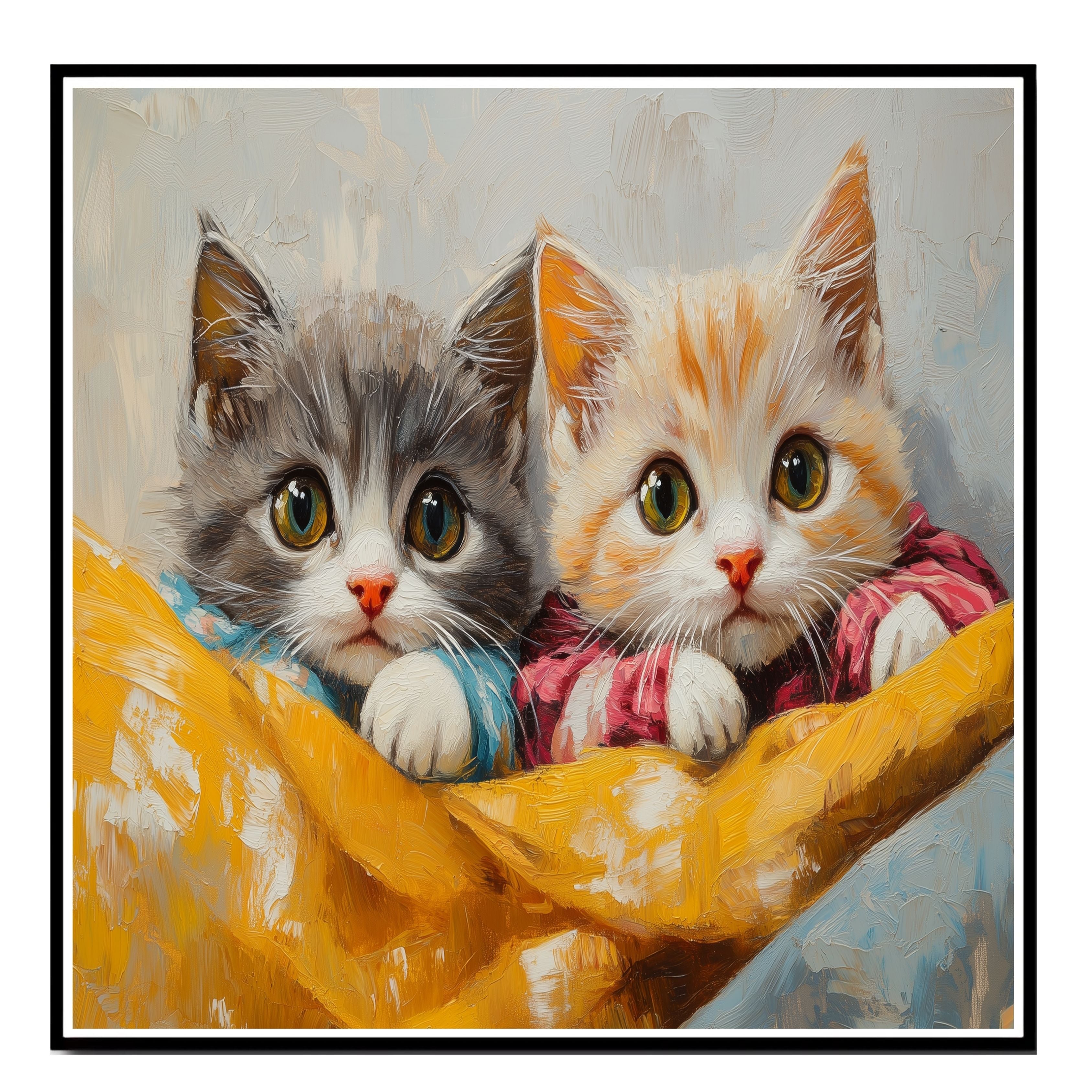 This endearing painting features two little kittens nestled side by side in colorful pajamas, resting on a bright yellow blanket. Their expressive eyes, fluffy fur, and cozy poses create a heartwarming scene filled with comfort and charm. A delightful artwork for cat lovers and fans of playful, comforting imagery.