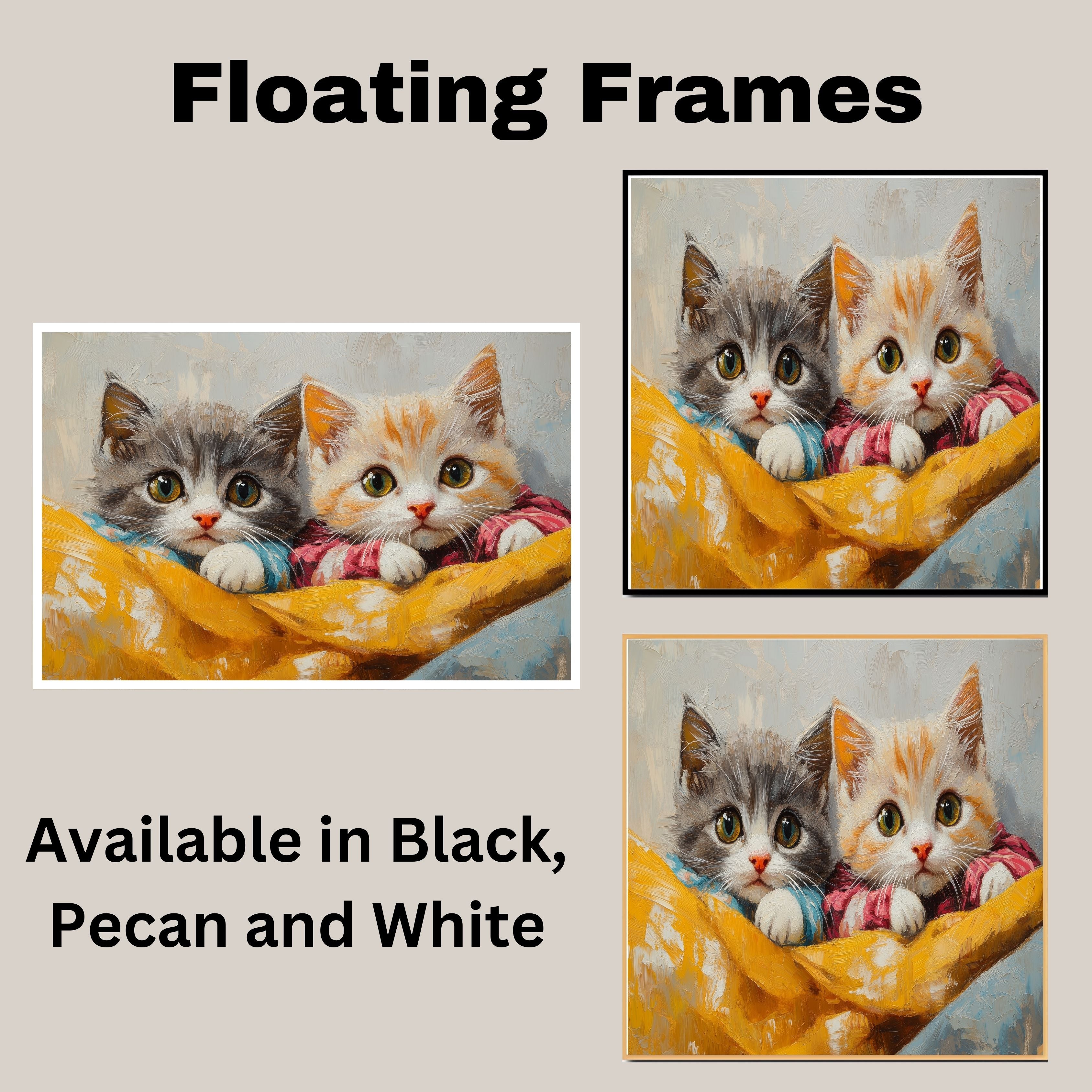 1.5" Thick Floating Framed Canvas: Available in Black, Pecan, and White Grain. Durable shrink-resistant frame. Comes with easy-to-install hanging kits, ready for immediate display.