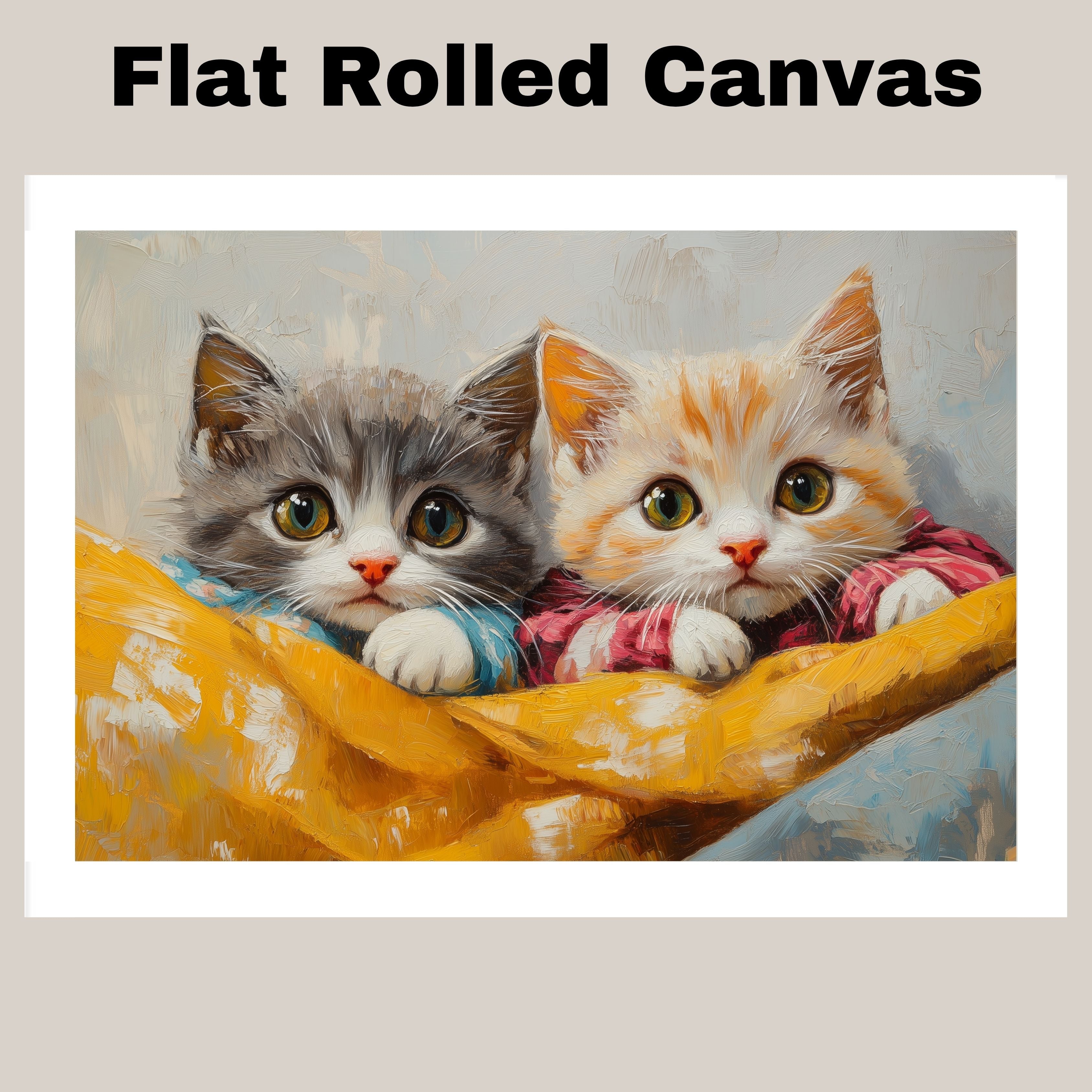 Painting of Two Cute Kittens Snuggled Together in Pajamas with Big Eyes and Soft Fur Resting on a Bright Yellow Blanket in a Cozy and Whimsical Setting on Ready to Hang 1.5" Thick Canvas Wrap, Floating Framed Canvas, Flat Rolled Canvas