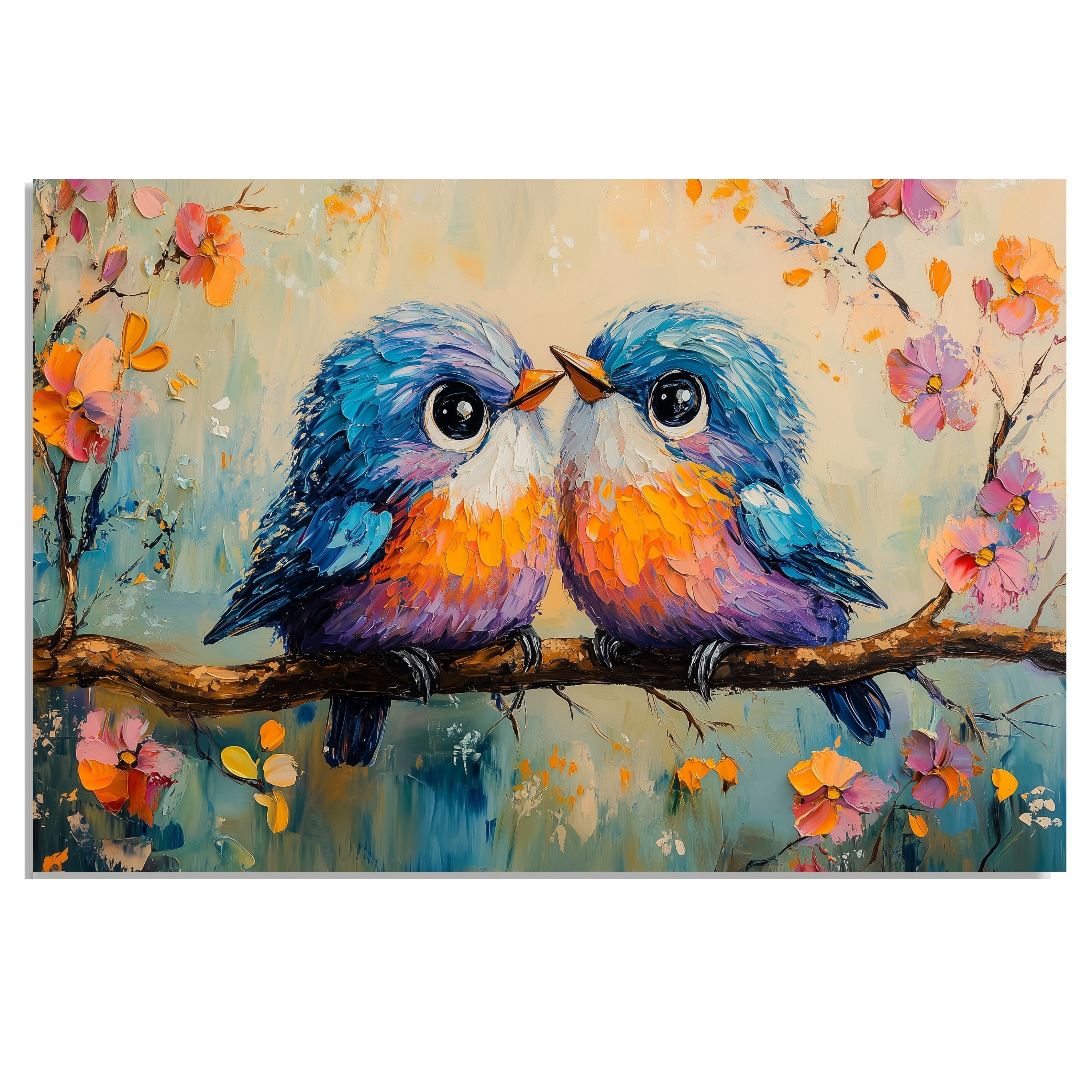 This charming painting features two plump and vibrant birds perched on a branch covered in colorful blossoms. Their oversized eyes and fluffy feathers create a heartwarming and whimsical spring scene. Perfect for bird lovers and those looking to add a touch of joy and color to their space.