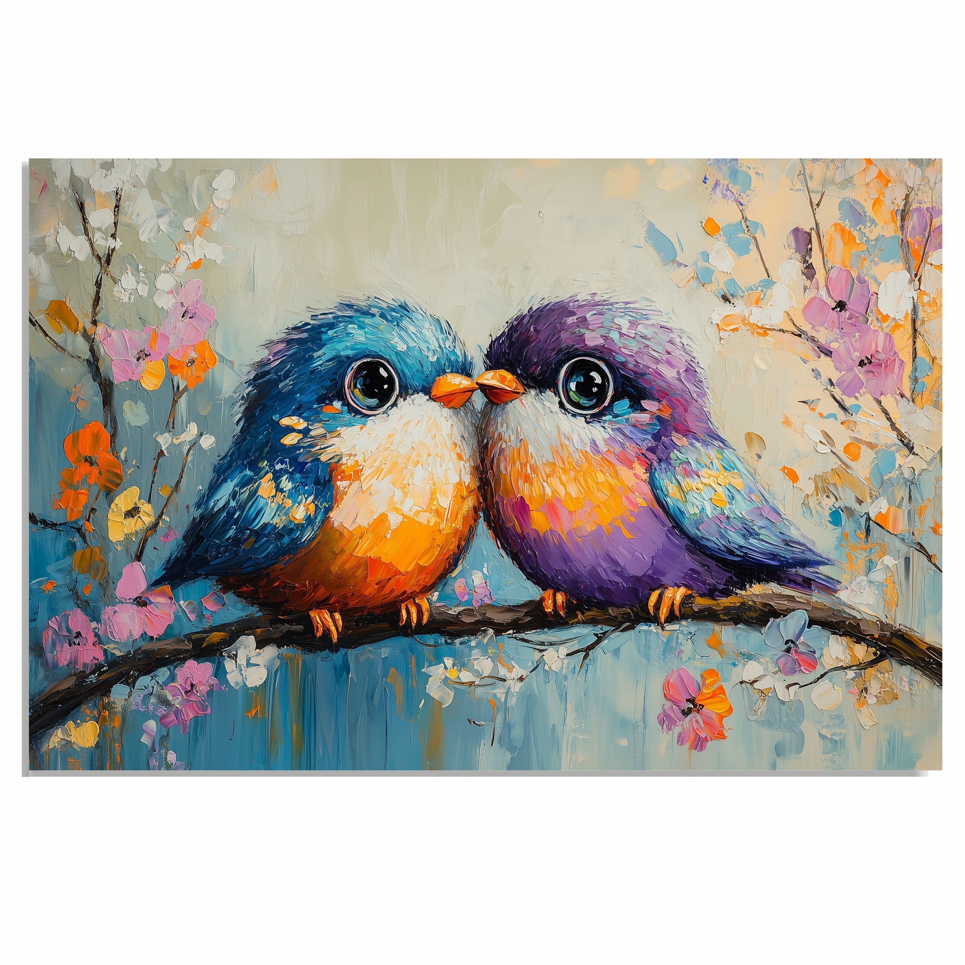 This heartwarming painting features two adorable plump birds touching beaks on a blossoming branch, surrounded by vibrant spring flowers. Their bright feathers, expressive eyes, and charming pose create a joyful and romantic mood. A perfect piece for bird lovers or anyone who appreciates playful, nature-inspired art.