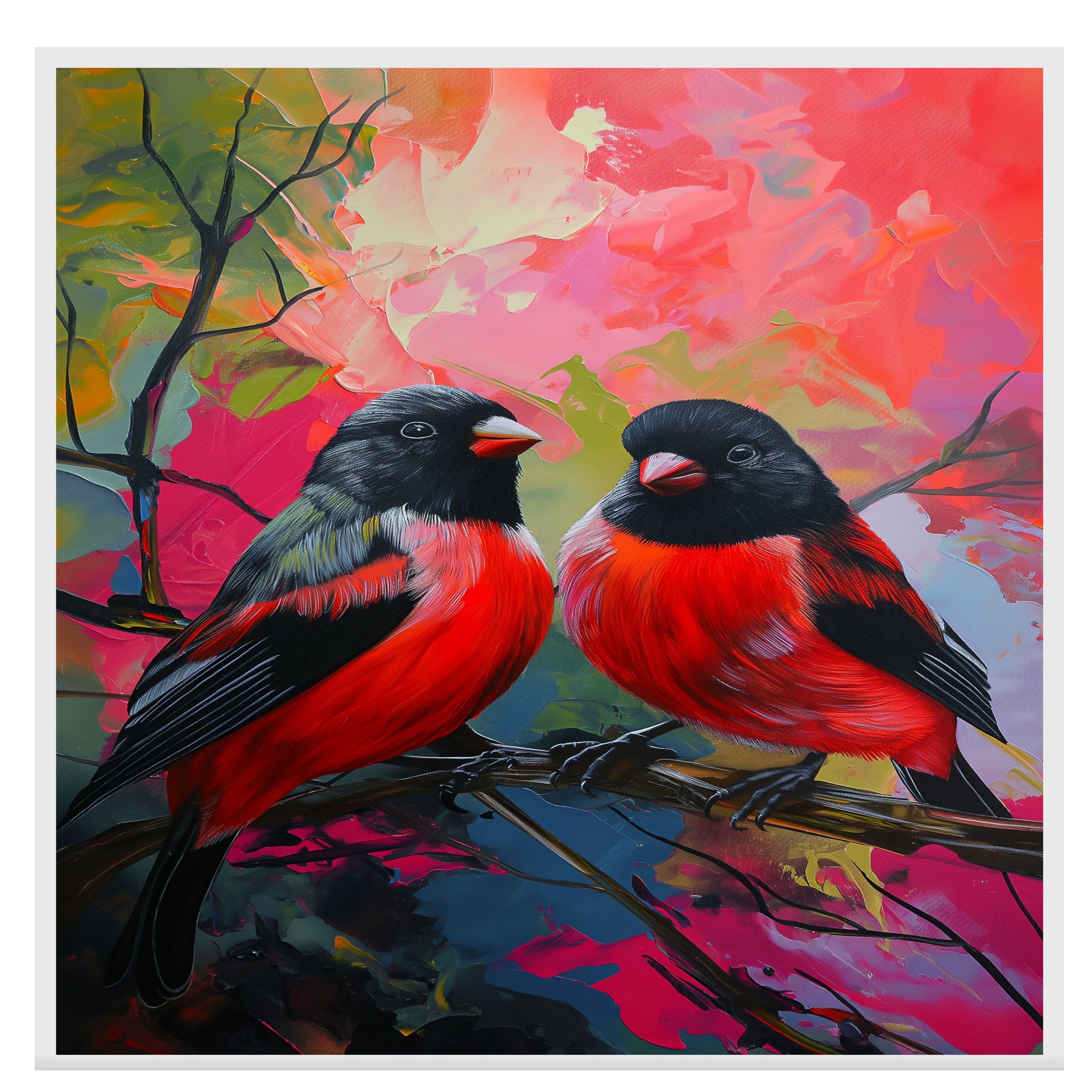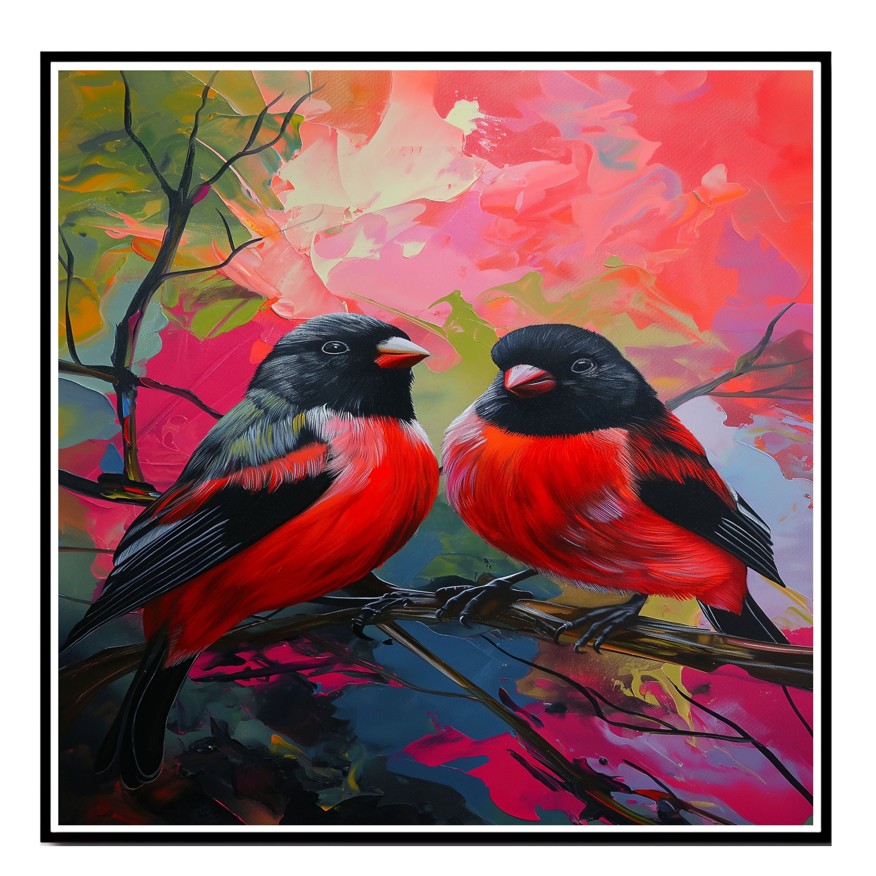 Infuse your space with energy and contrast through this stunning painting featuring a pair of red and black birds against a vivid abstract nature-inspired background. The bold colors and artistic strokes create a striking composition that blends modern expression with the beauty of wildlife. Perfect for adding a pop of vibrant character to any setting or as a thoughtful gift for bird and art enthusiasts.