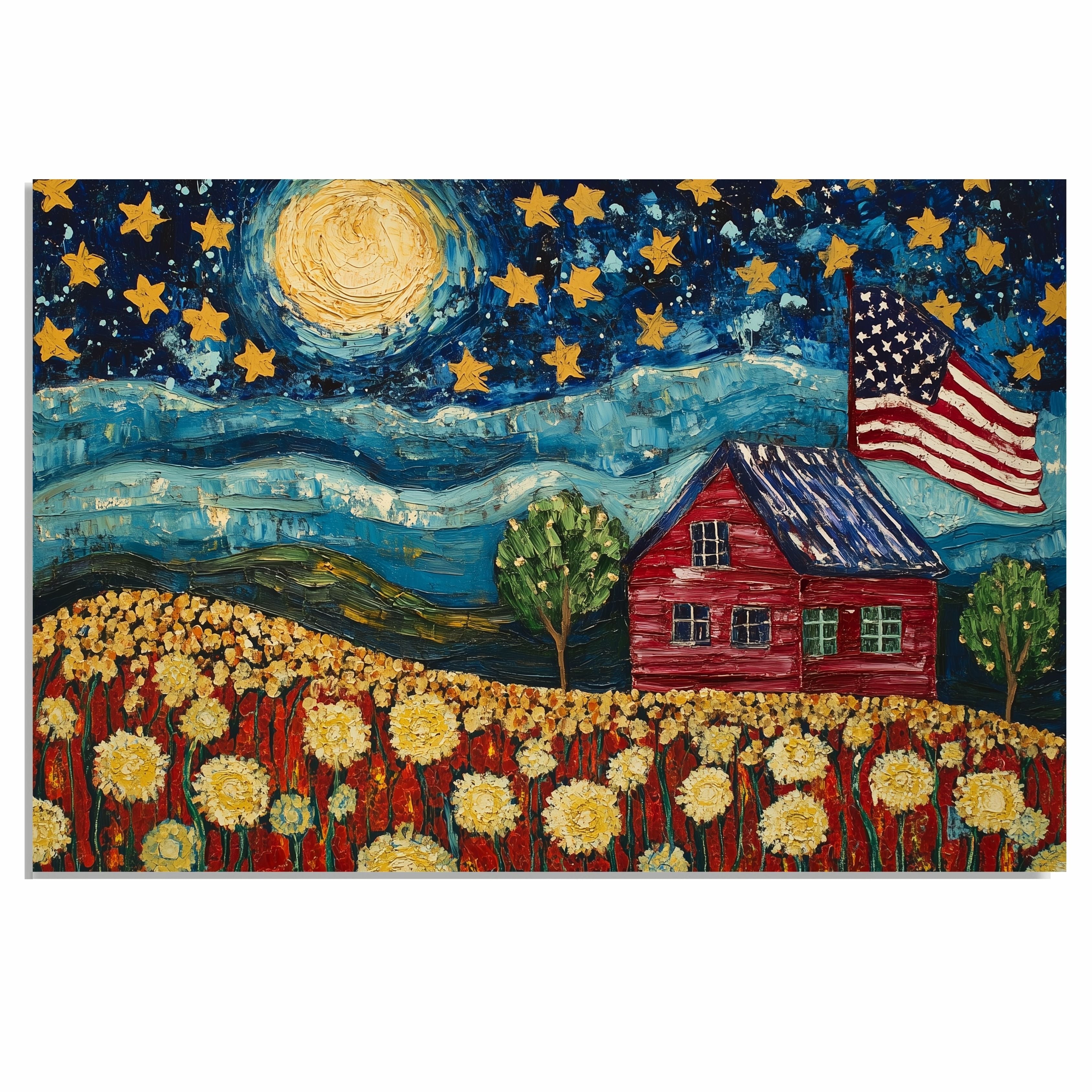 Patriotic Farmhouse Under Starry Sky with American Flag and Flower Field, Folk Art Style 4th of July Scene in Bold Colors and Textured Brushstrokes on Ready to Hang 1.5" Thick Canvas Wrap, Floating Framed Canvas, Flat Rolled Canvas
