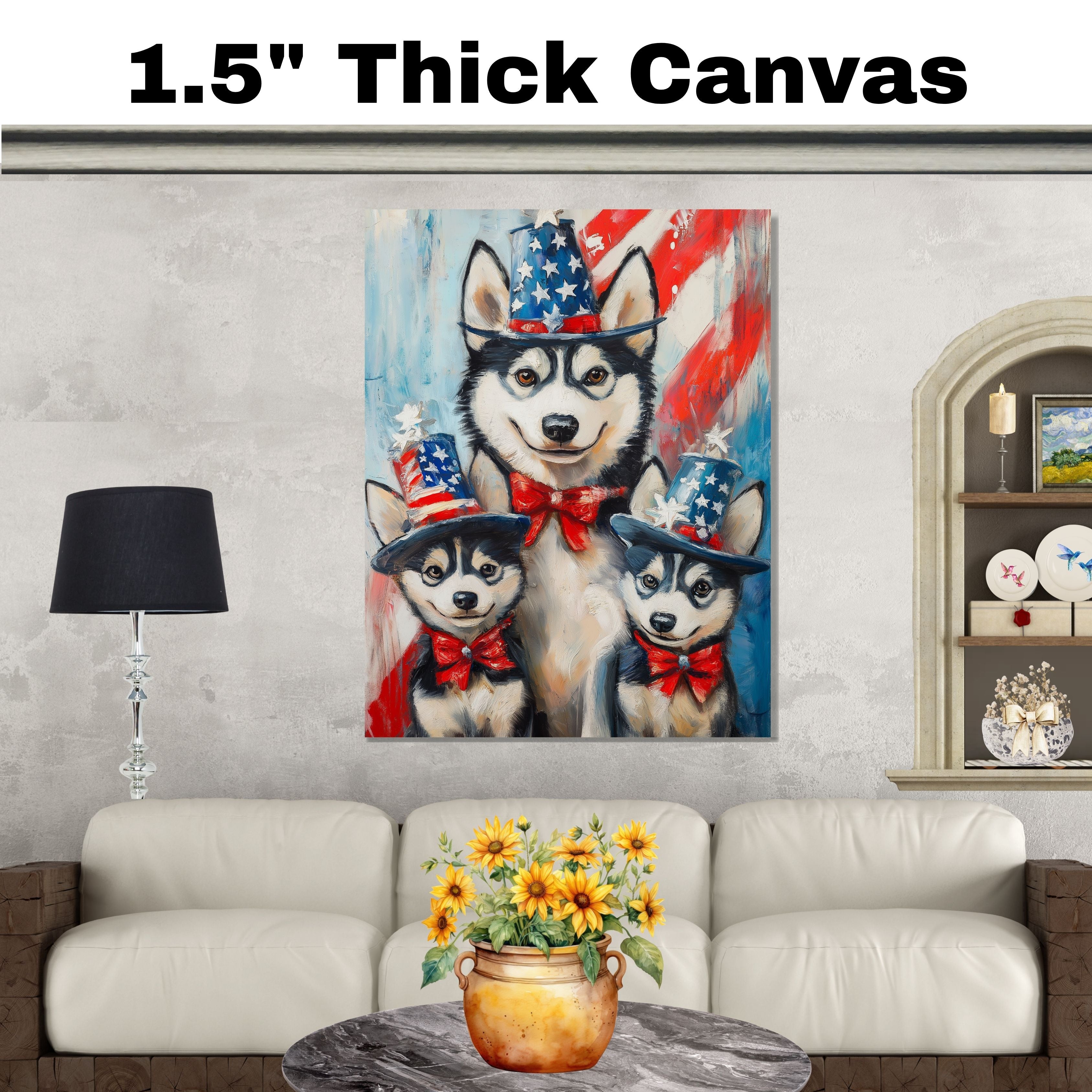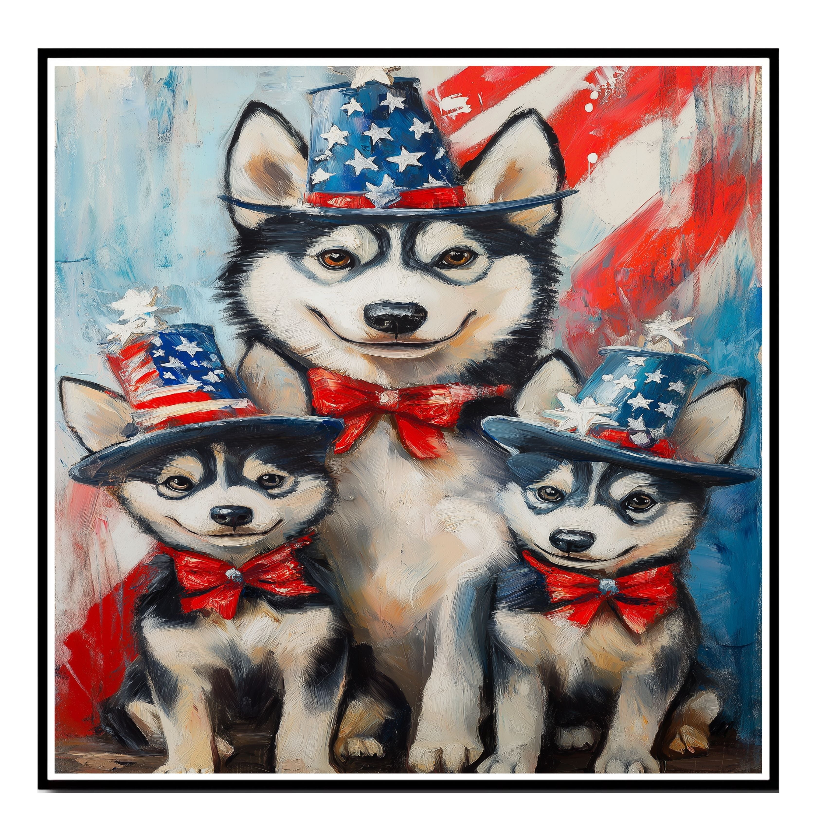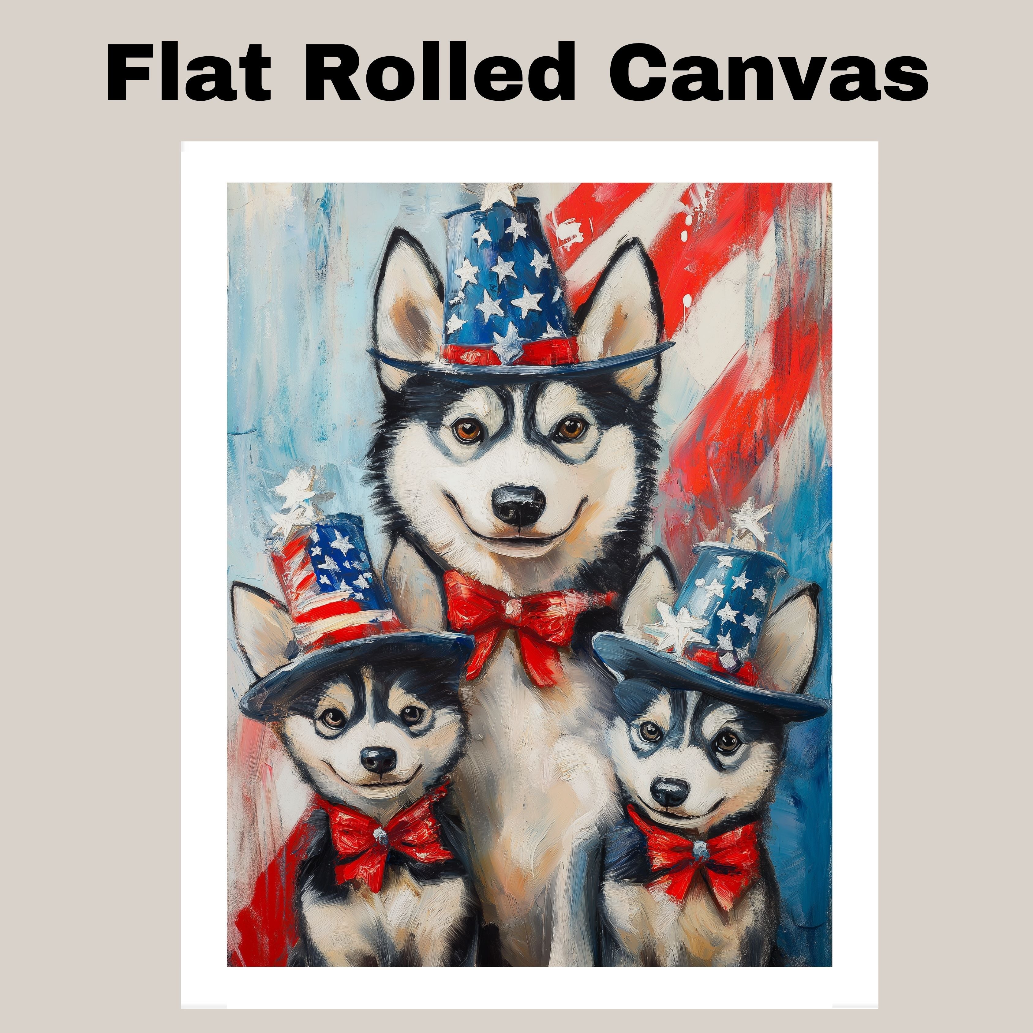 Our "Patriotic Paws" Canvas beautifully celebrates American pride and the unbreakable bond of family, featuring a devoted Siberian Husky mom with her two puppies nestled beneath the stars and stripes. Bathed in the soft glow of patriotism, this heartwarming painting evokes a sense of loyalty, strength, and love for country. The rich colors of the American flag drape the background, symbolizing unity and devotion. Available on a 1.5" thick canvas wrap, floating framed canvas, or as a flat rolled canvas, this striking artwork is a perfect tribute to Husky lovers and proud patriots alike.