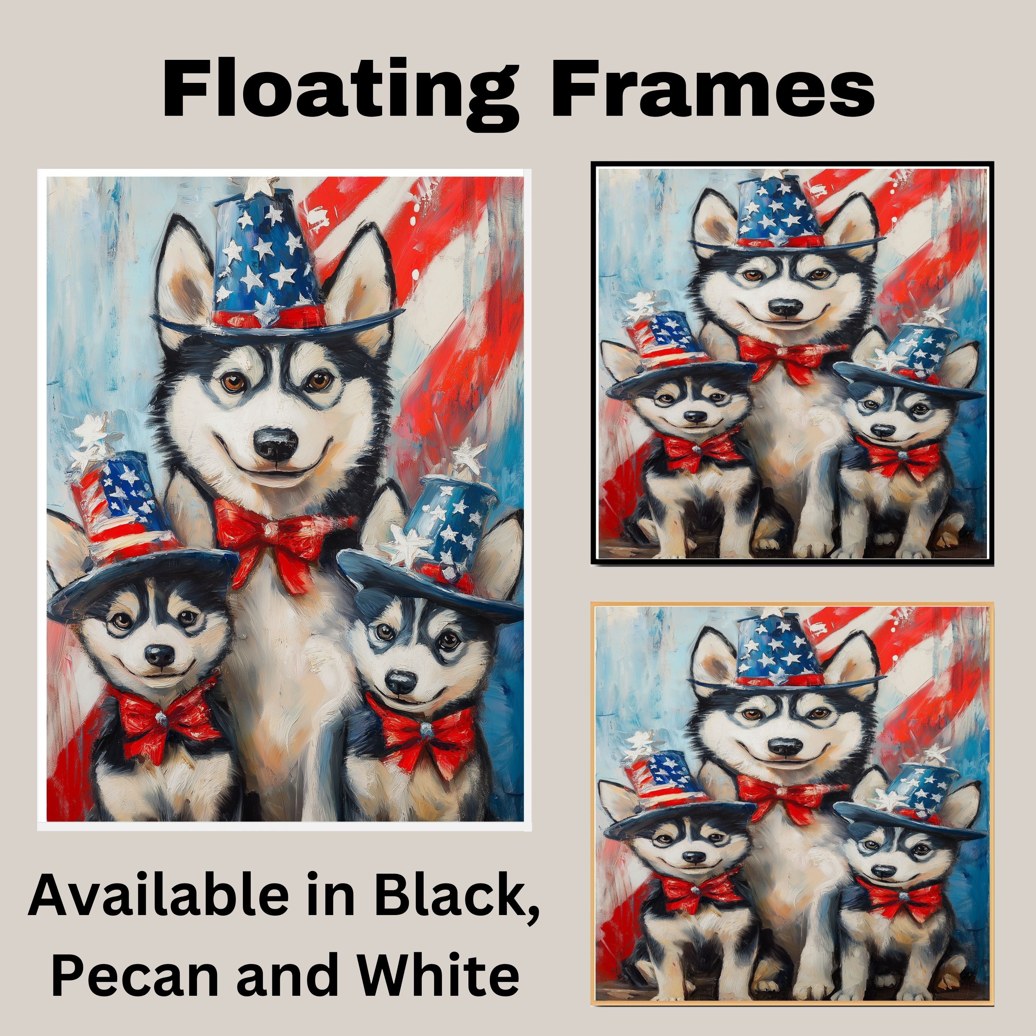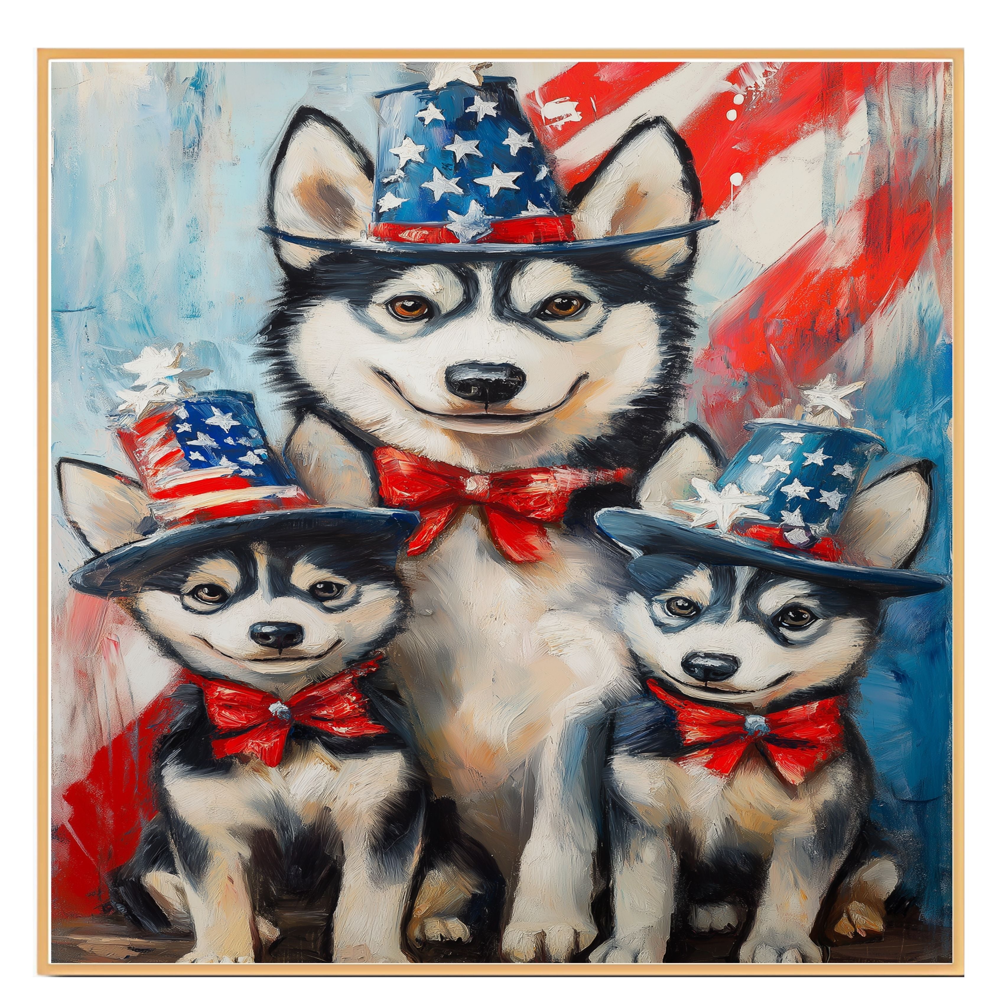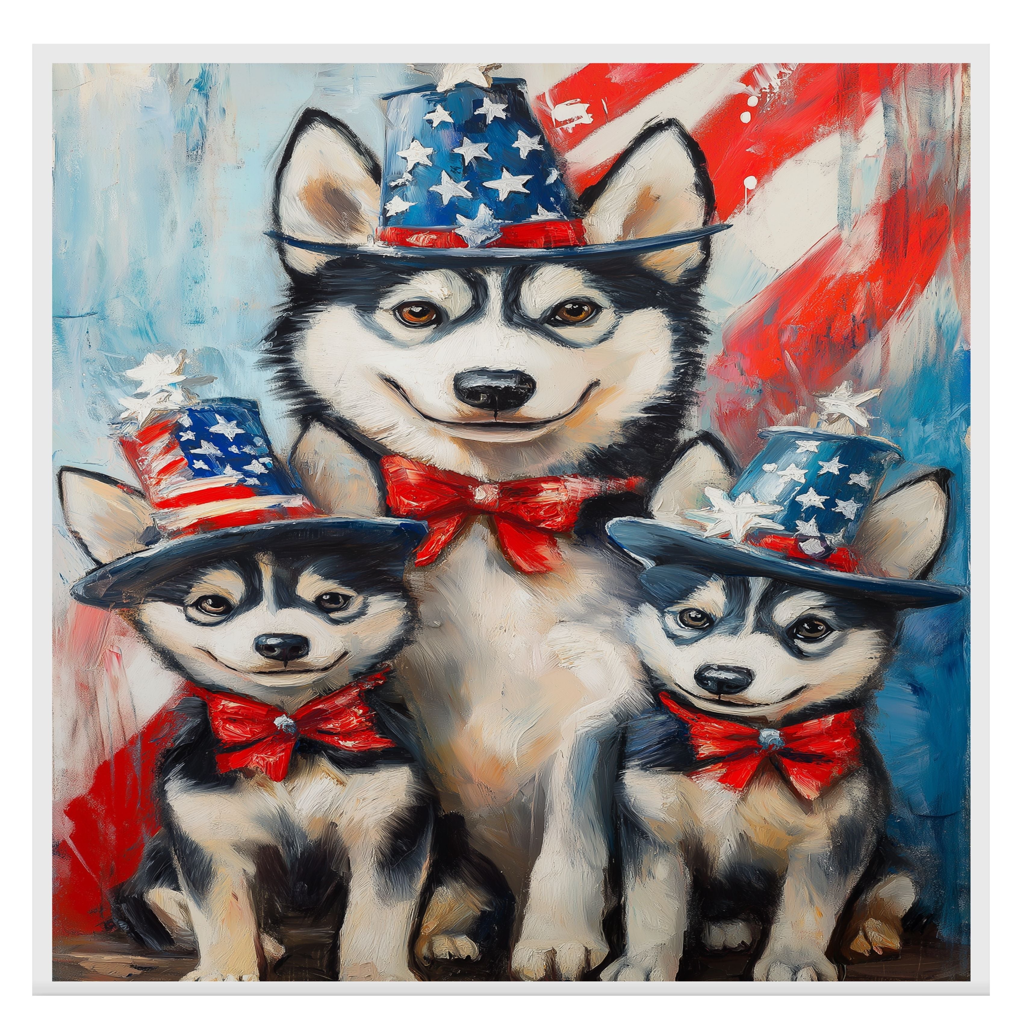 Our "Patriotic Paws" Canvas beautifully celebrates American pride and the unbreakable bond of family, featuring a devoted Siberian Husky mom with her two puppies nestled beneath the stars and stripes. Bathed in the soft glow of patriotism, this heartwarming painting evokes a sense of loyalty, strength, and love for country. The rich colors of the American flag drape the background, symbolizing unity and devotion. Available on a 1.5" thick canvas wrap, floating framed canvas, or as a flat rolled canvas, this striking artwork is a perfect tribute to Husky lovers and proud patriots alike.