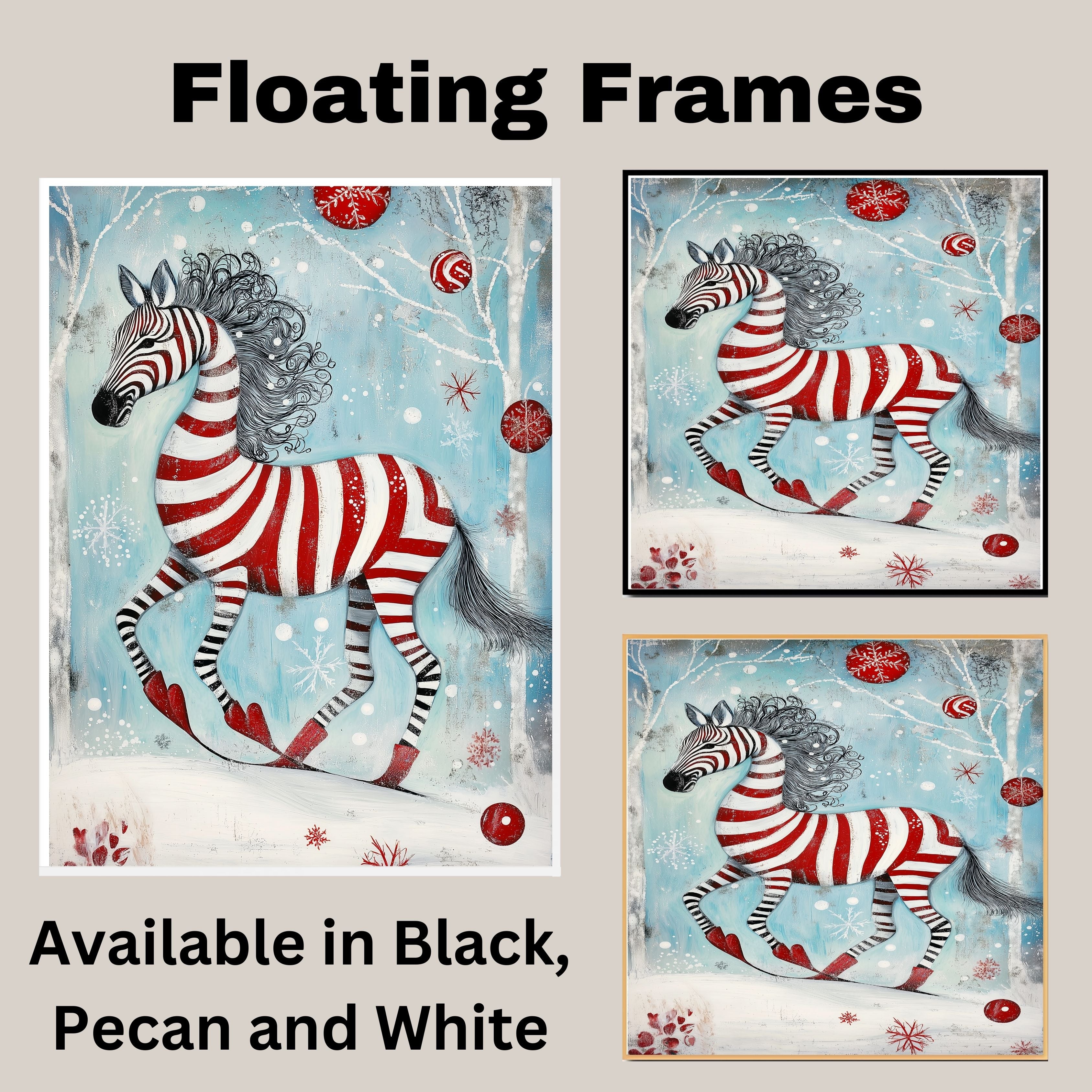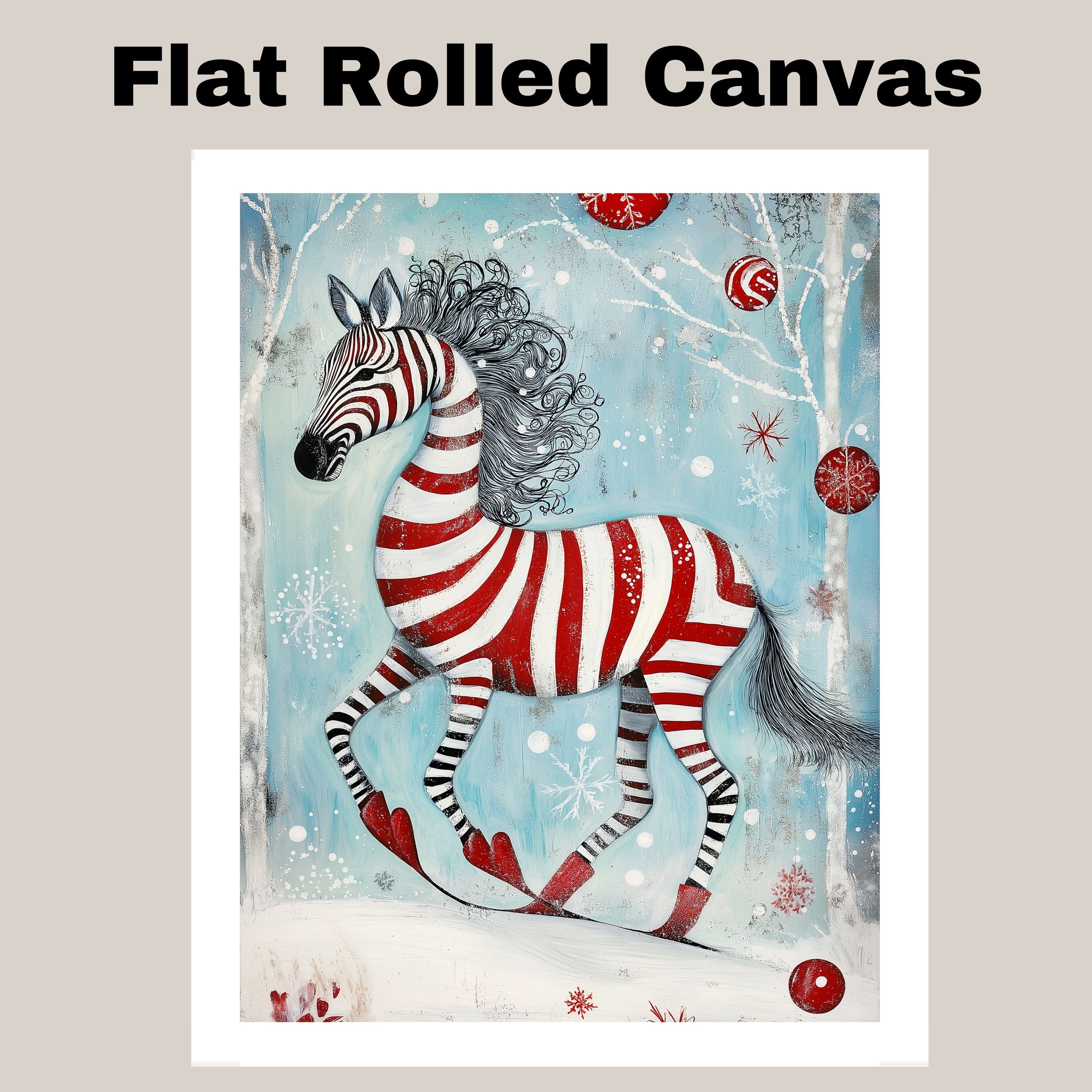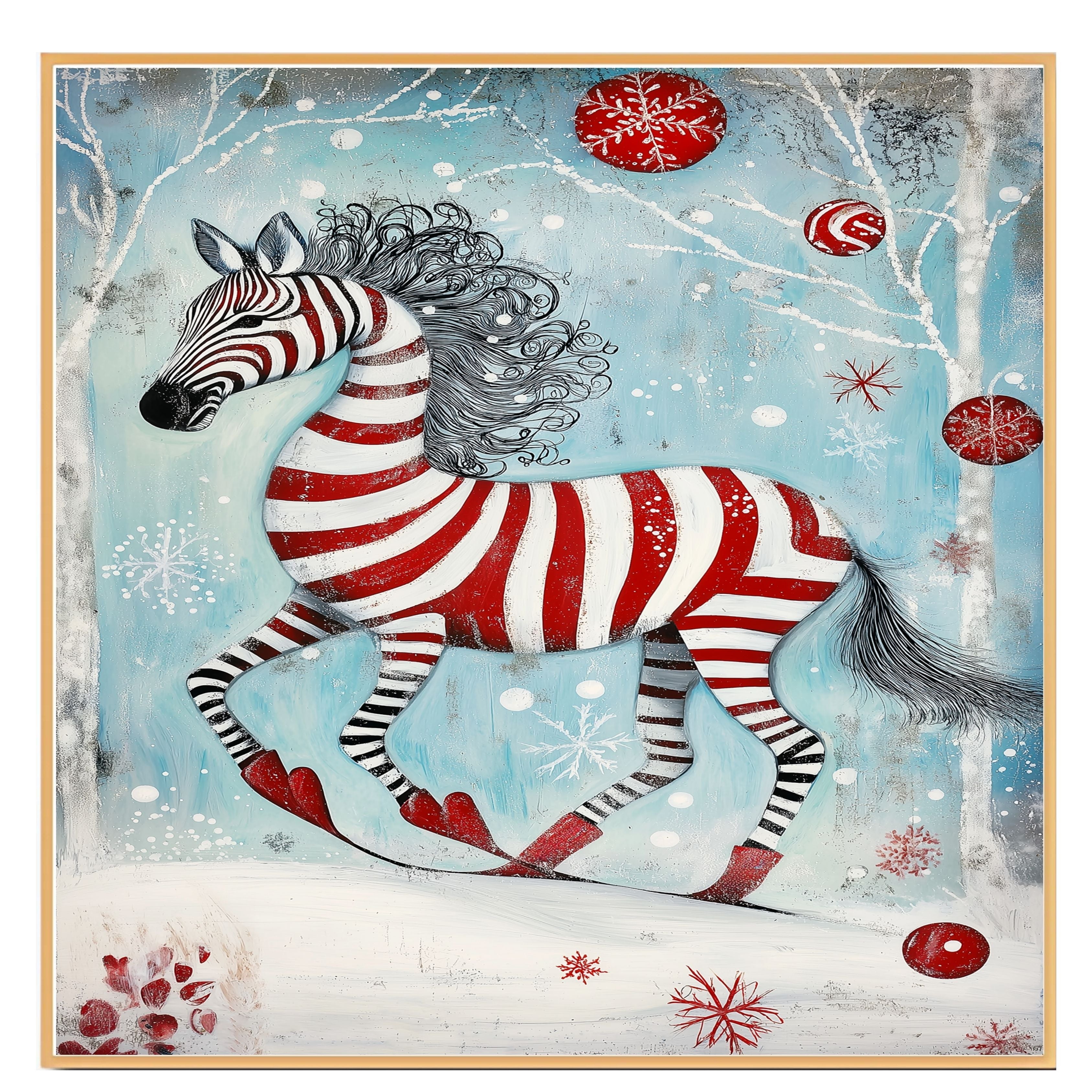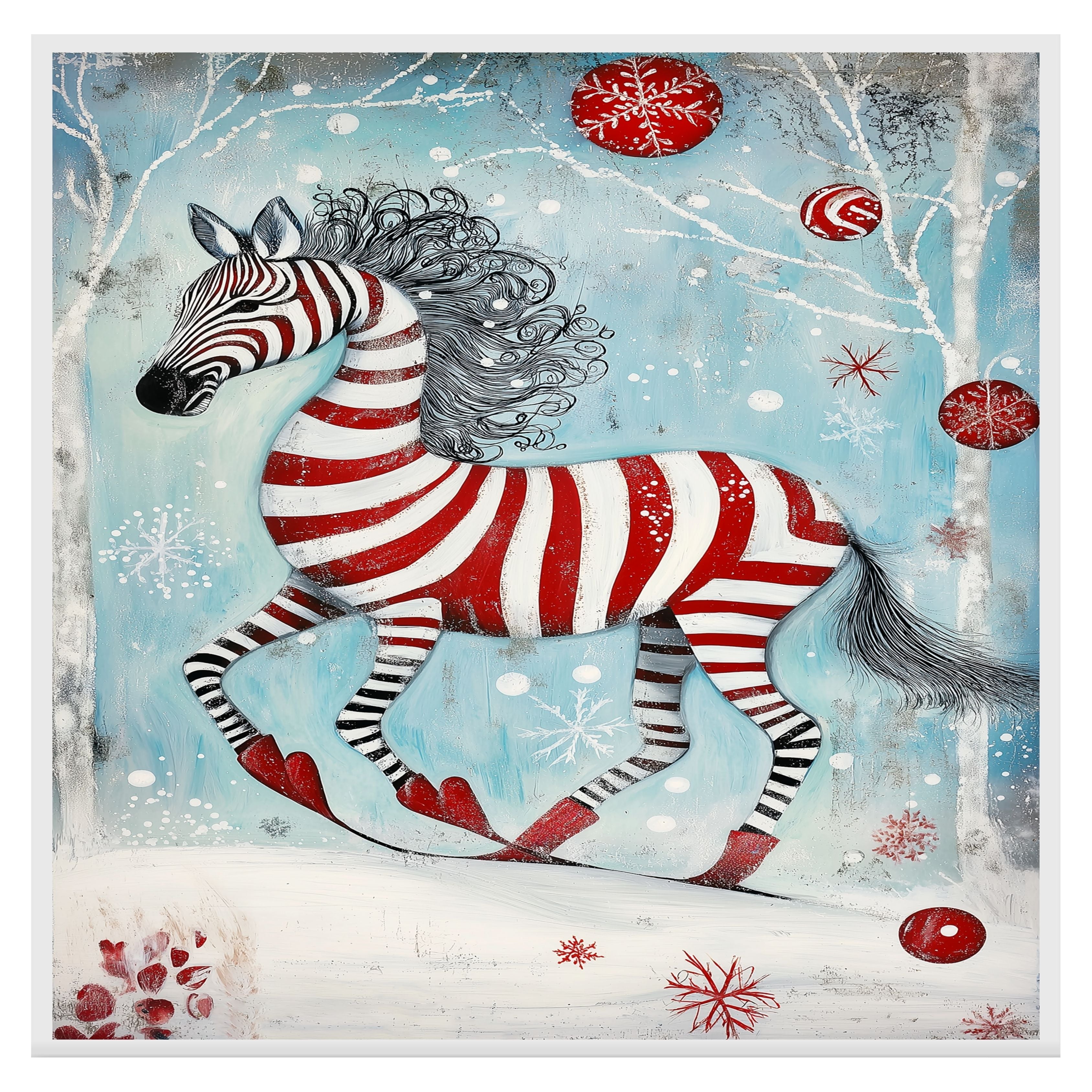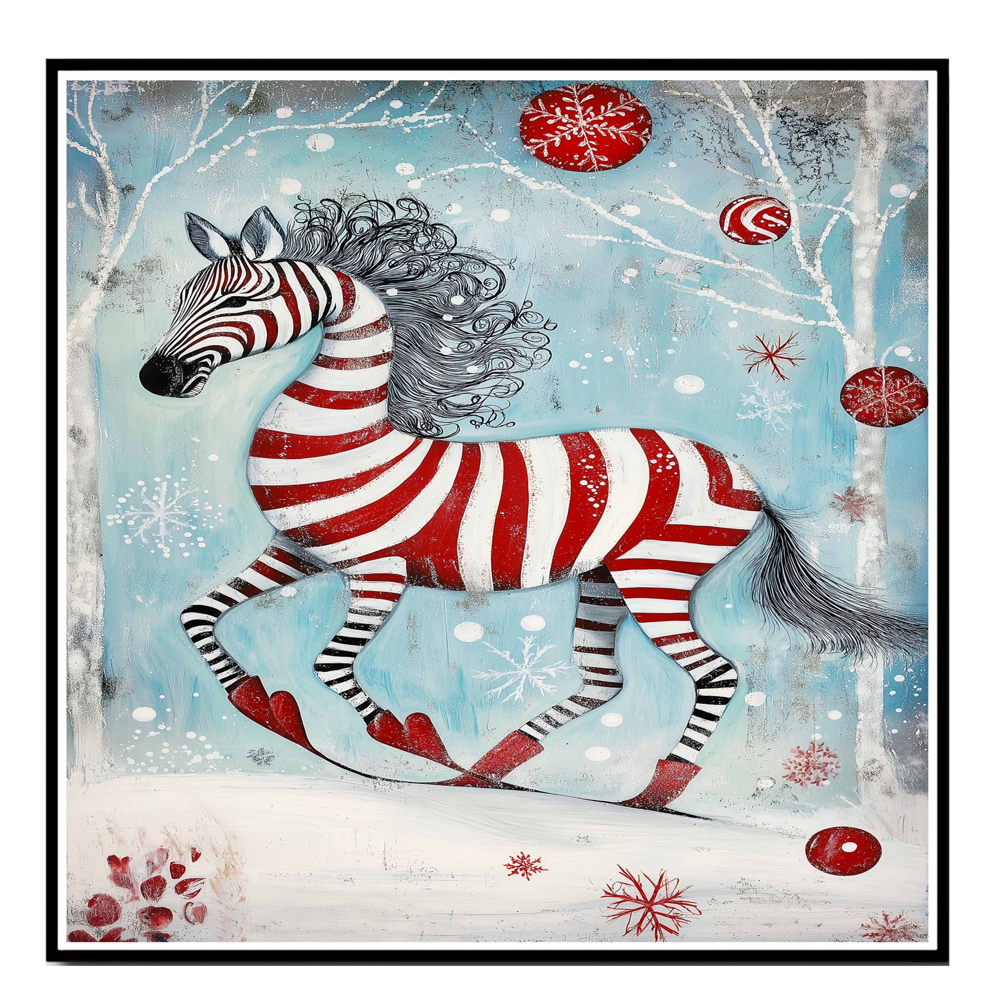 This delightfully whimsical artwork features a zebra with candy cane stripes gliding gracefully through a magical snowy...
