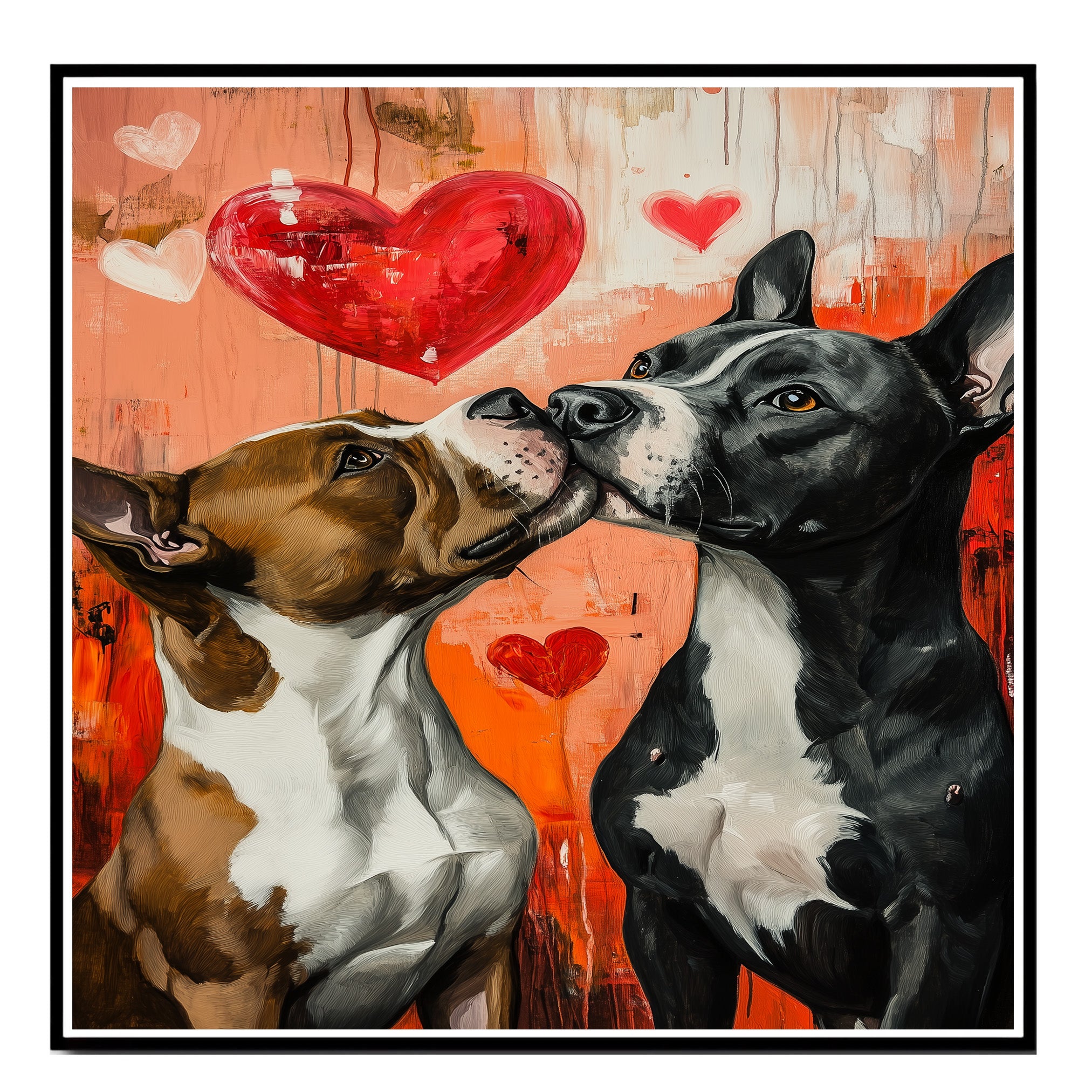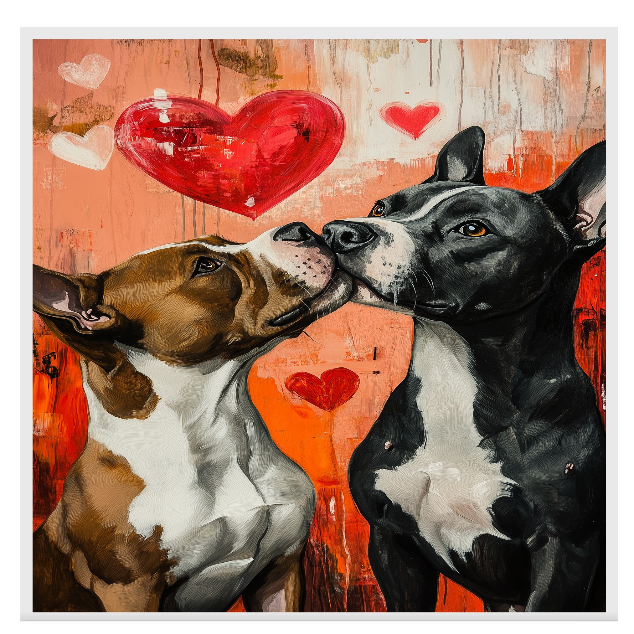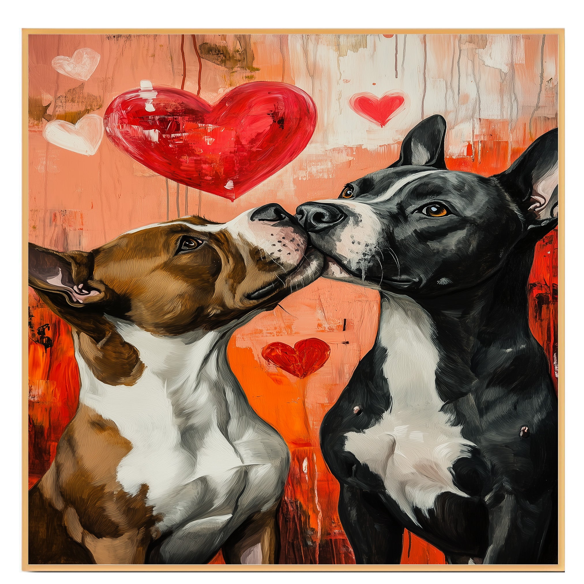 Celebrate unconditional love and playful companionship with this adorable painting of a Pitbull dog couple sharing a sweet moment under a vibrant heart-filled sky. With lively brushstrokes, warm colors, and heartwarming expressions, this artwork adds cozy rustic charm to any space. Ideal for pet lovers, country homes, and special gifts.