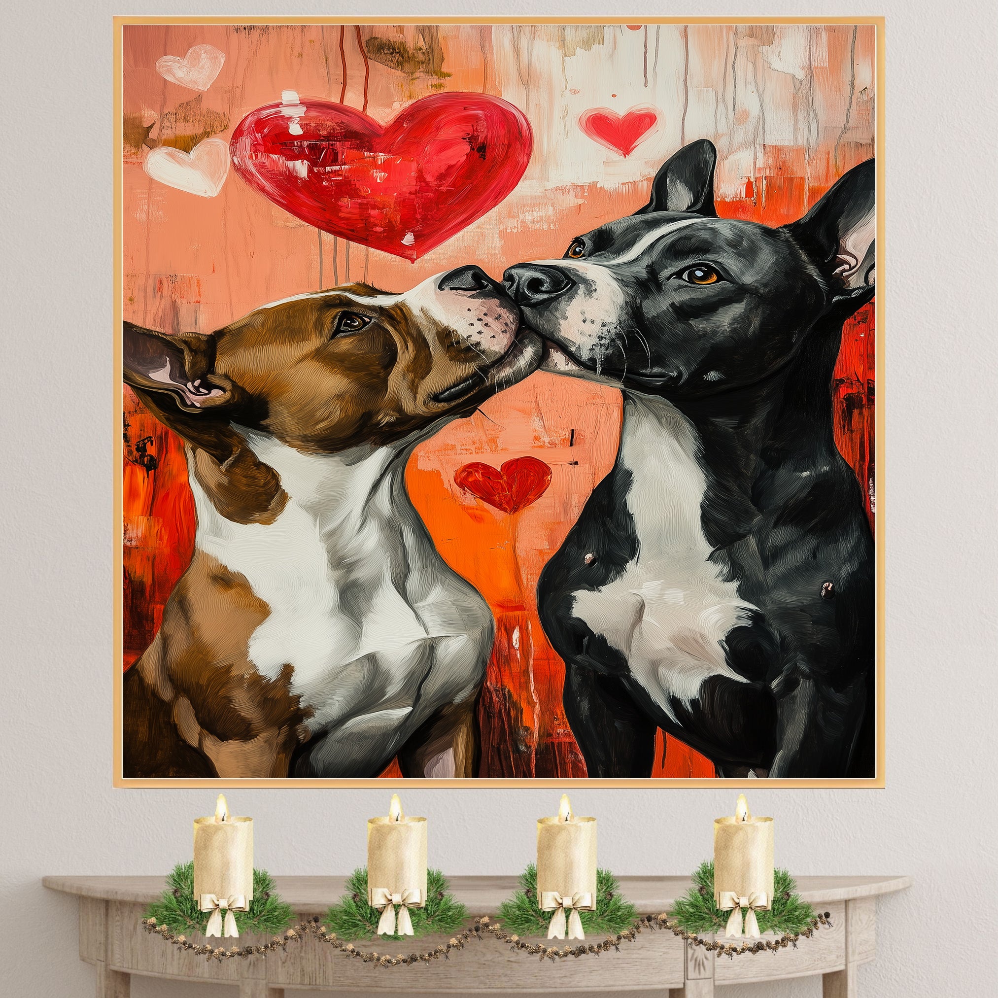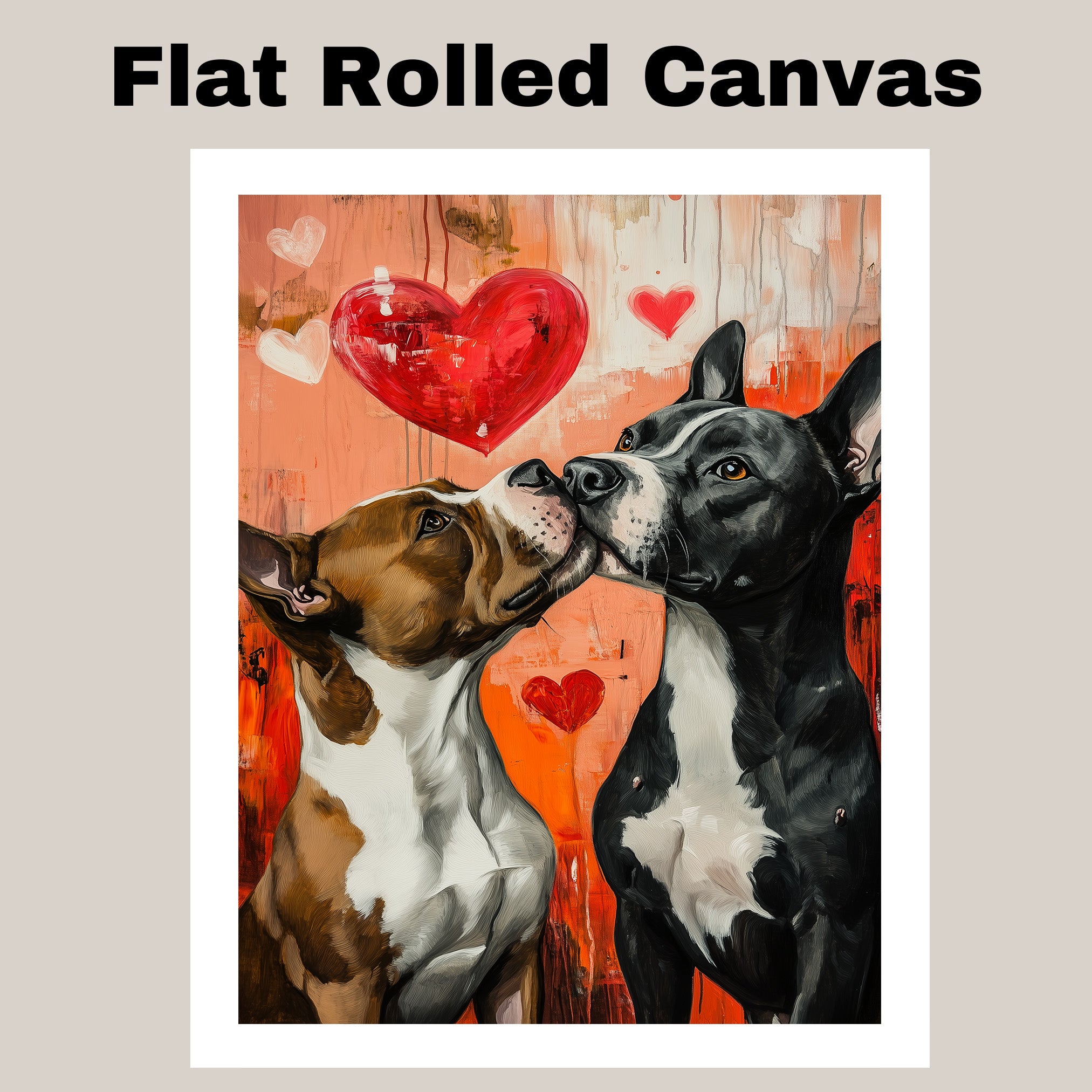 Pitbull Dog Couple Kissing with Hearts Playful Romantic Artwork for Dog Lovers and Cozy Rustic Decor on Ready to Hang 1.5" Thick Canvas Wrap, Floating Framed Canvas, Flat Rolled Canvas