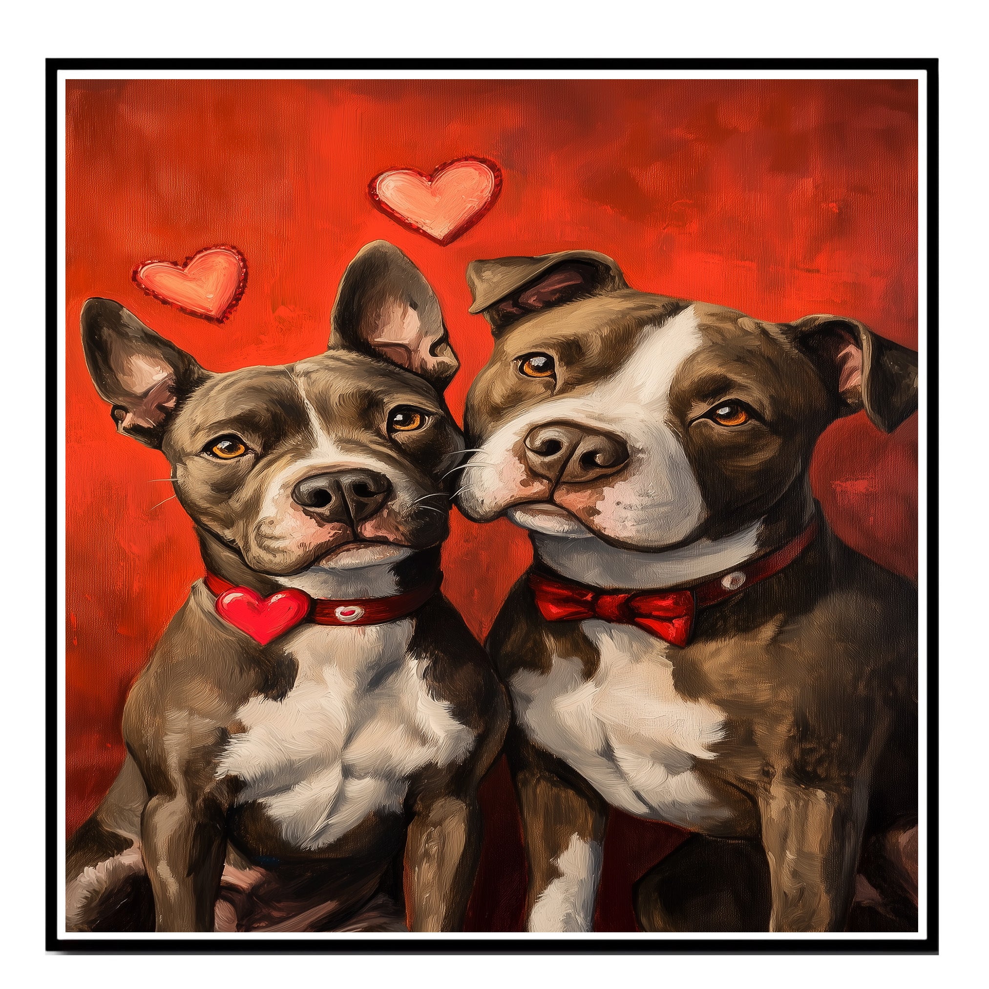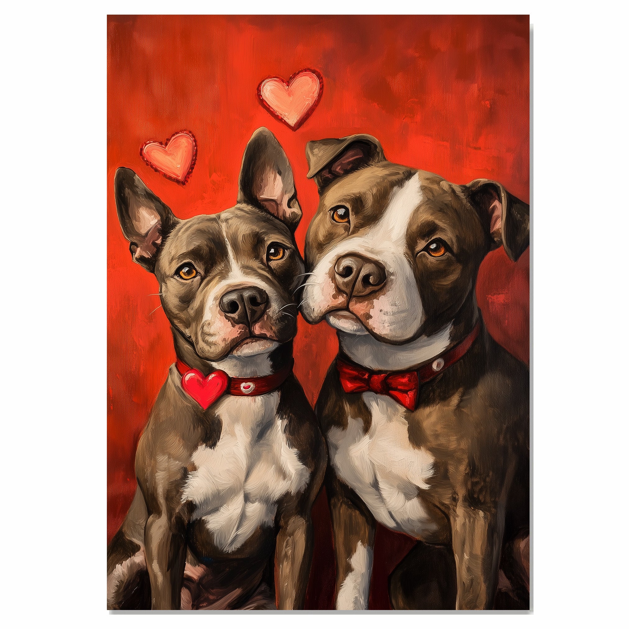 Celebrate loyalty, strength, and love with this charming painting featuring a Pitbull couple against a bold red background with floating hearts. With expressive details and warm tones, this artwork adds a cozy, affectionate touch to any space. Perfect for dog lovers, rustic homes, or heartfelt gift occasions.
