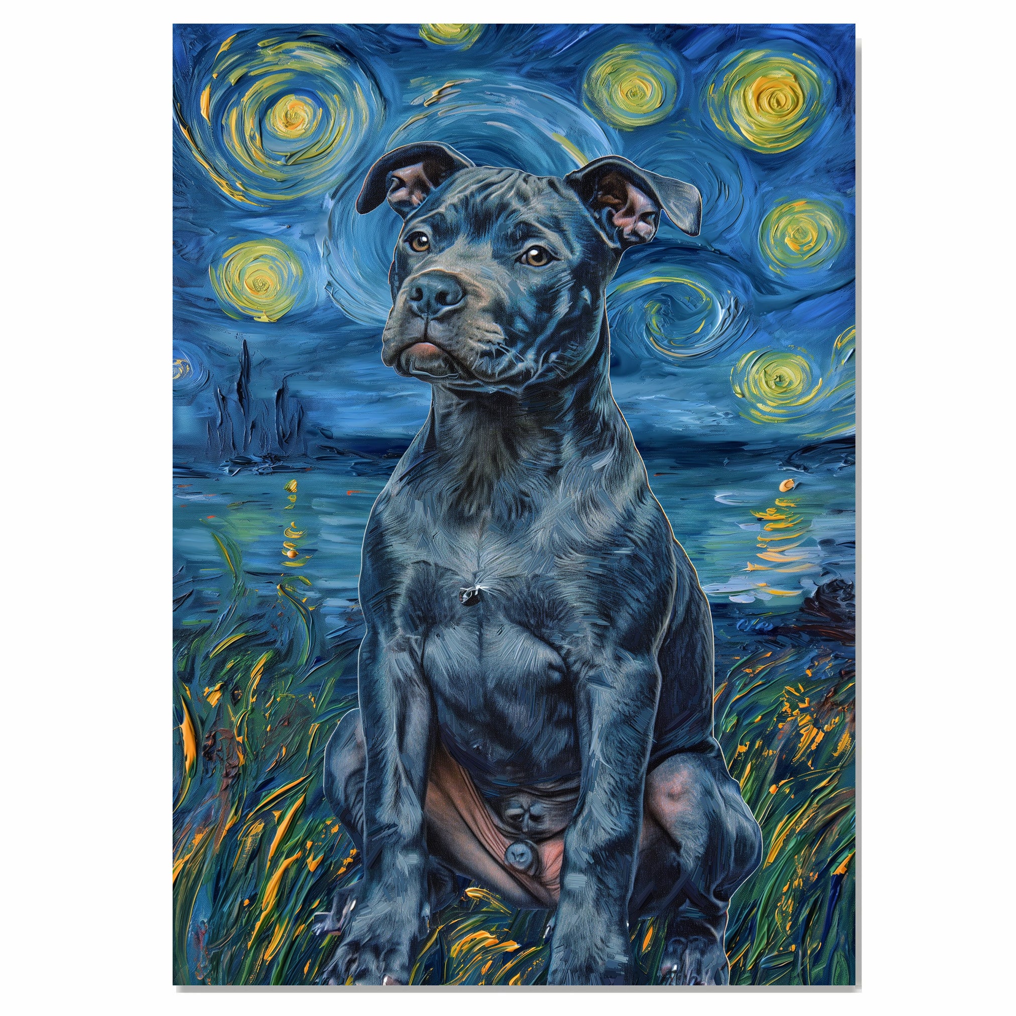 This striking Pitbull portrait blends muscular elegance with artistic emotion through Van Gogh’s iconic Starry Night style. The dark, glossy coat of the dog contrasts powerfully with the swirling night sky and moonlit reflections, highlighting strength, loyalty, and beauty. A stunning visual for Pitbull fans, art collectors, or anyone who loves dramatic, impressionist-inspired animal portraits.