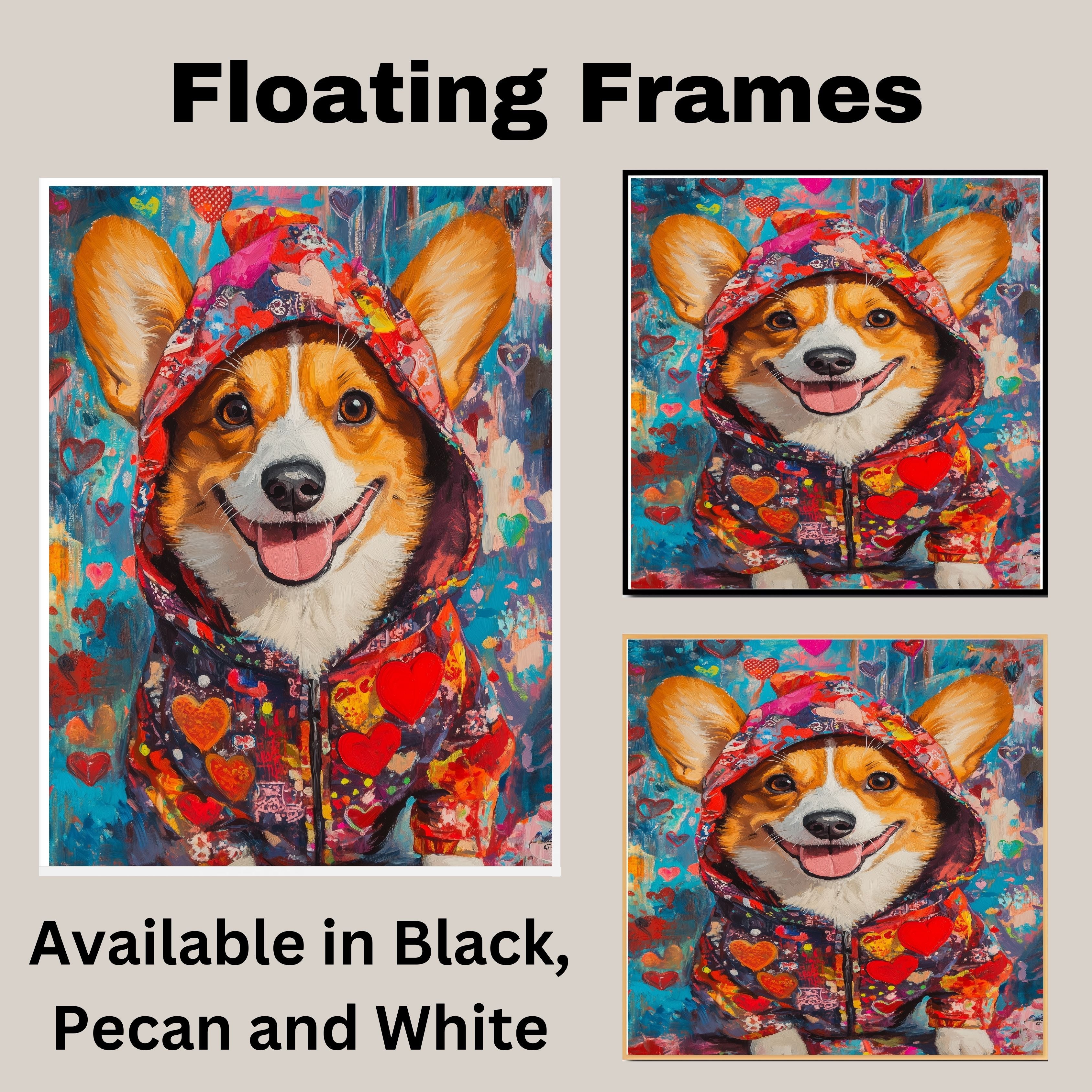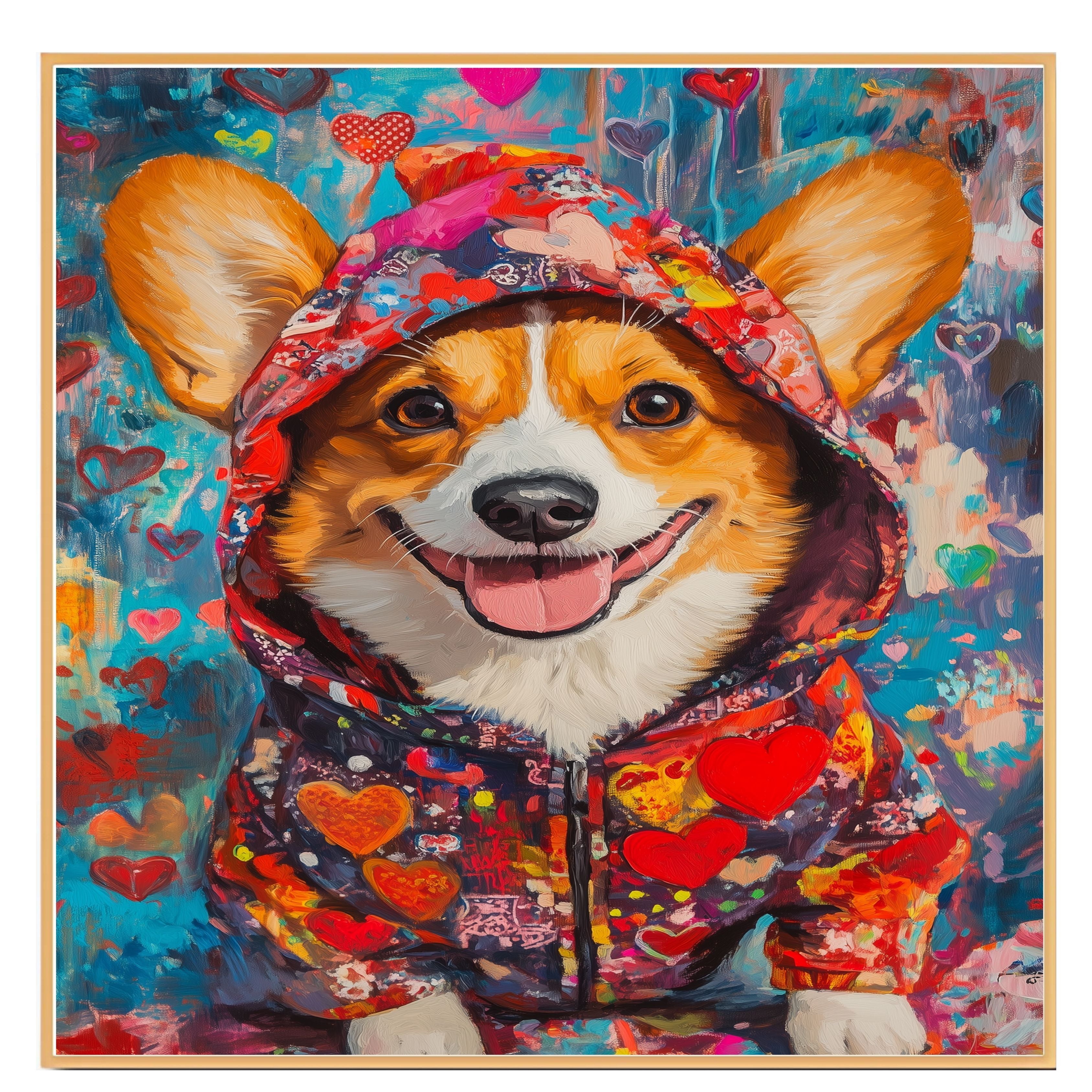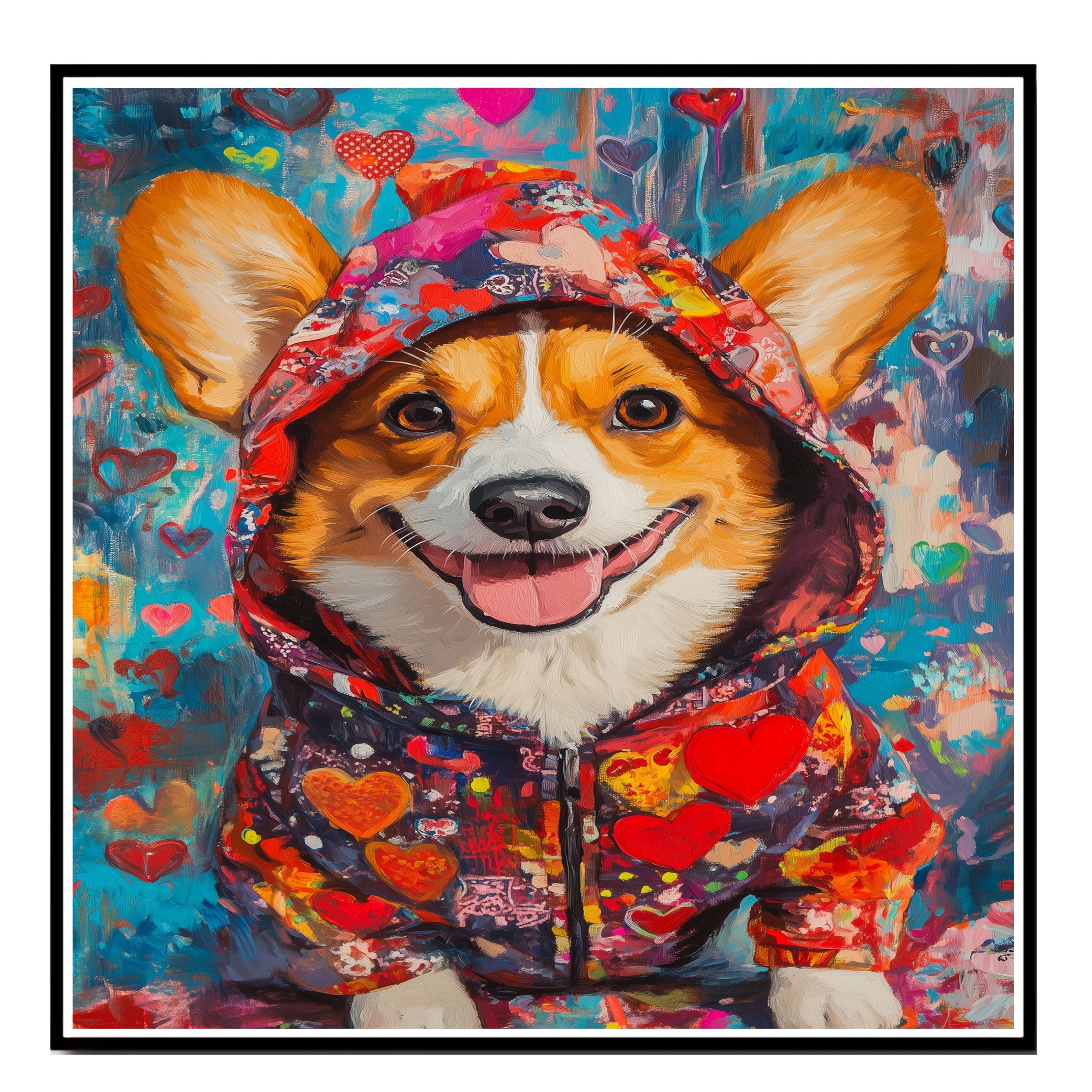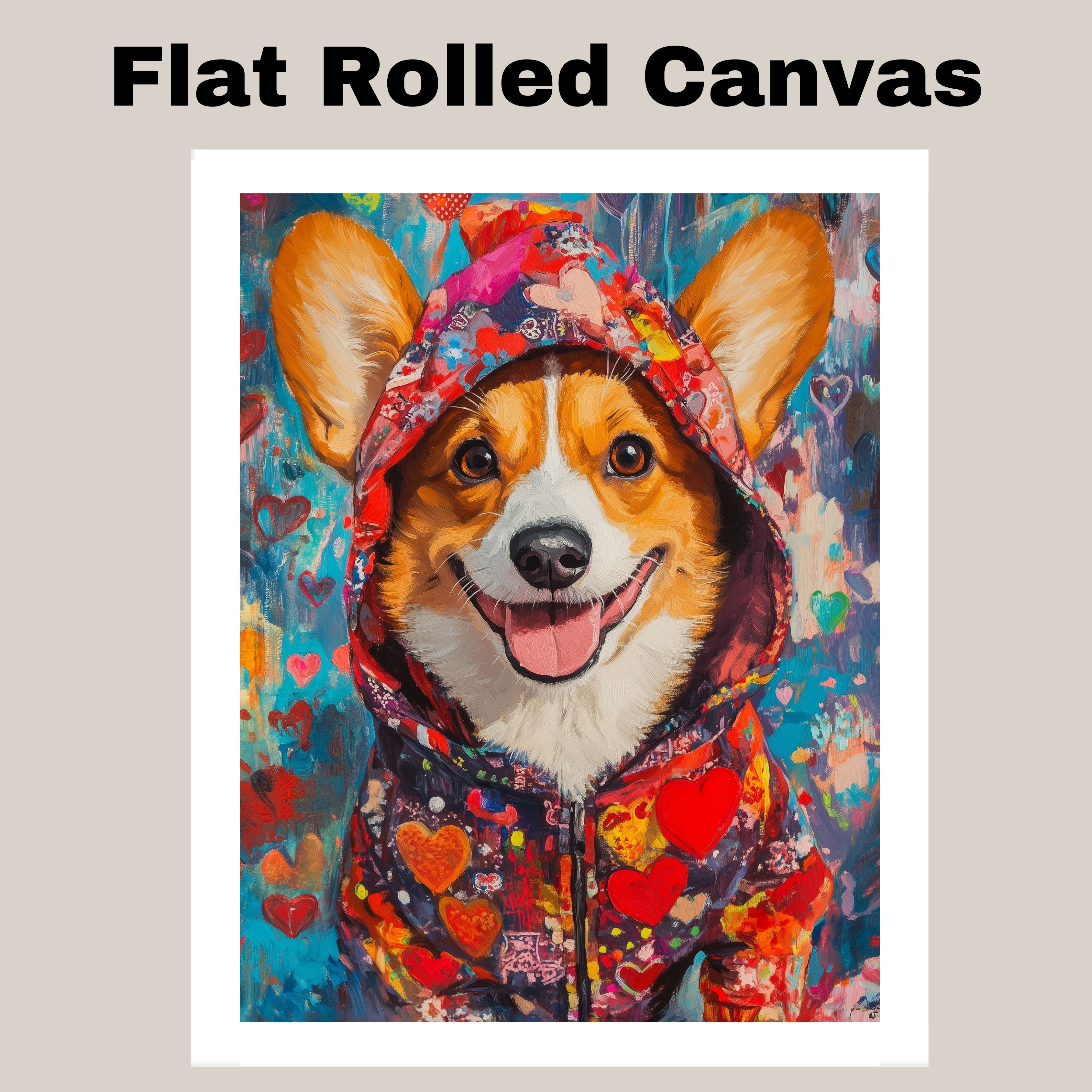 Our "Playful Affection" Canvas radiates charm and warmth, featuring an endearing Corgi wrapped in a vibrant heart-patterned hoodie, exuding joy and unconditional love. Set against a whimsical backdrop, this delightful painting captures the essence of affection and playfulness, making it a perfect addition to your home decor. The expressive eyes and cheerful stance of the Corgi bring a heartwarming touch, celebrating the special bond between pets and their humans. Available on a 1.5" thick canvas wrap, floating framed canvas, or as a flat rolled canvas, this lively artwork adds a splash of color and love to any space. A thoughtful gift for Corgi lovers and anyone who cherishes playful, heartfelt moments.