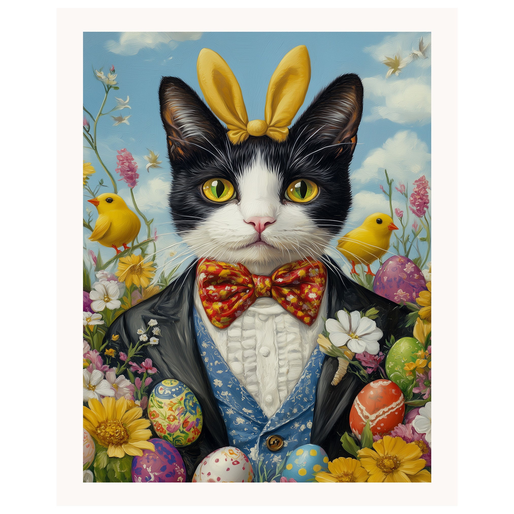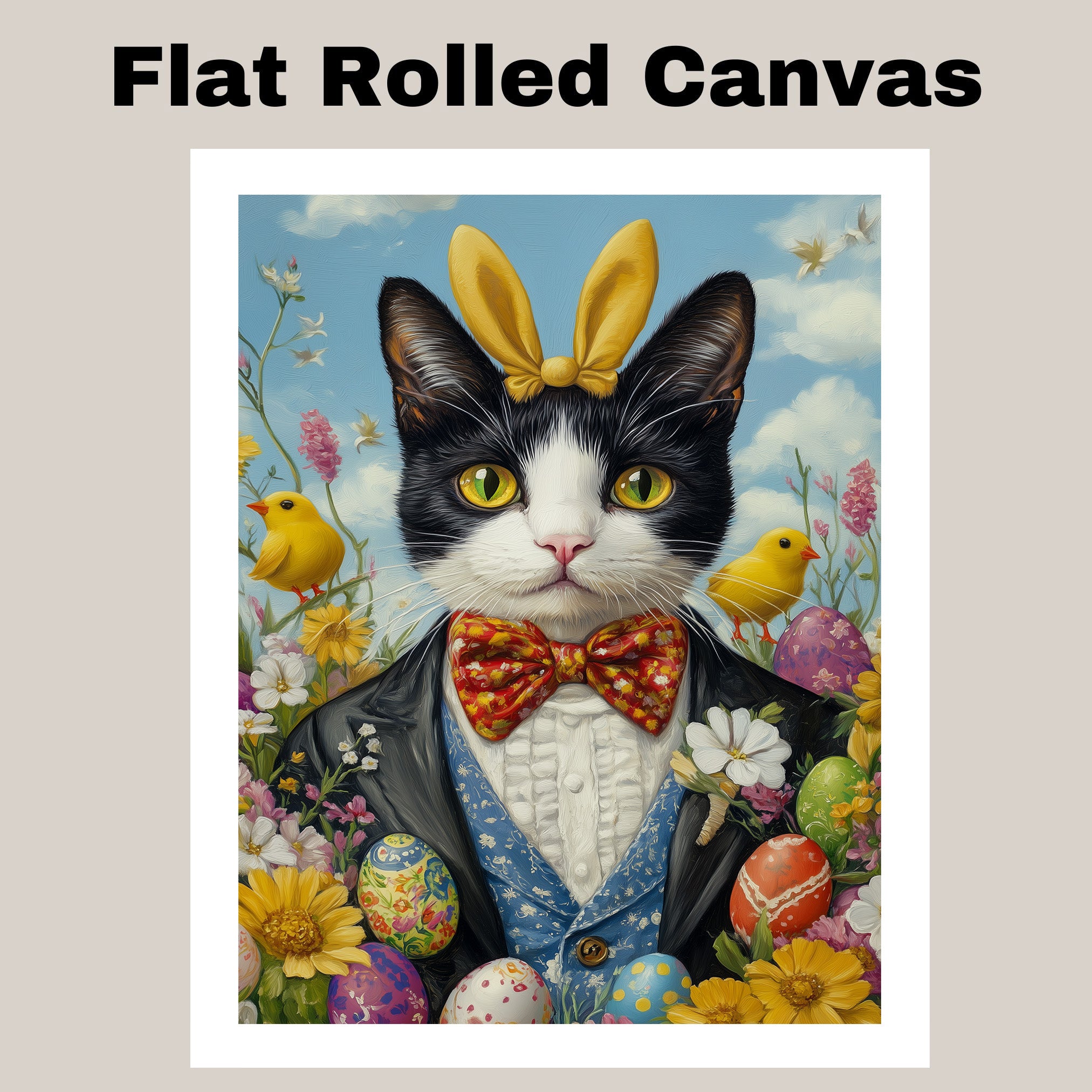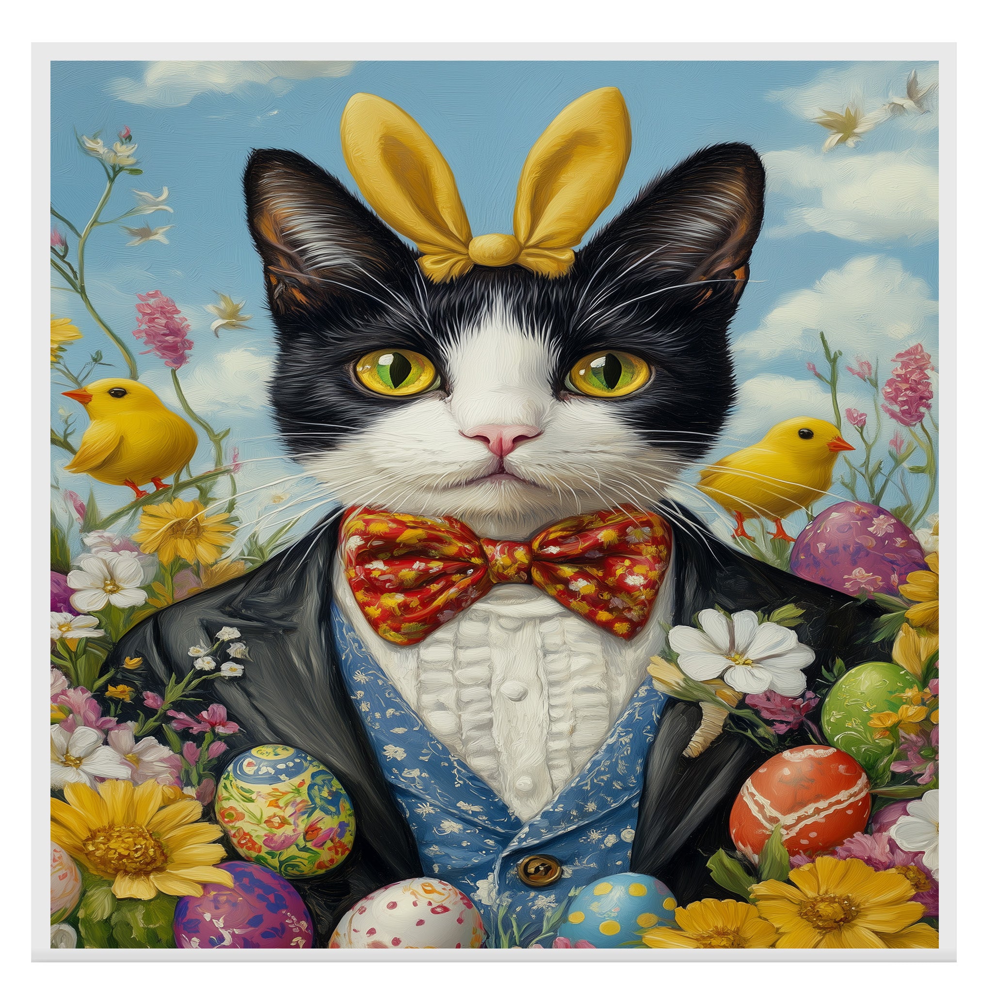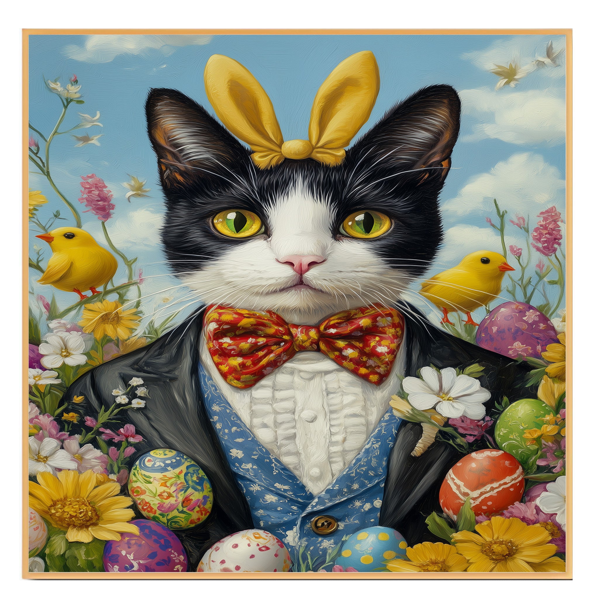Our Playful Charm Canvas showcases the festive spirit of Easter with a black and white tuxedo cat dressed in a vibrant holiday ensemble. With cheerful spring colors and whimsical details, this delightful artwork exudes warmth and joy, making it a perfect addition to your seasonal decor. The lively scene brings a touch of enchantment to any space, celebrating the magic of Easter with feline charm. Available on a 1.5" thick canvas wrap, floating framed canvas, or as a flat rolled canvas, this charming piece is a wonderful gift for cat lovers and holiday enthusiasts alike.