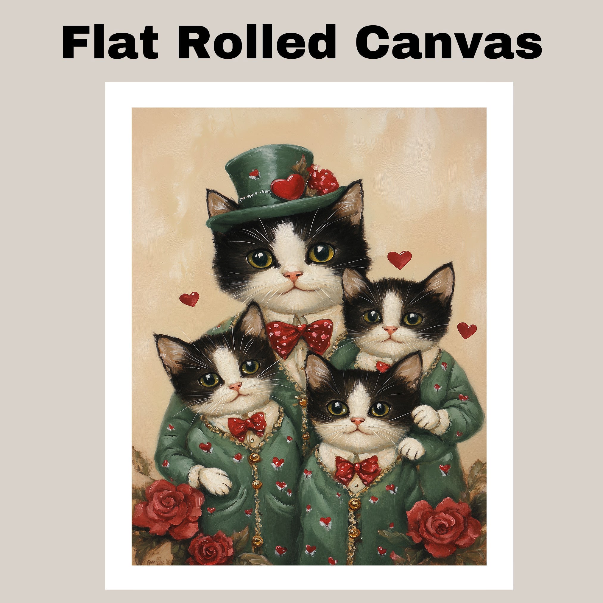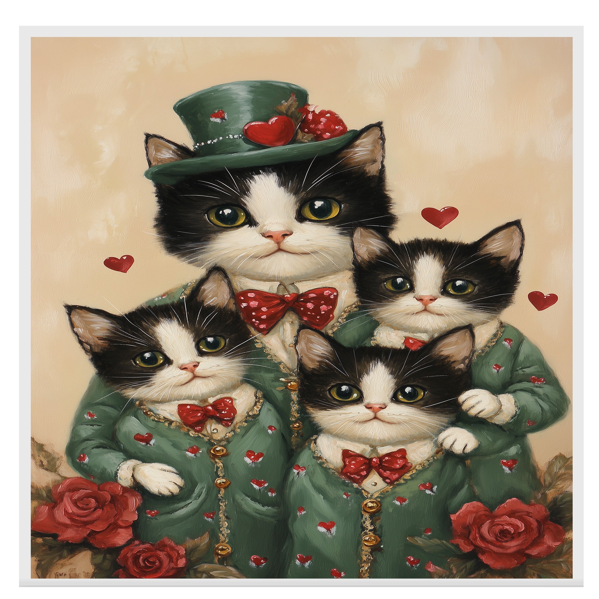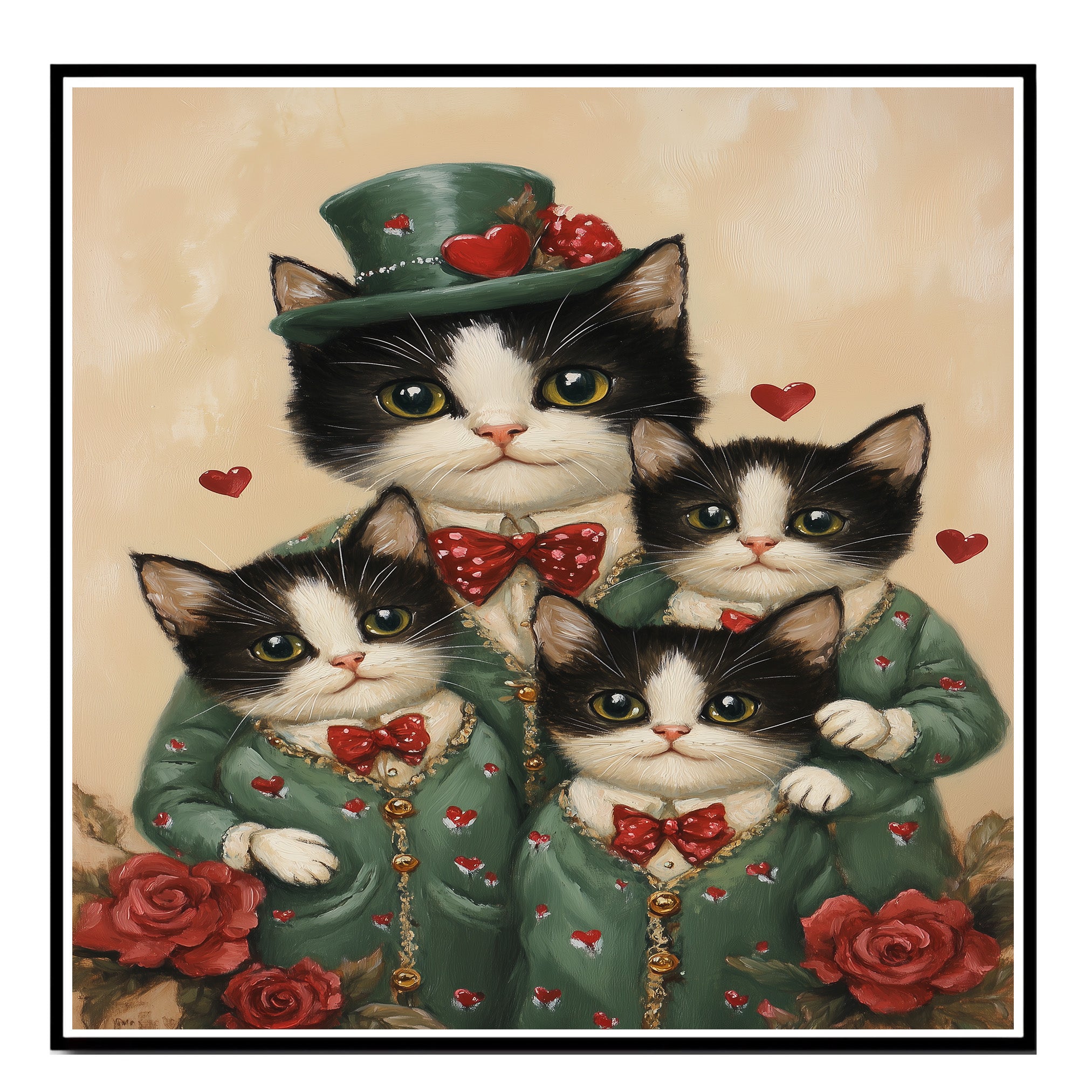 This endearing oil painting captures a tuxedo cat mother with her three kittens, all dressed in cozy green pajamas adorned with hearts, initials, and playful patterns. A heart on each chest and a matching beanie on the mother add charm to the warm beige background. Perfect for cat lovers, family-themed decor, or fans of customized pet art, this piece blends love, style, and personality into one delightful scene.