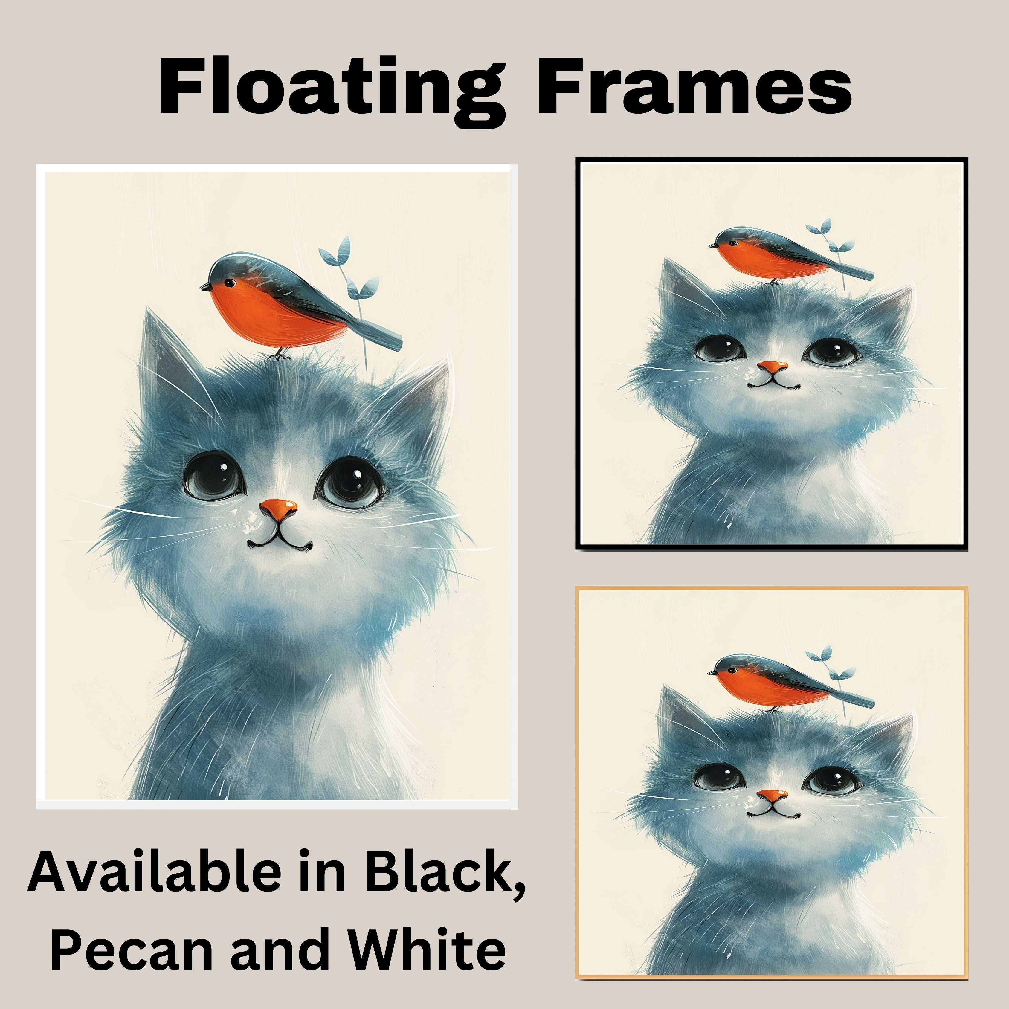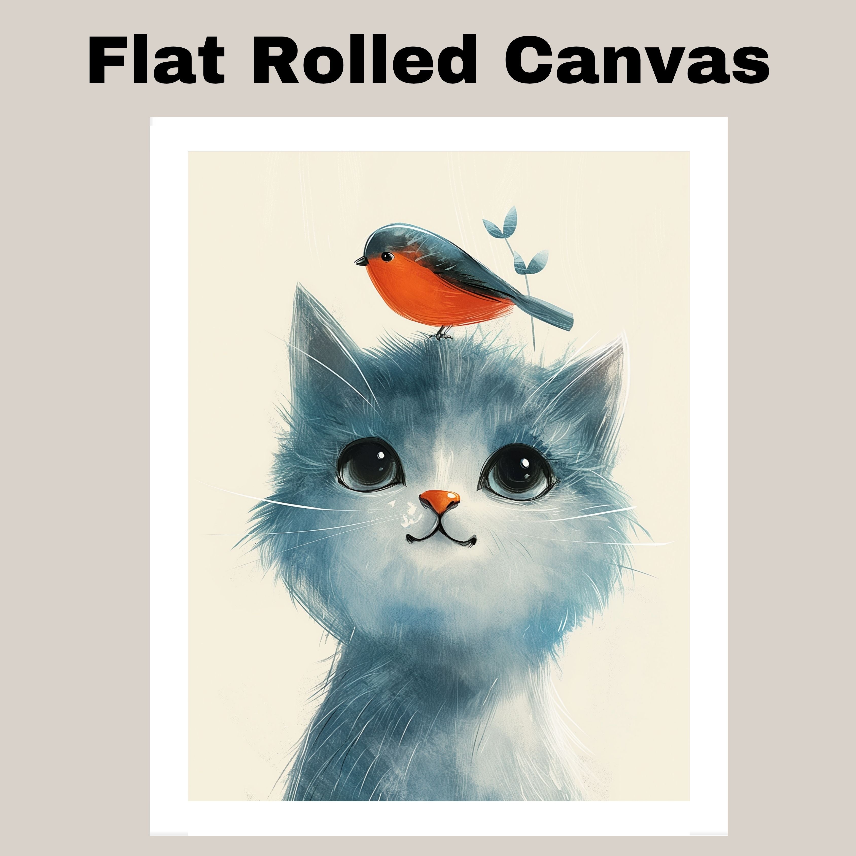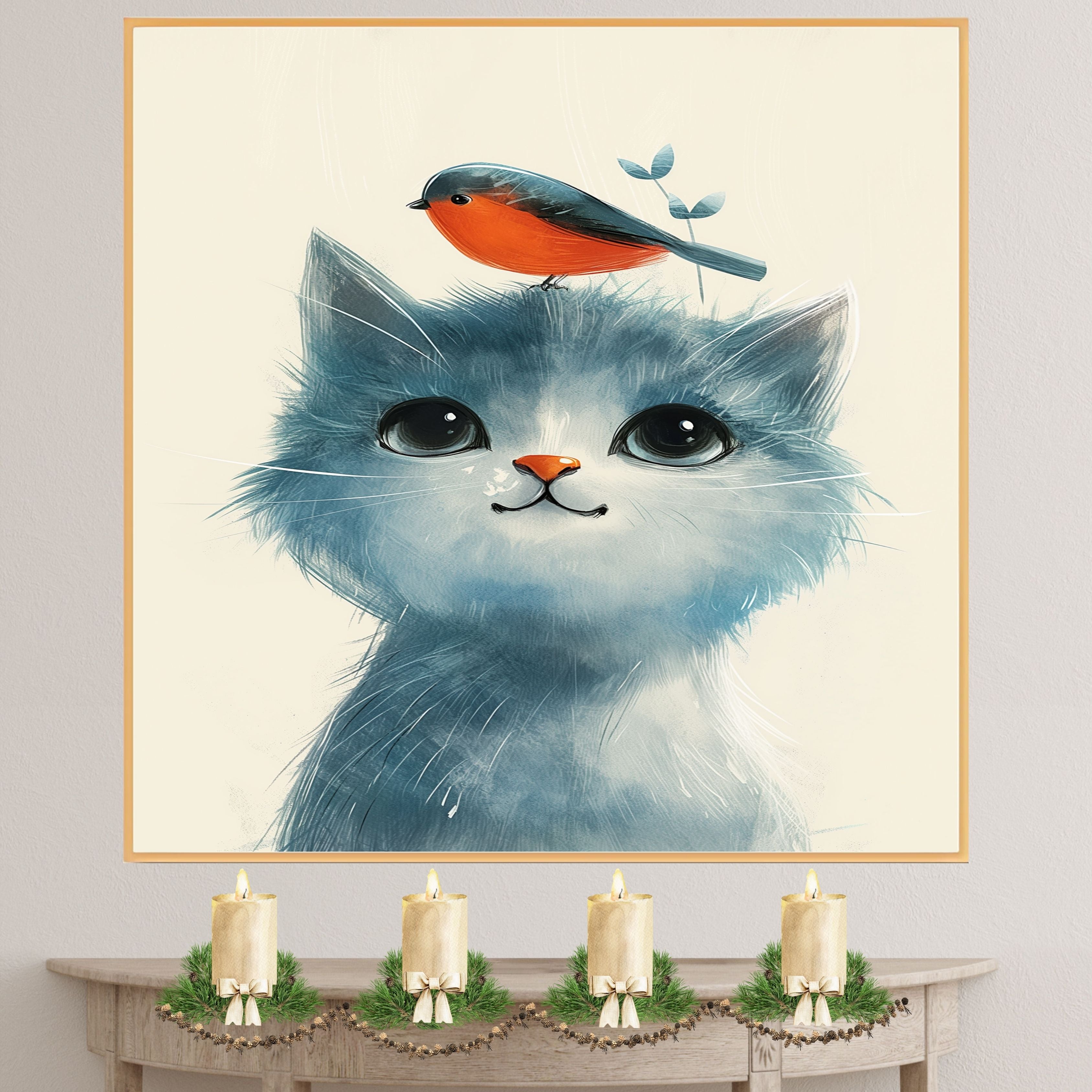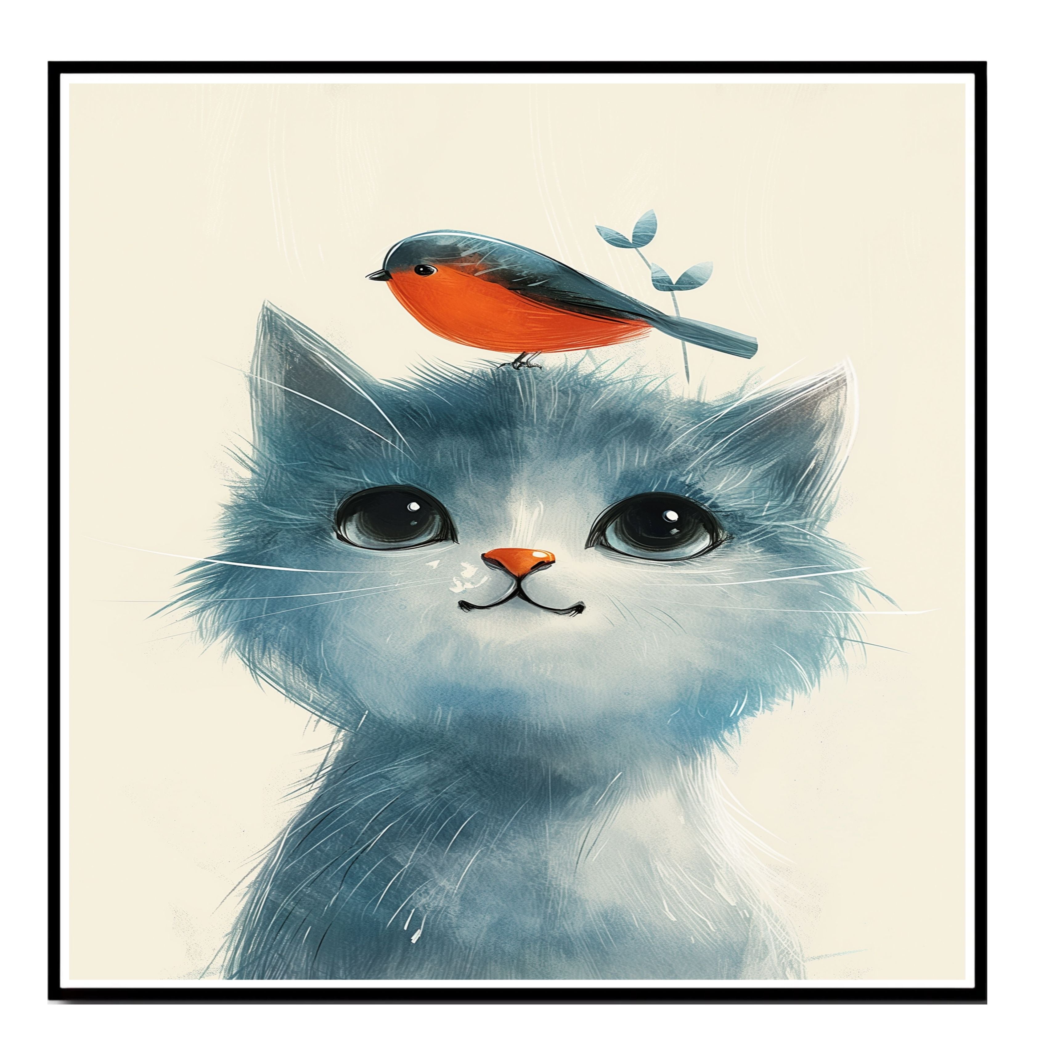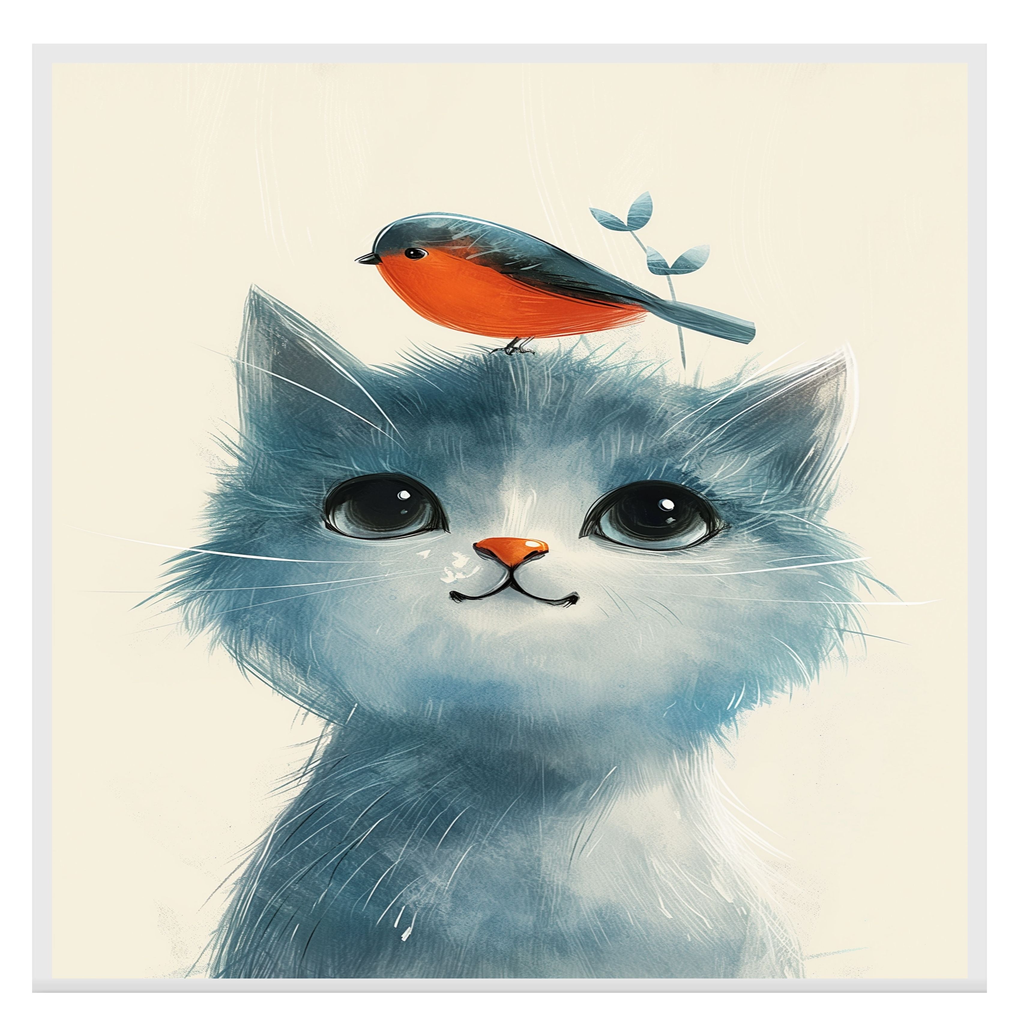 This enchanting artwork showcases a fluffy blue-gray kitten with large expressive eyes and an orange nose, perfectly still as a vibrant orange bird perches on its head. With a soft neutral background and minimalistic charm, this piece makes a delightful addition to whimsical home decor, nursery walls, or animal lover gifts.