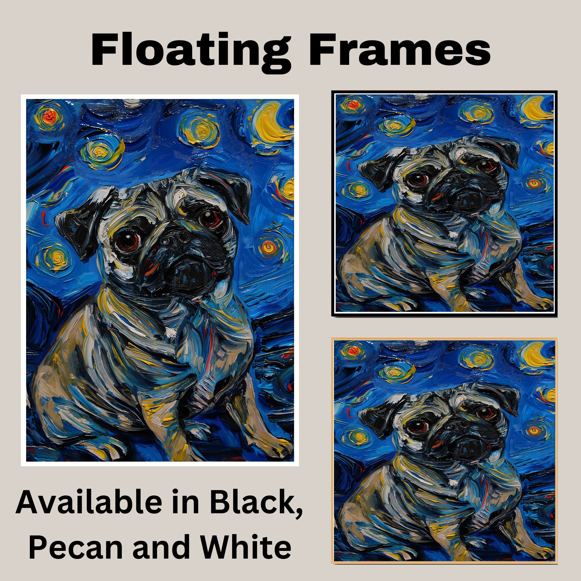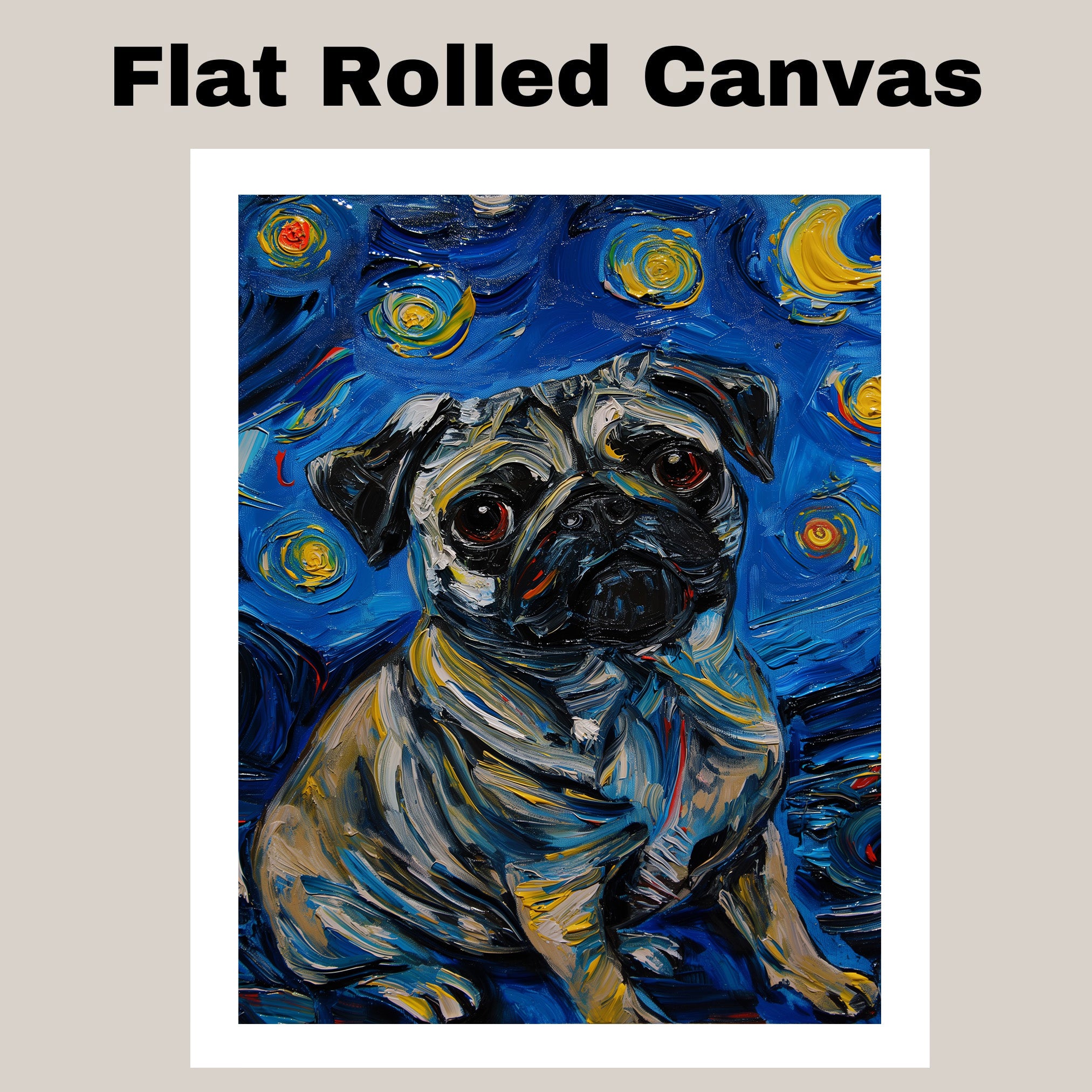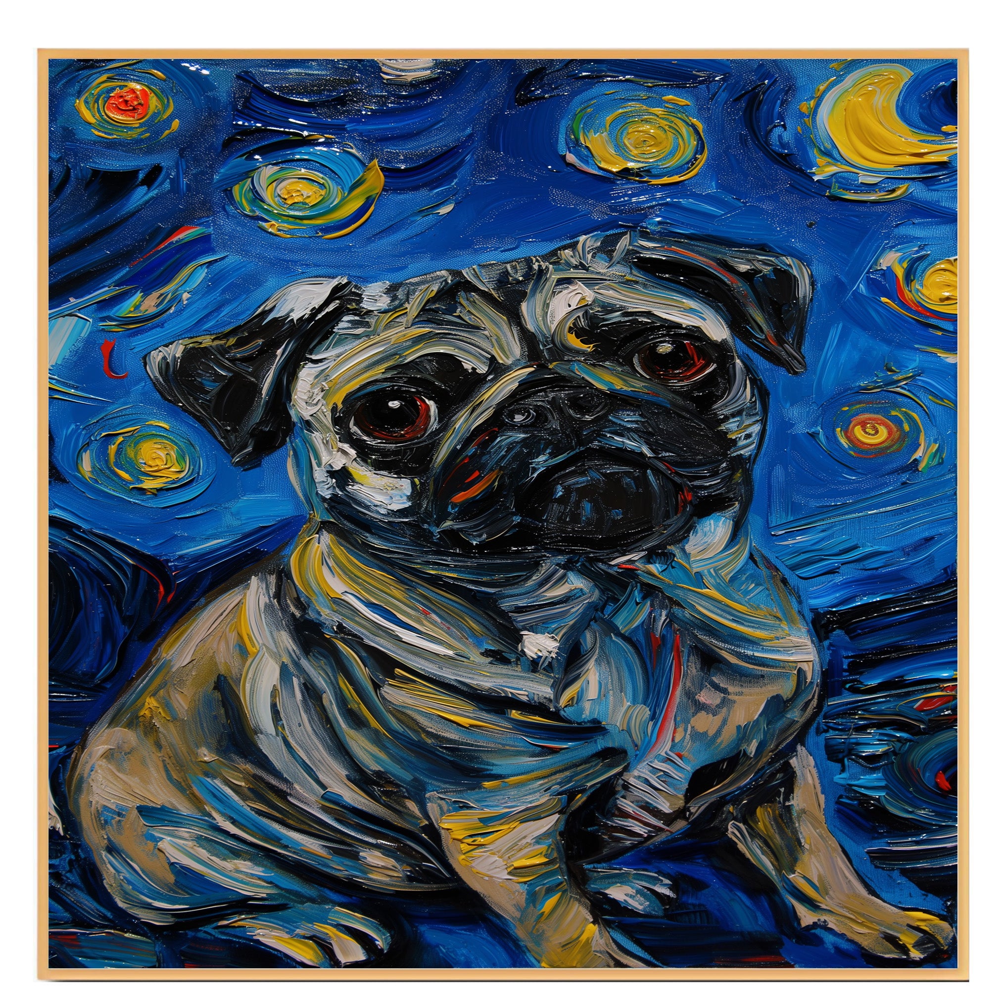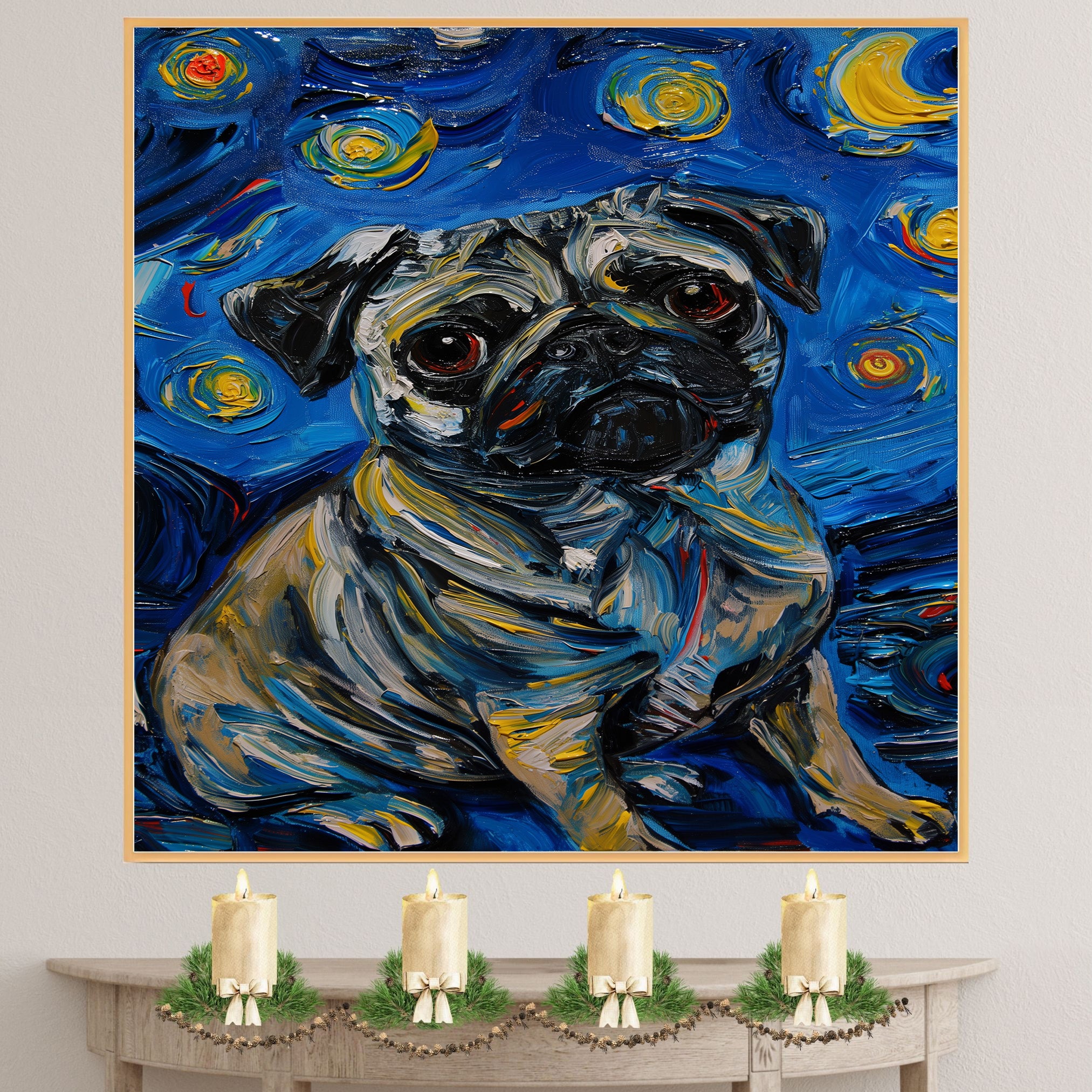 Pug Dog Painting in Van Gogh Starry Night Style with Swirling Brushstrokes and Rich Textured Colors on Ready to Hang 1.5" Thick Canvas Wrap, Floating Framed Canvas, Flat Rolled Canvas
