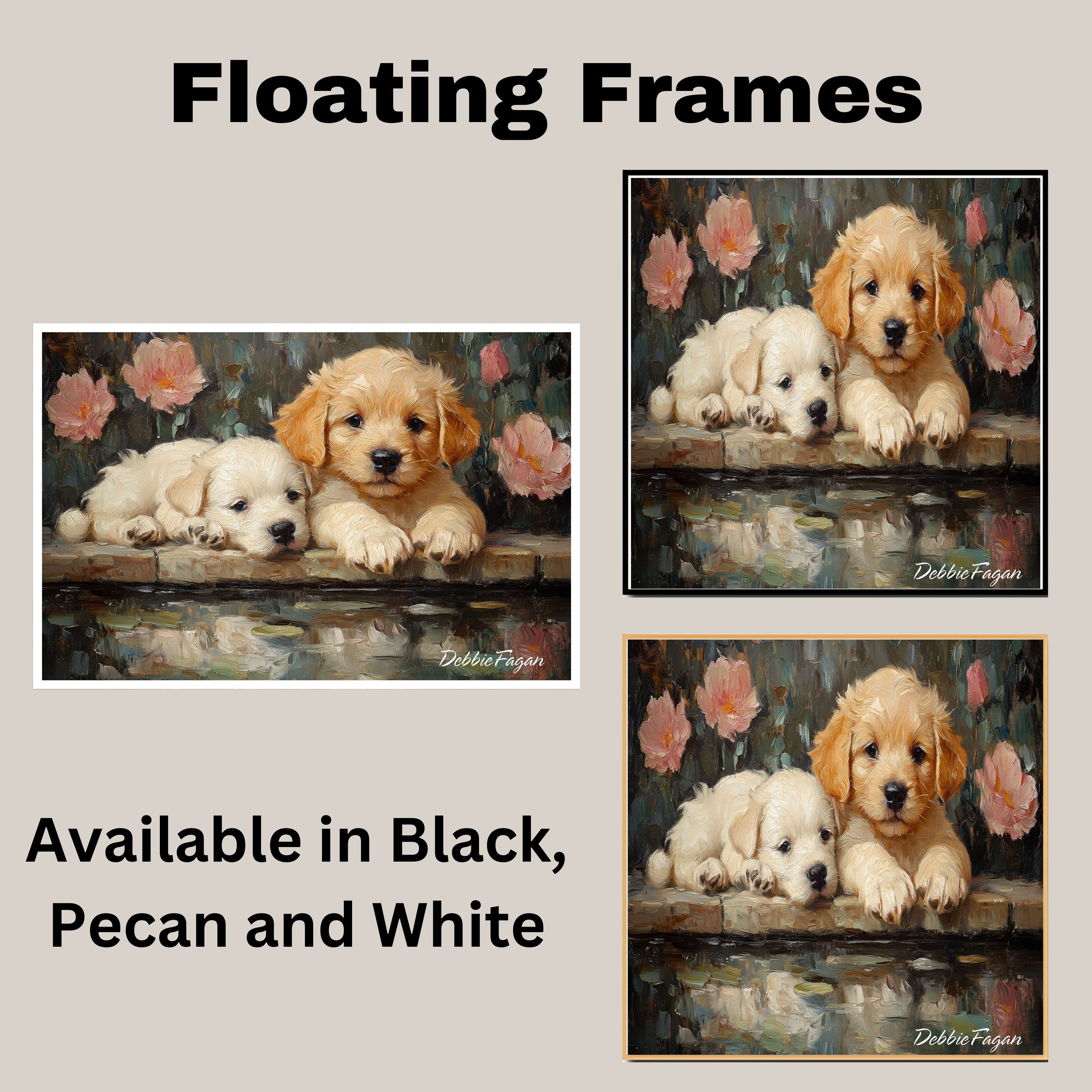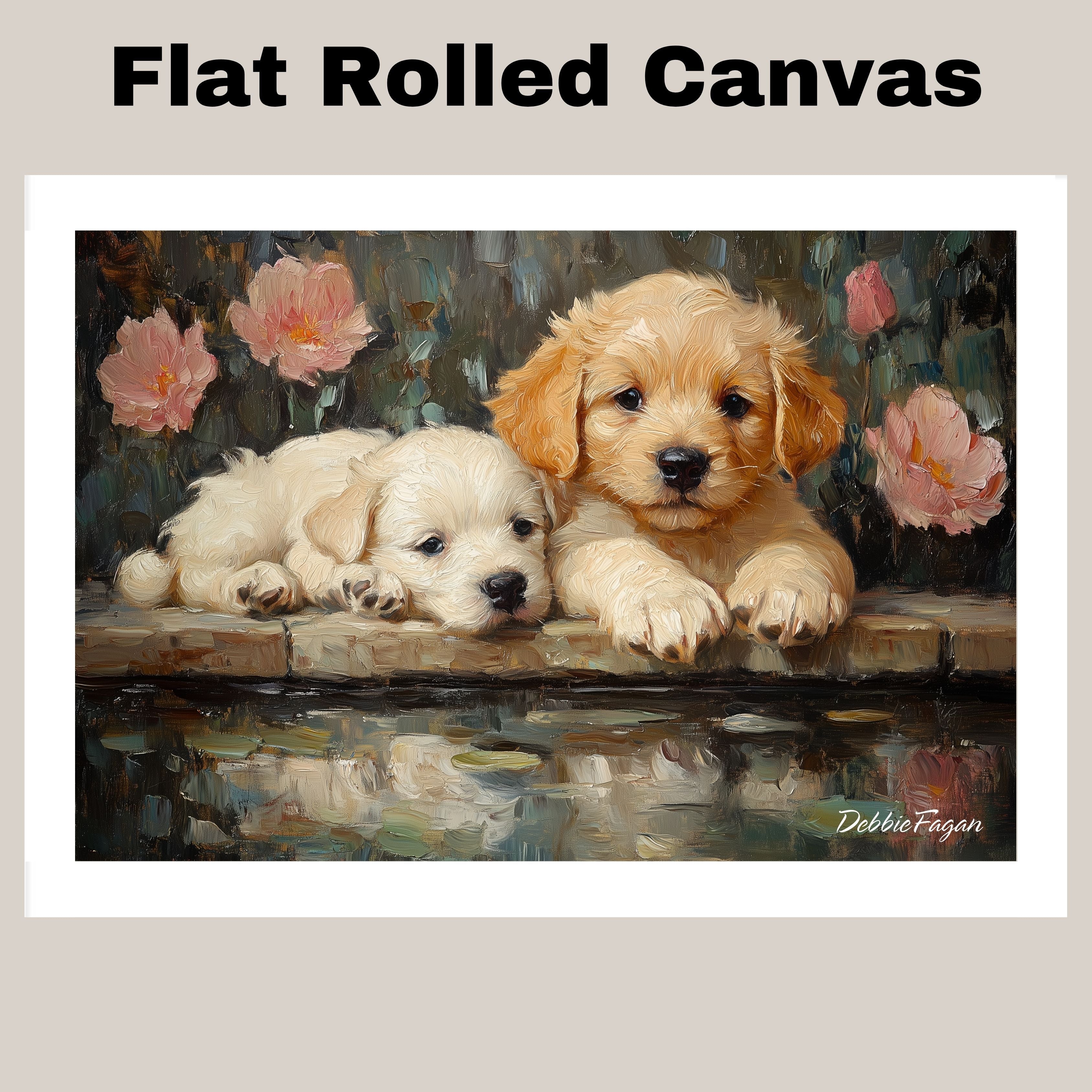 Puppies with Roses by the Pond – Romantic Dog Wall Art on Ready to Hang 1.5" Thick Canvas Wrap, Floating Framed Canvas, Flat Rolled Canvas