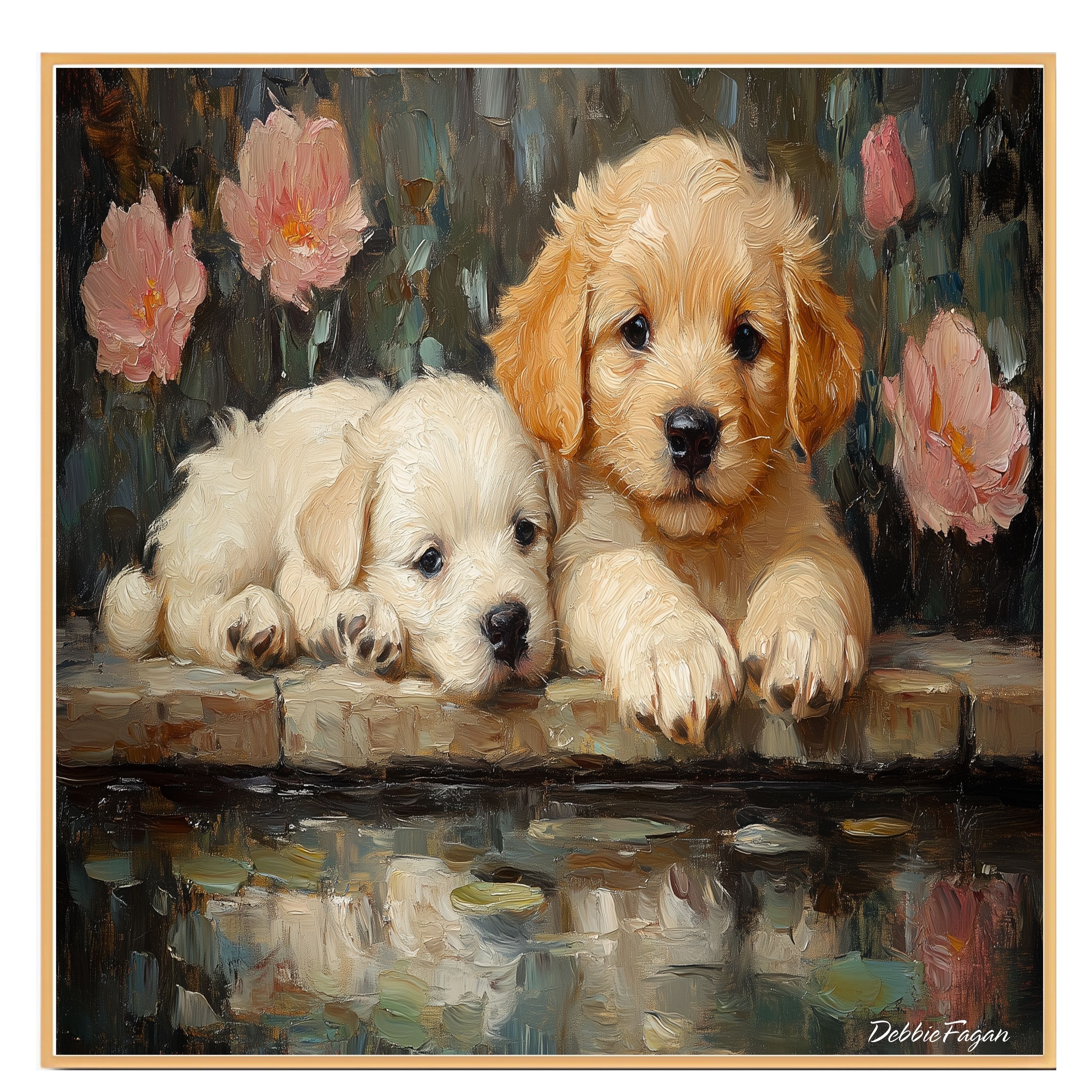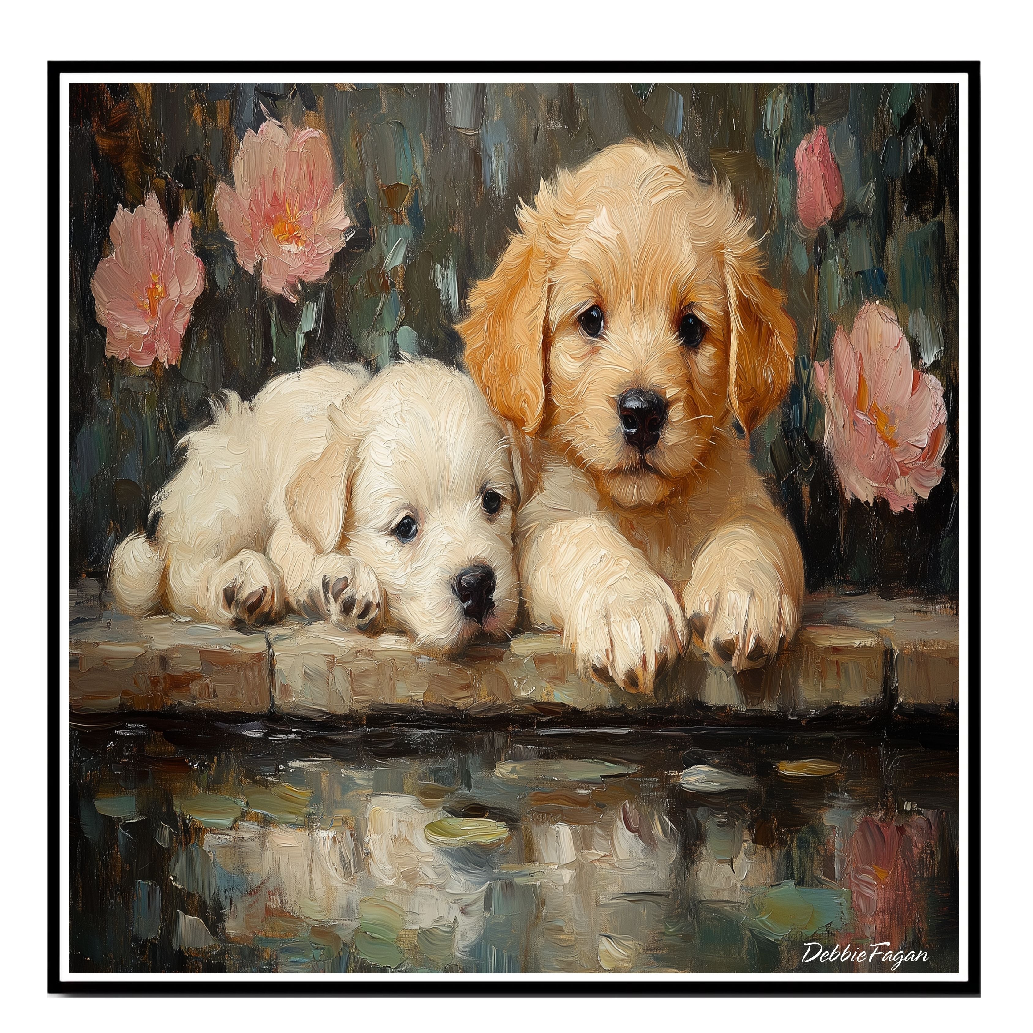 Charming oil painting-style wall art featuring adorable golden retriever puppies in serene outdoor settings. Perfect for dog...