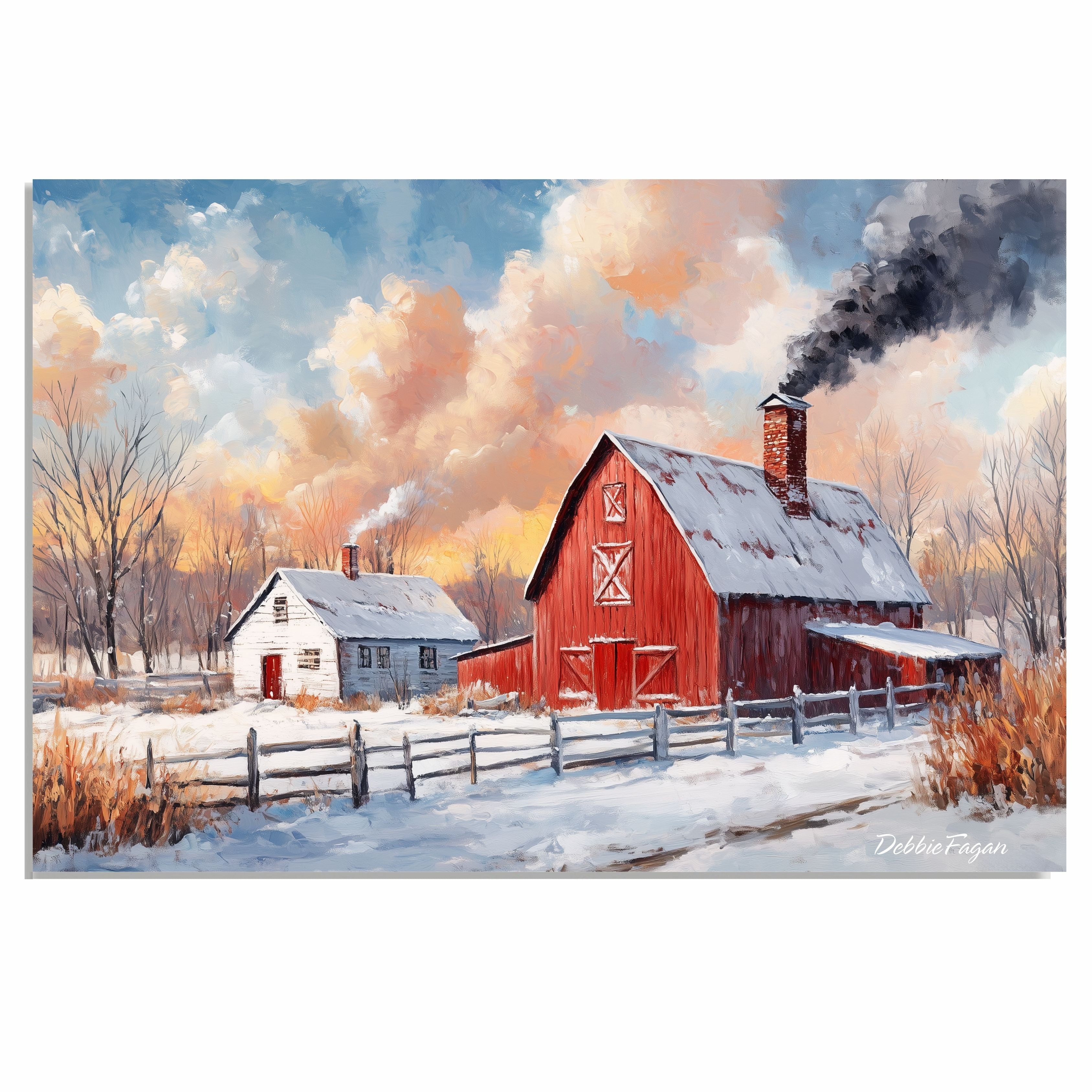 A charming winter painting featuring a snow-blanketed white farmhouse, red barn, and vintage sleigh parked under glowing lanterns. This peaceful countryside scene captures the warmth and nostalgia of the holidays.