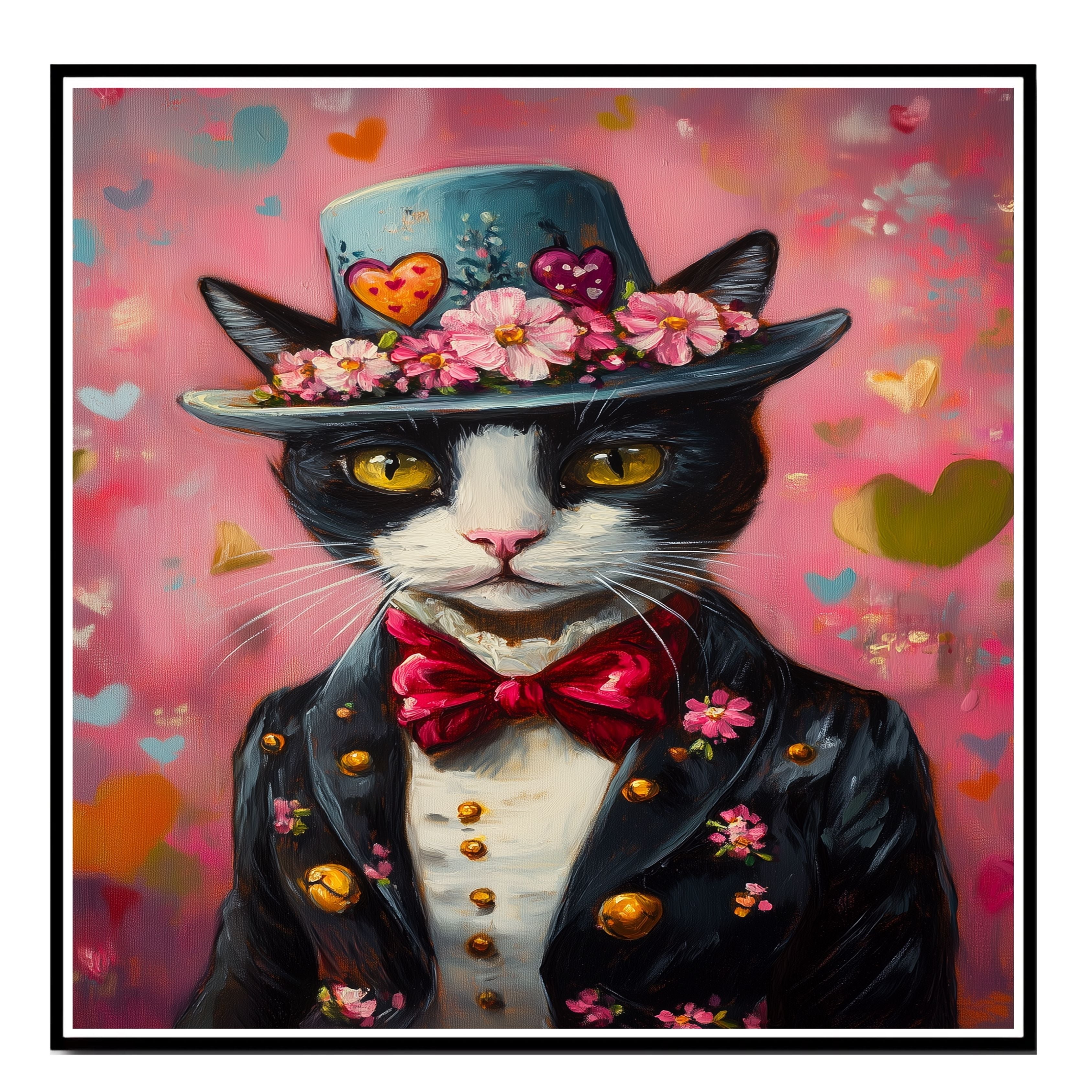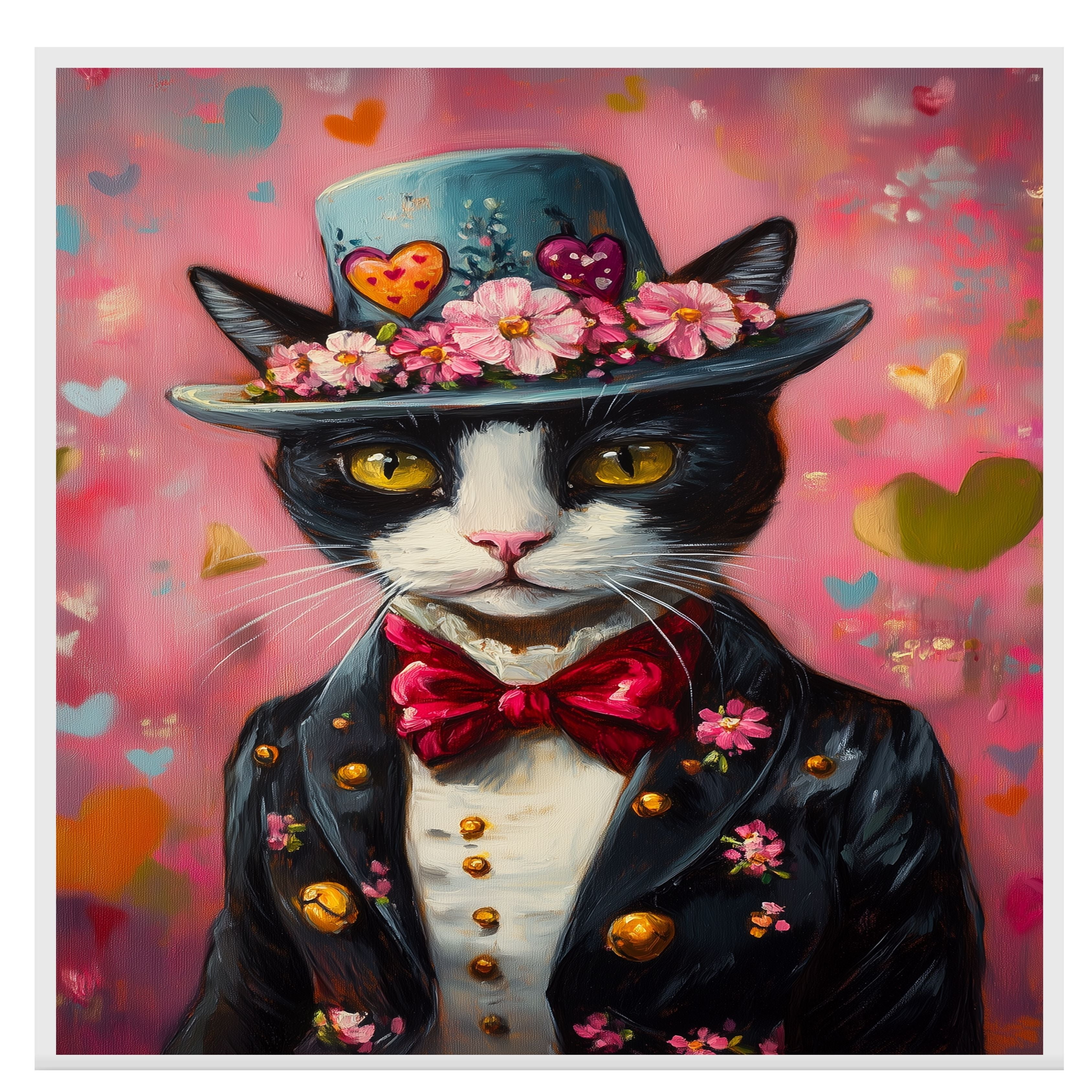 Our Regal Charm Canvas exudes sophistication, featuring a dignified tuxedo cat dressed in an elegant European suit, adorned with a lavish flowery hat. This distinguished classic painting captures the essence of refinement and poise, making it a captivating addition to any art lover's collection. The cat's piercing gaze and stately attire evoke an air of nobility, while intricate details bring timeless charm to the piece. Available on a 1.5" thick canvas wrap, floating framed canvas, or as a flat rolled canvas, this exquisite artwork is perfect for those who appreciate elegance with a touch of whimsy. A splendid gift for cat lovers and admirers of classic artistry.