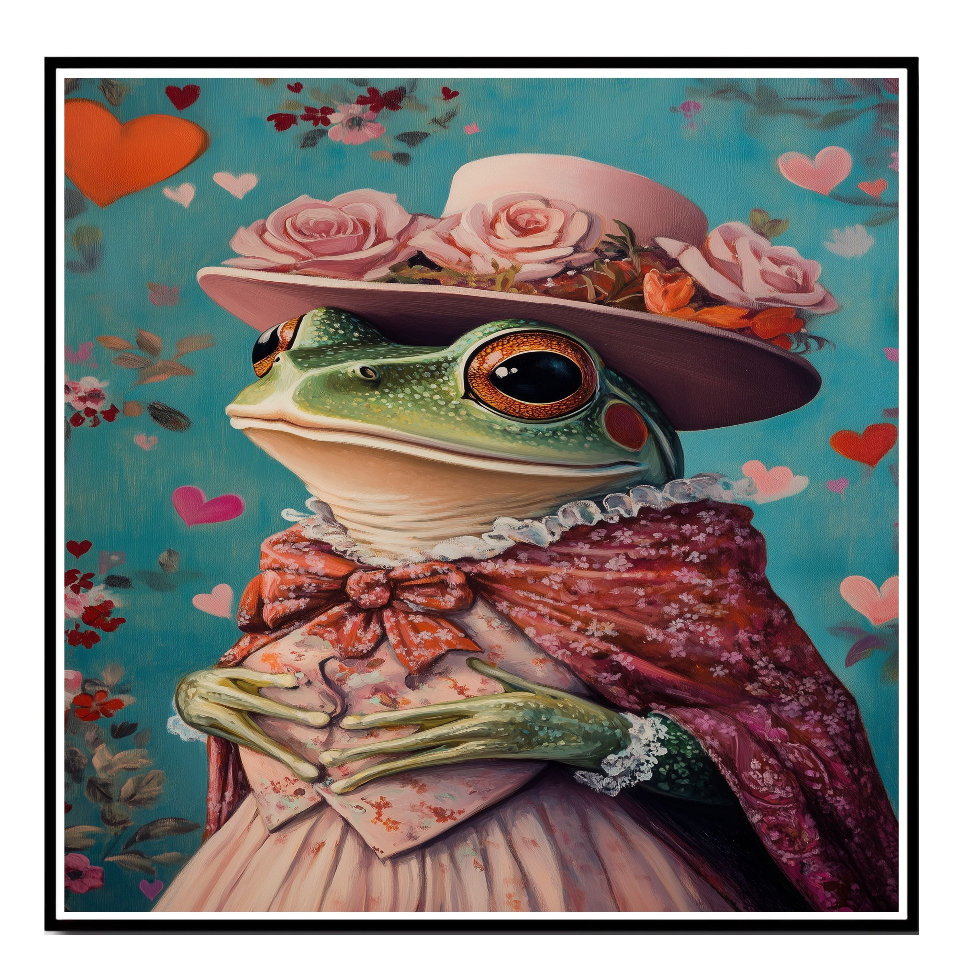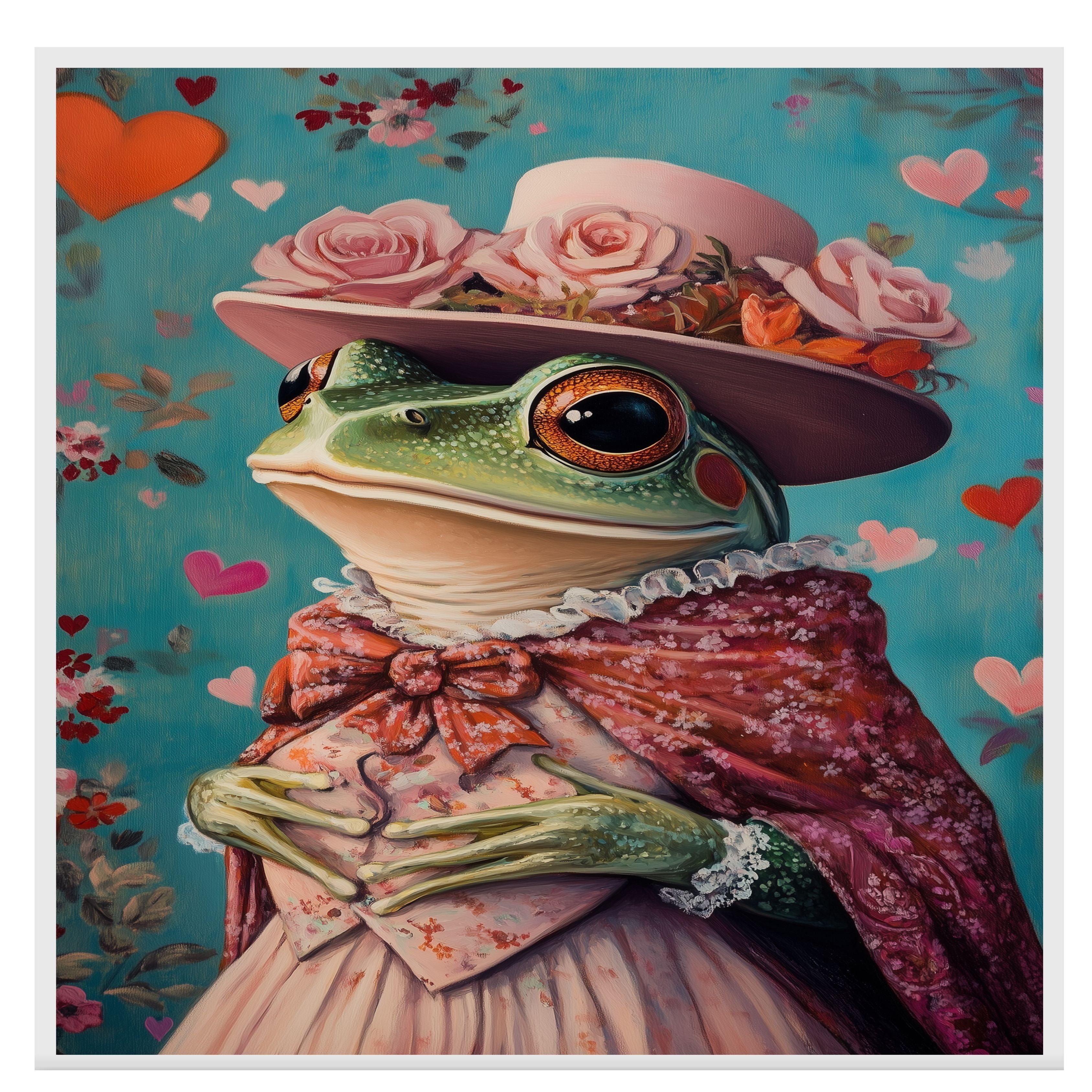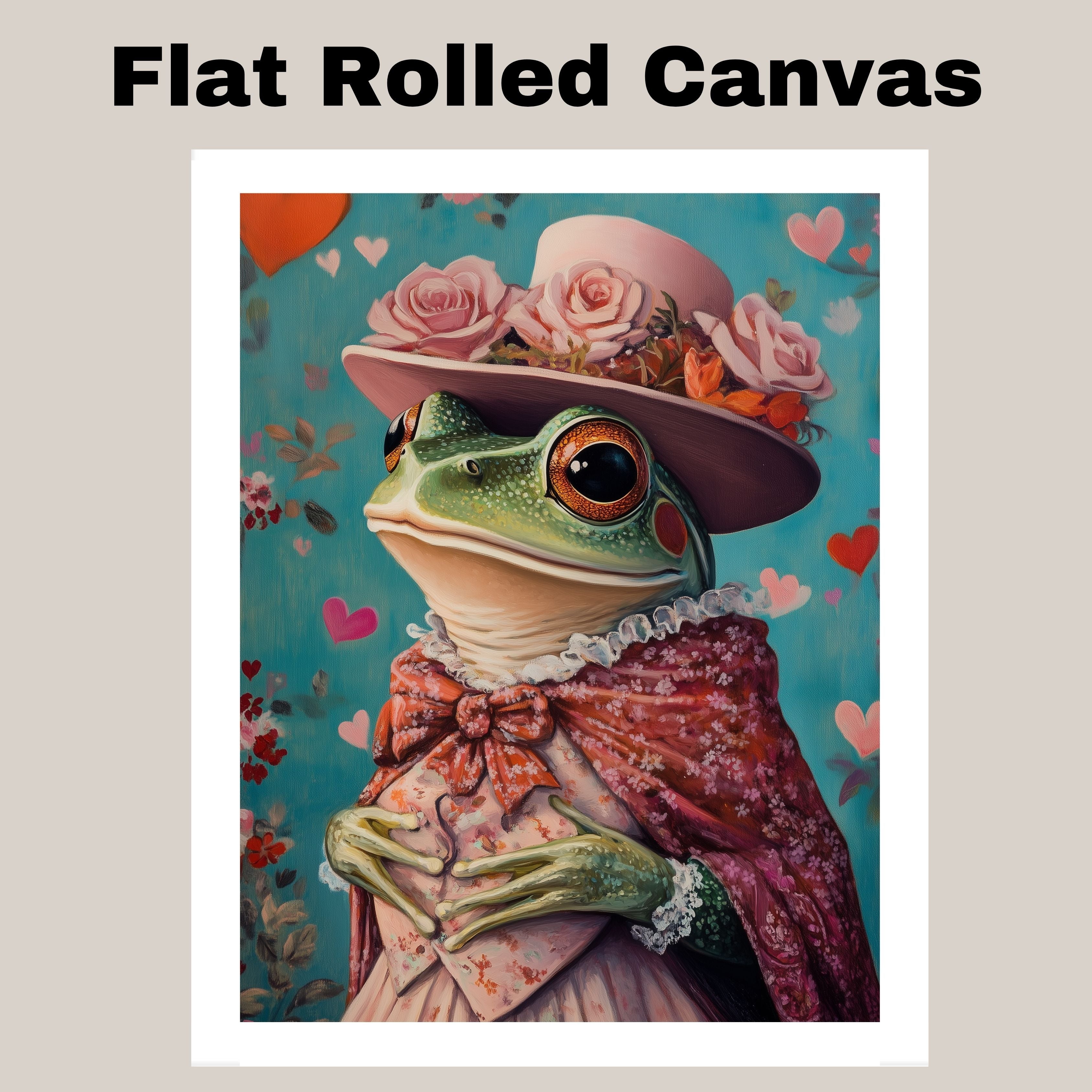 Our "Regal Enchantment" Canvas showcases a whimsical green frog dressed in a stunning Victorian-era European dress and hat, exuding charm and sophistication. This heartfelt artwork blends elegance with playfulness, capturing the frogs delightful personality in exquisite detail. Soft, vintage-inspired hues create a warm and inviting atmosphere, making this piece a perfect addition to any space. Available on a 1.5" thick canvas wrap, floating framed canvas, or flat rolled canvas, this enchanting artwork is a wonderful gift for frog lovers and those who appreciate unique, regal-inspired art with a touch of whimsy.