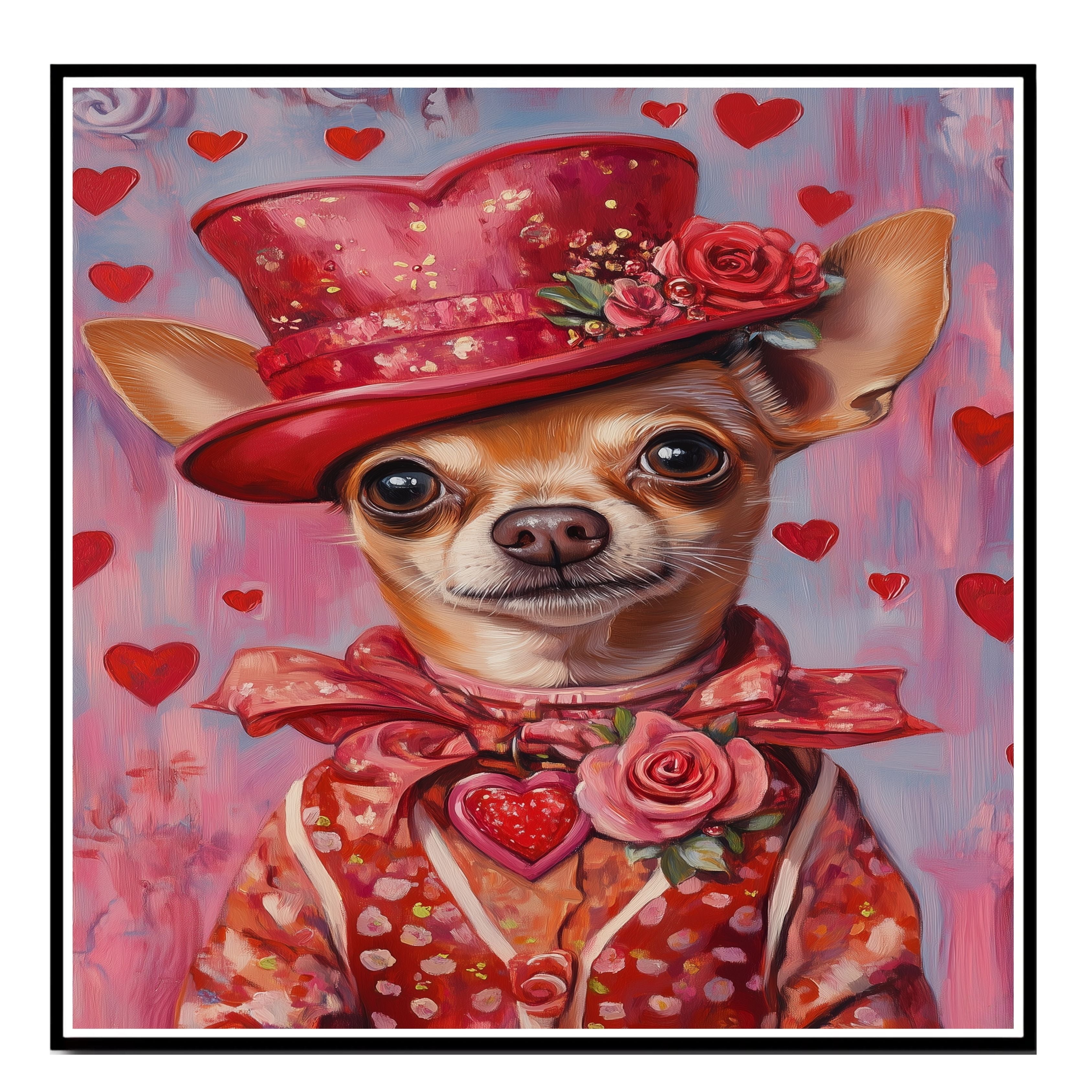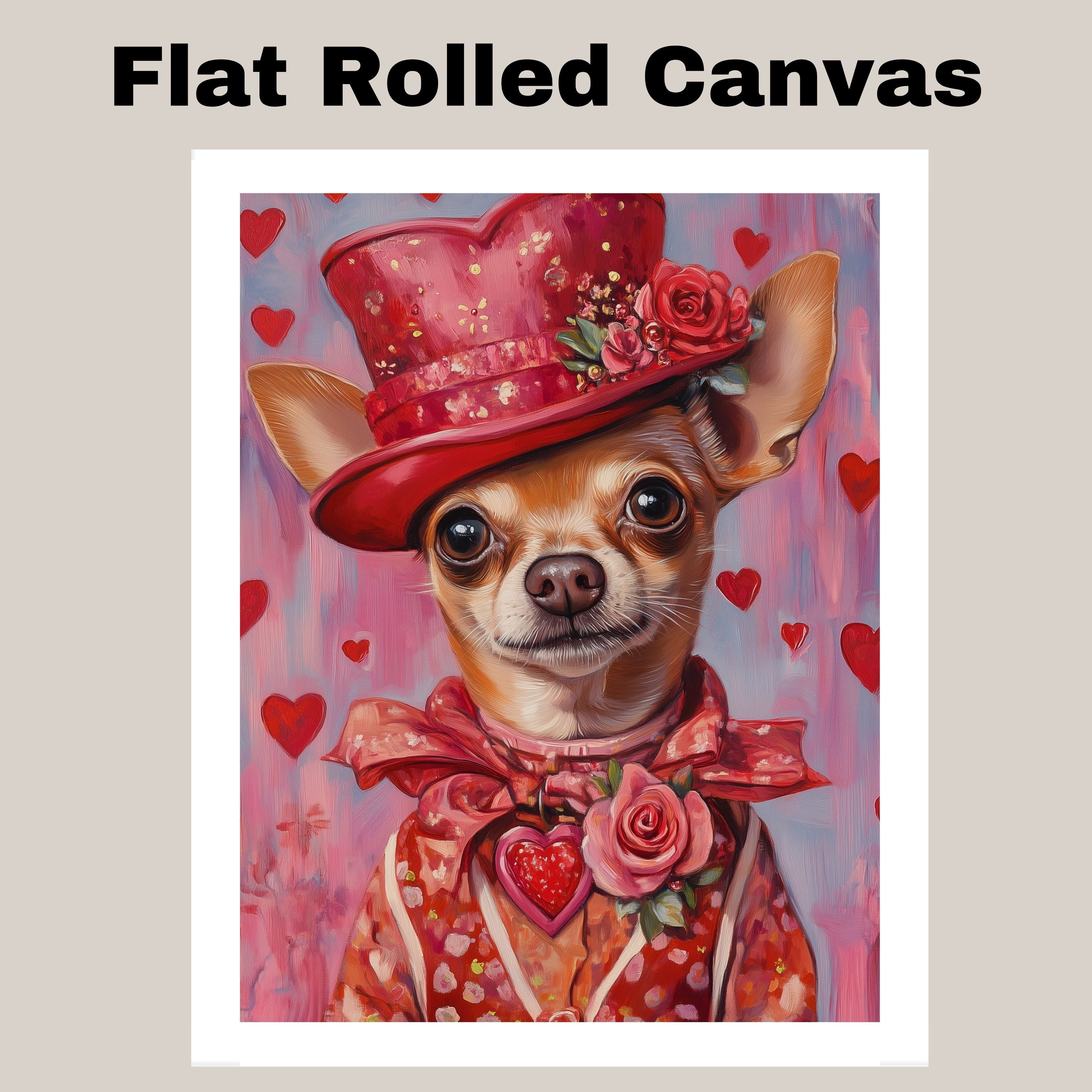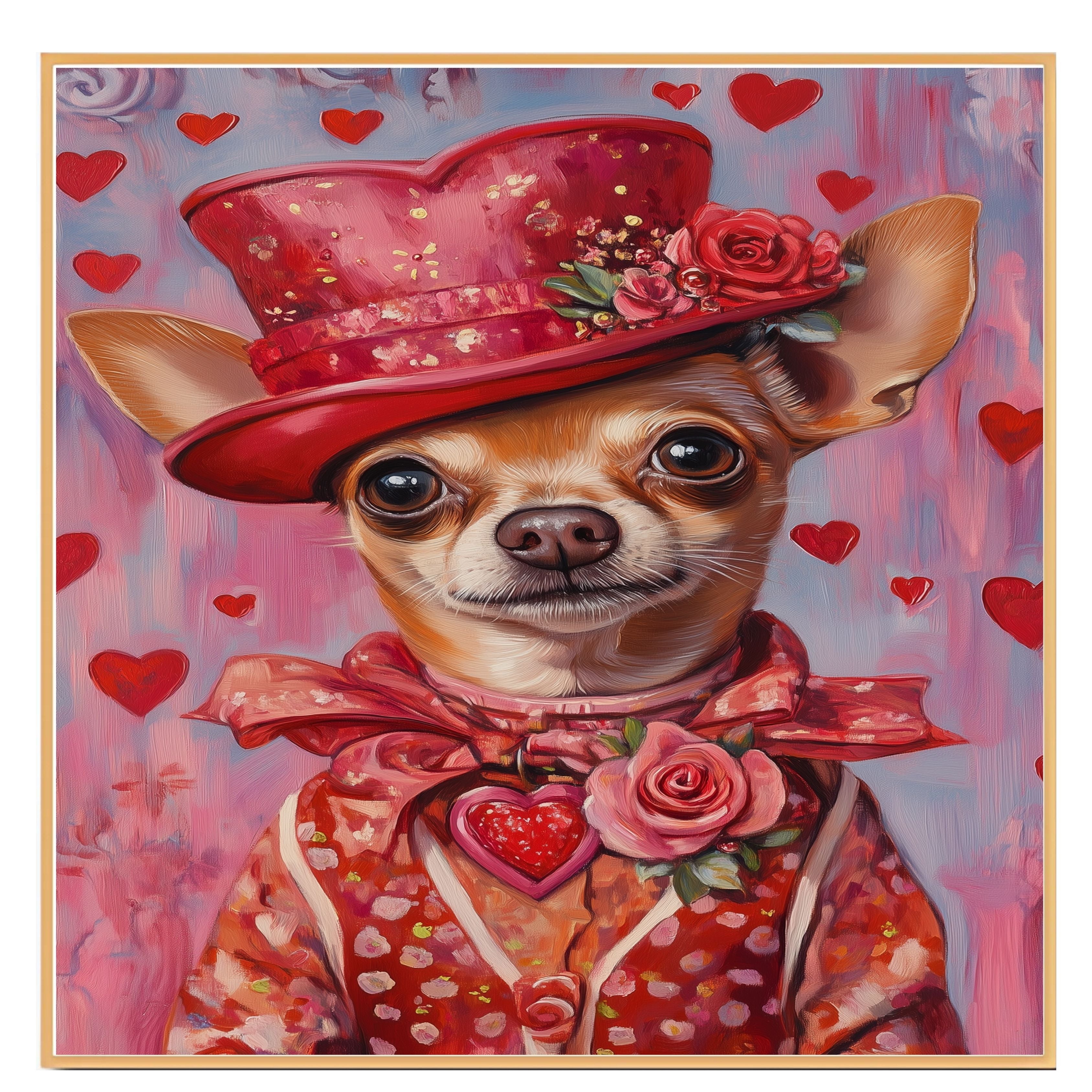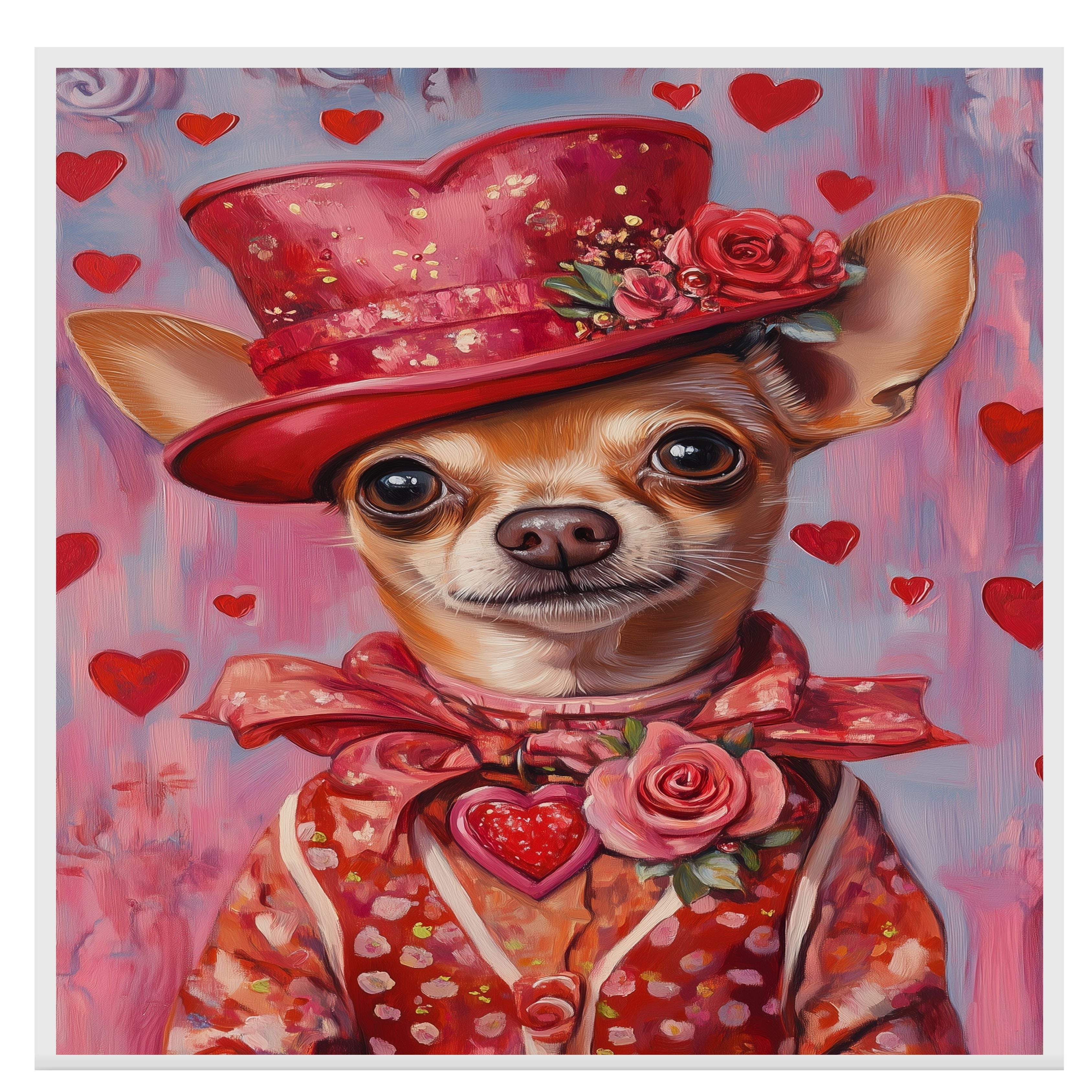 Our "Regal Romance" Canvas exudes sophistication and charm, featuring a poised Chihuahua adorned in a European-inspired red dress and an elegant hat, embodying timeless grace. This heartfelt painting captures the essence of refined beauty, making it a stunning statement piece for your home. Soft lighting enhances the rich details of the attire, evoking a sense of classic elegance and warmth. Available on a 1.5" thick canvas wrap, floating framed canvas, or as a flat rolled canvas, this exquisite artwork adds a touch of aristocratic allure to any space. A perfect gift for dog lovers and those who appreciate refined artistry