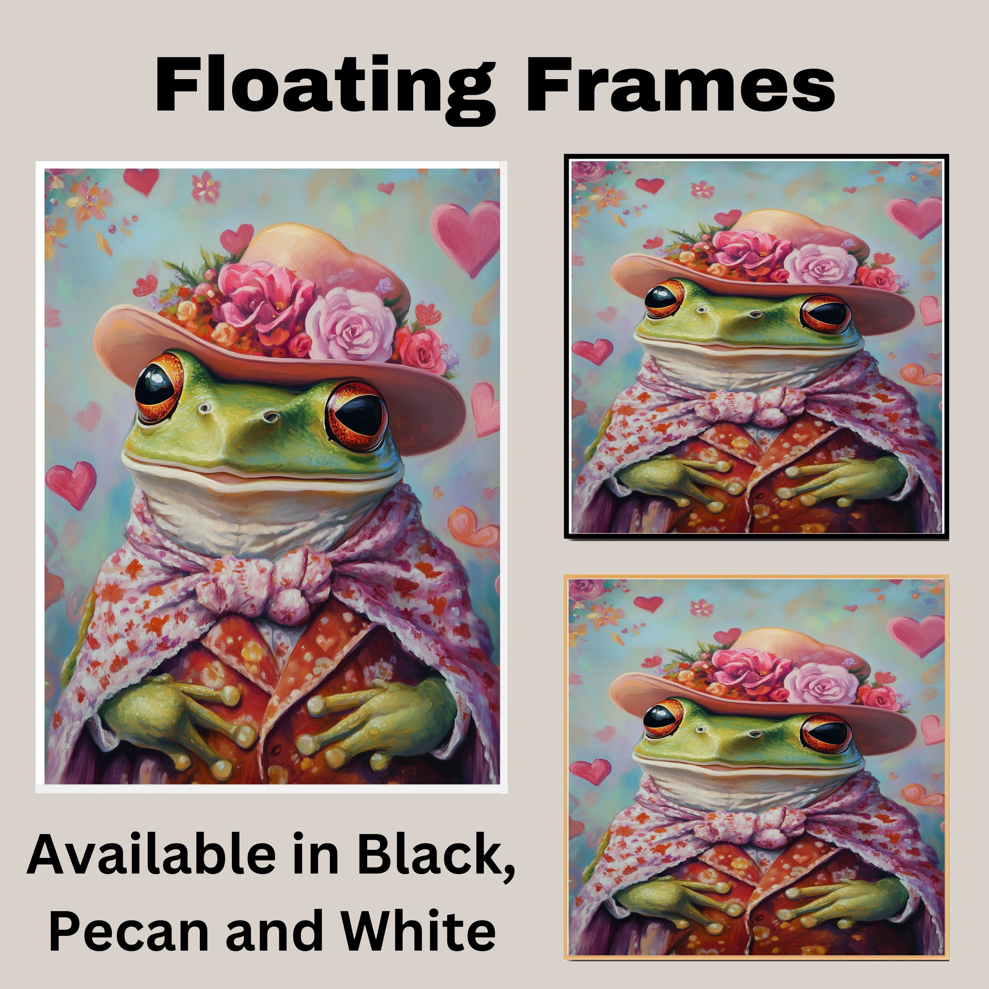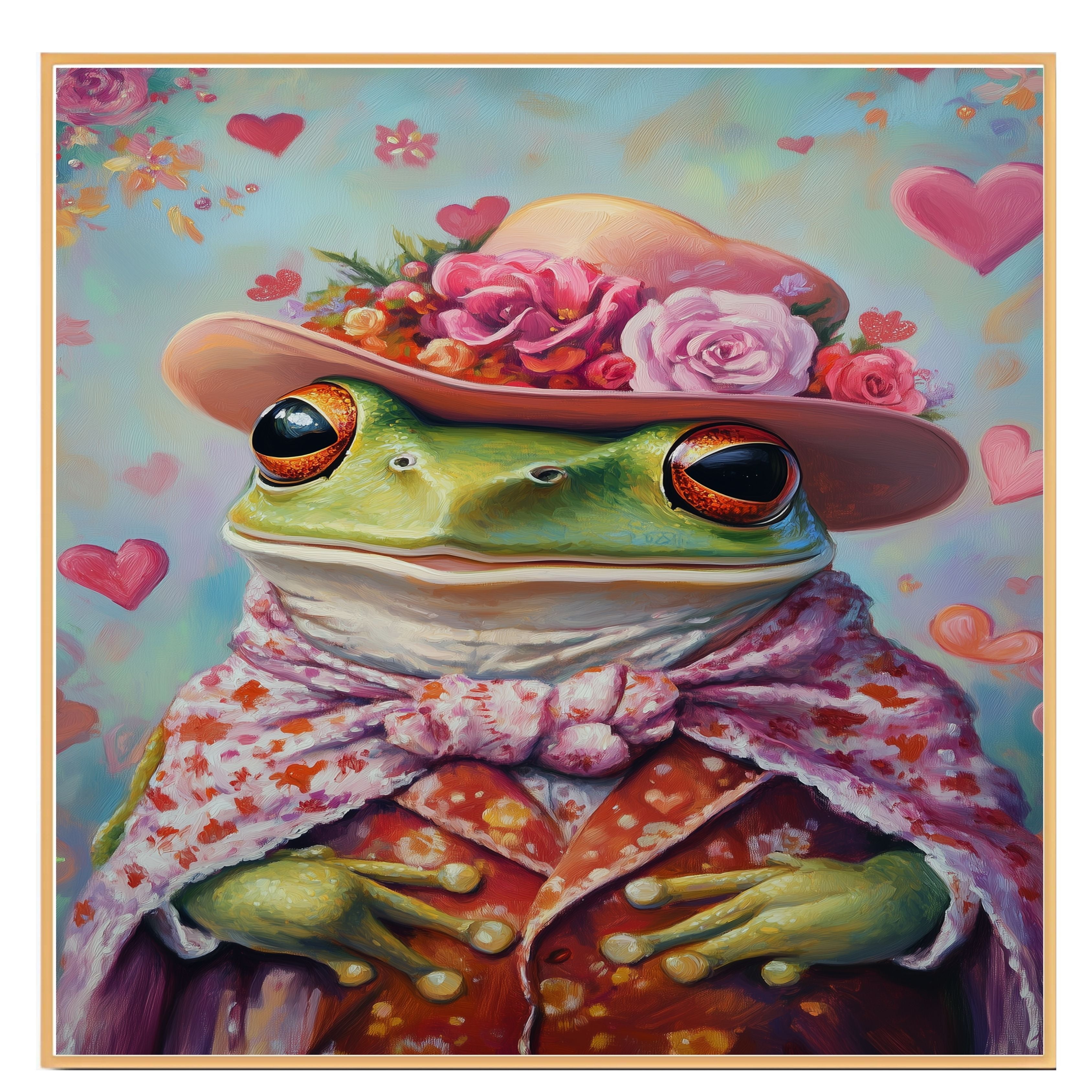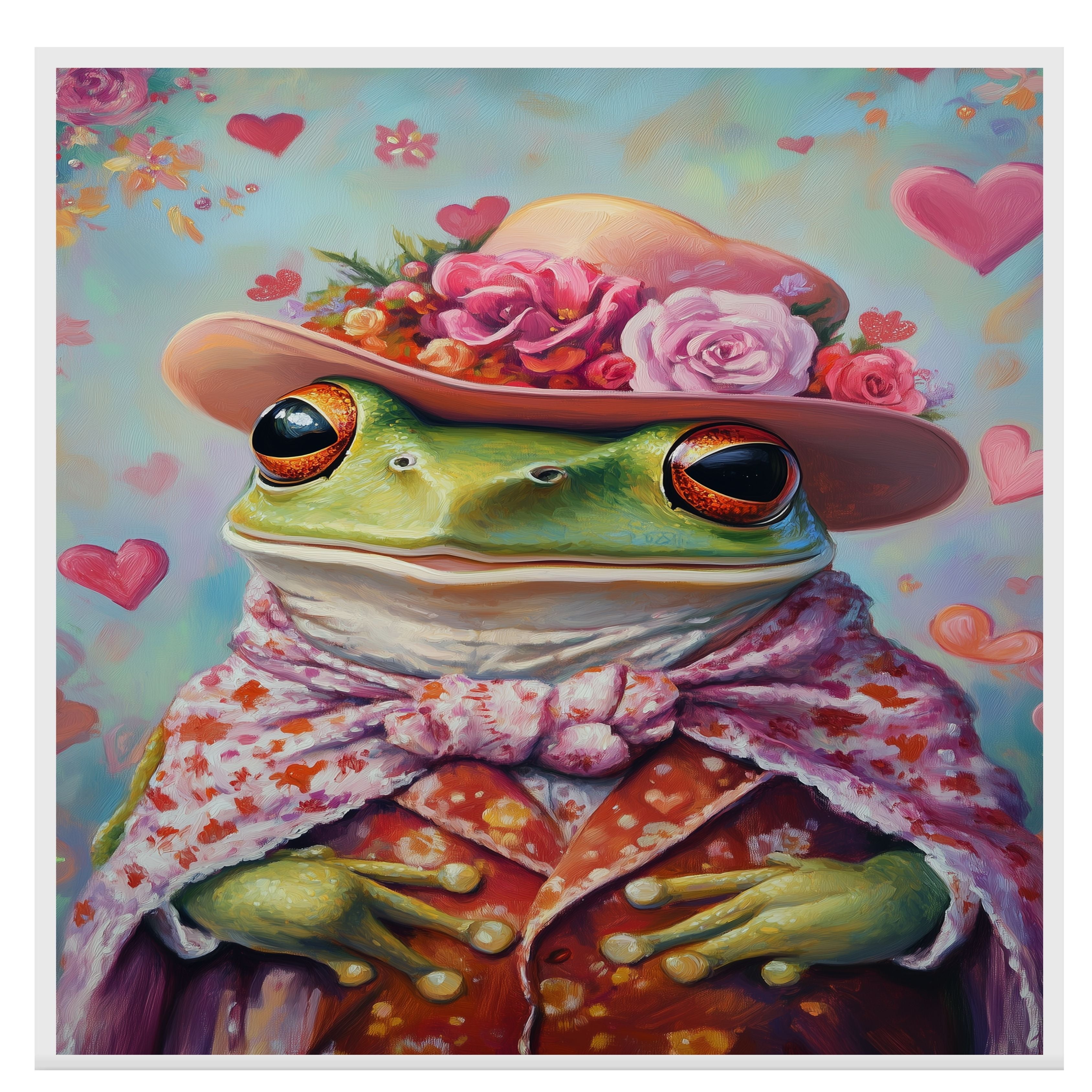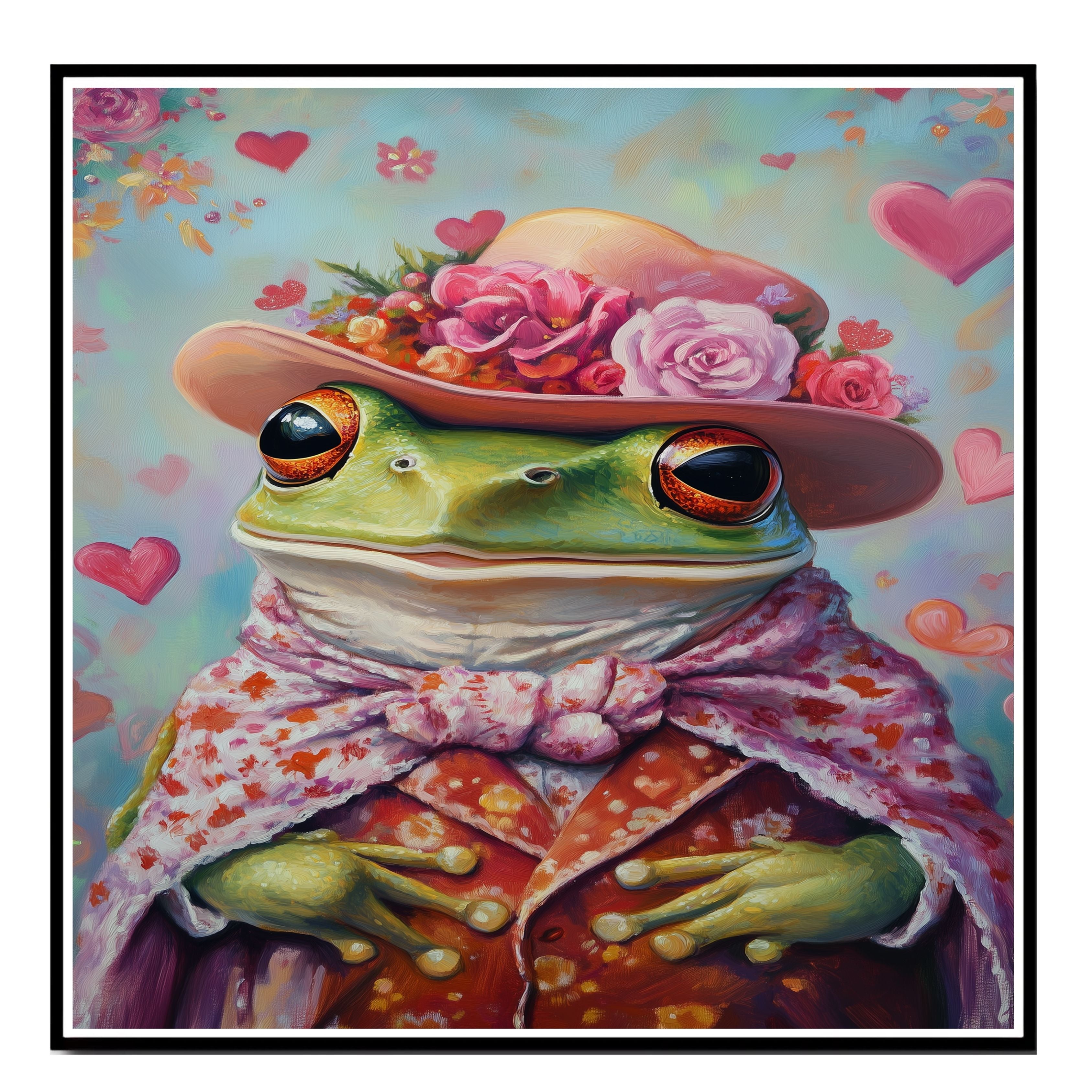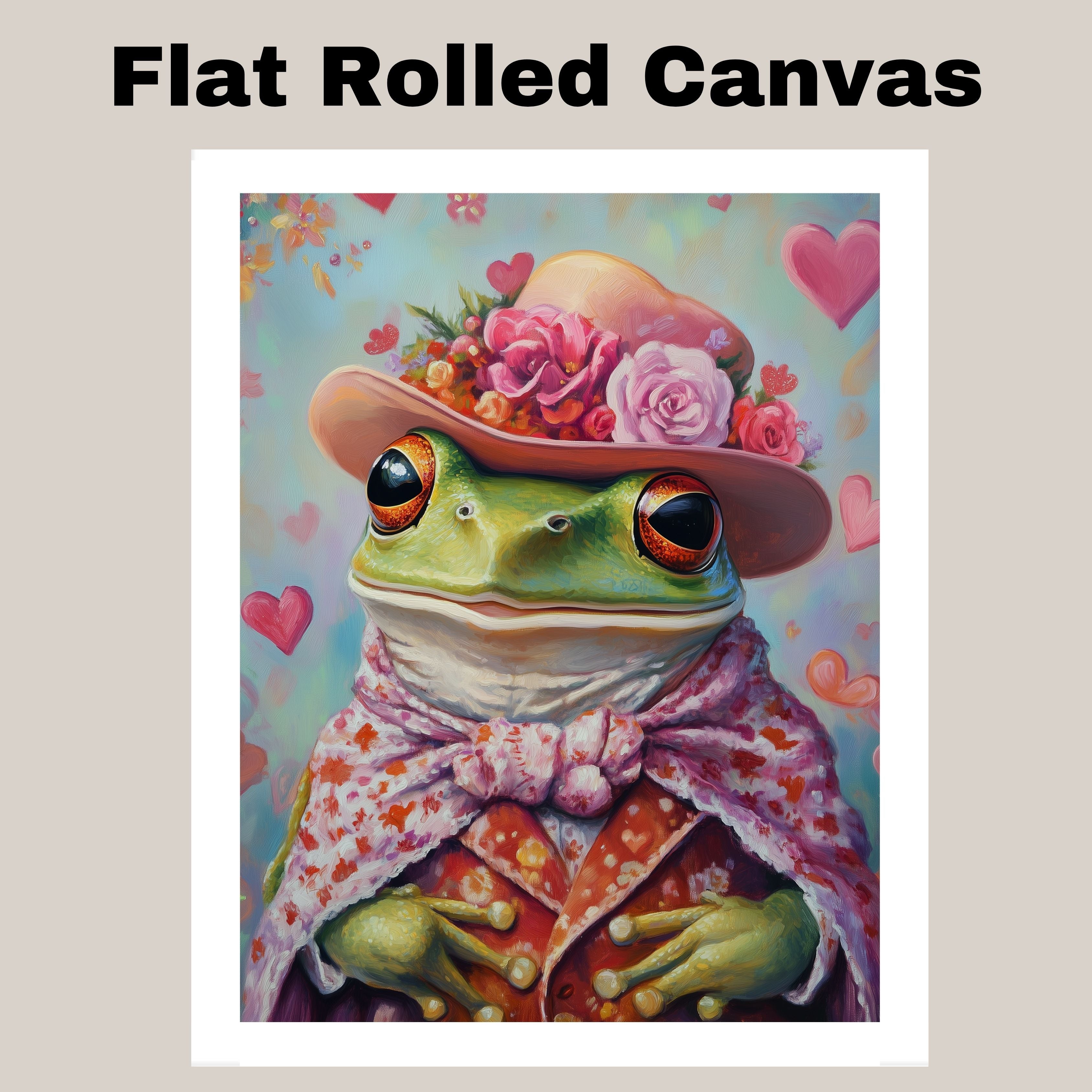 Our "Regal Whimsy" Canvas showcases a charming green frog dressed in a Victorian-era European suit and hat, blending elegance with playful enchantment. This heartfelt artwork captures the frogs endearing personality, exuding a sense of refinement with a whimsical twist. The intricate details and vintage-inspired hues create a captivating scene that brings warmth and charm to any space. Available on a 1.5" thick canvas wrap, floating framed canvas, or flat rolled canvas, this delightful piece makes a perfect gift for frog lovers and those who appreciate unique, romantic art with a touch of regal whimsy.