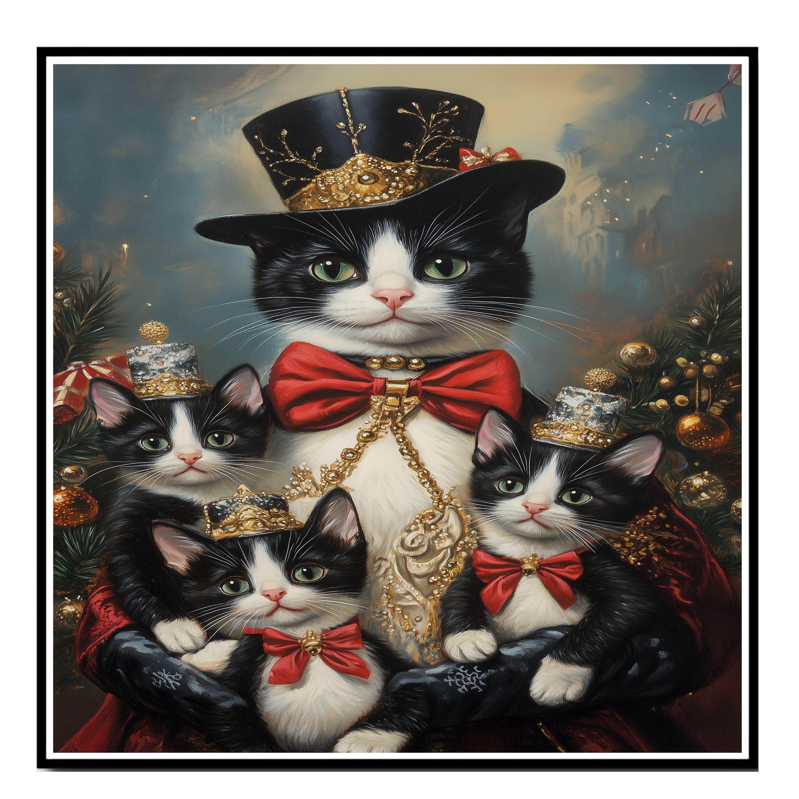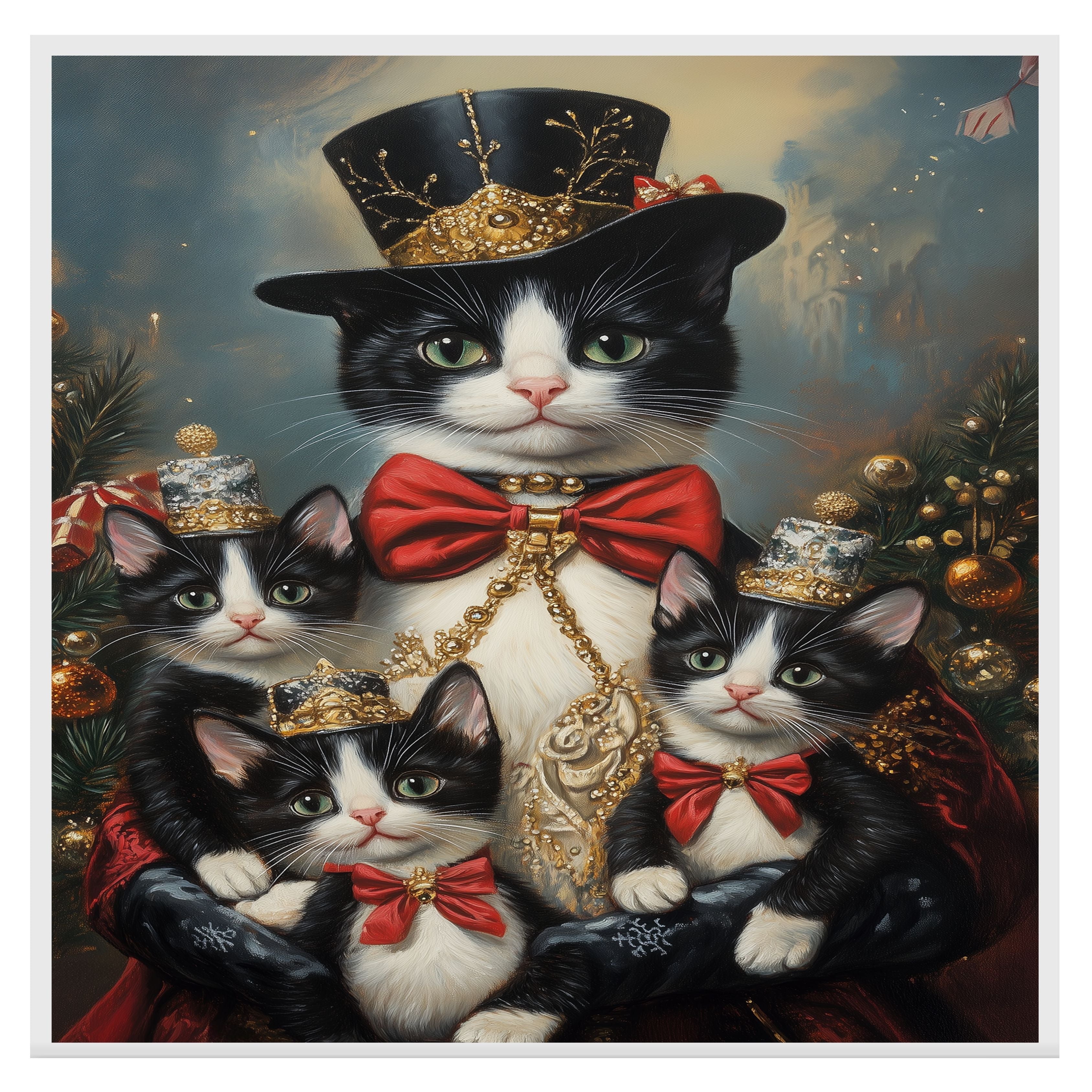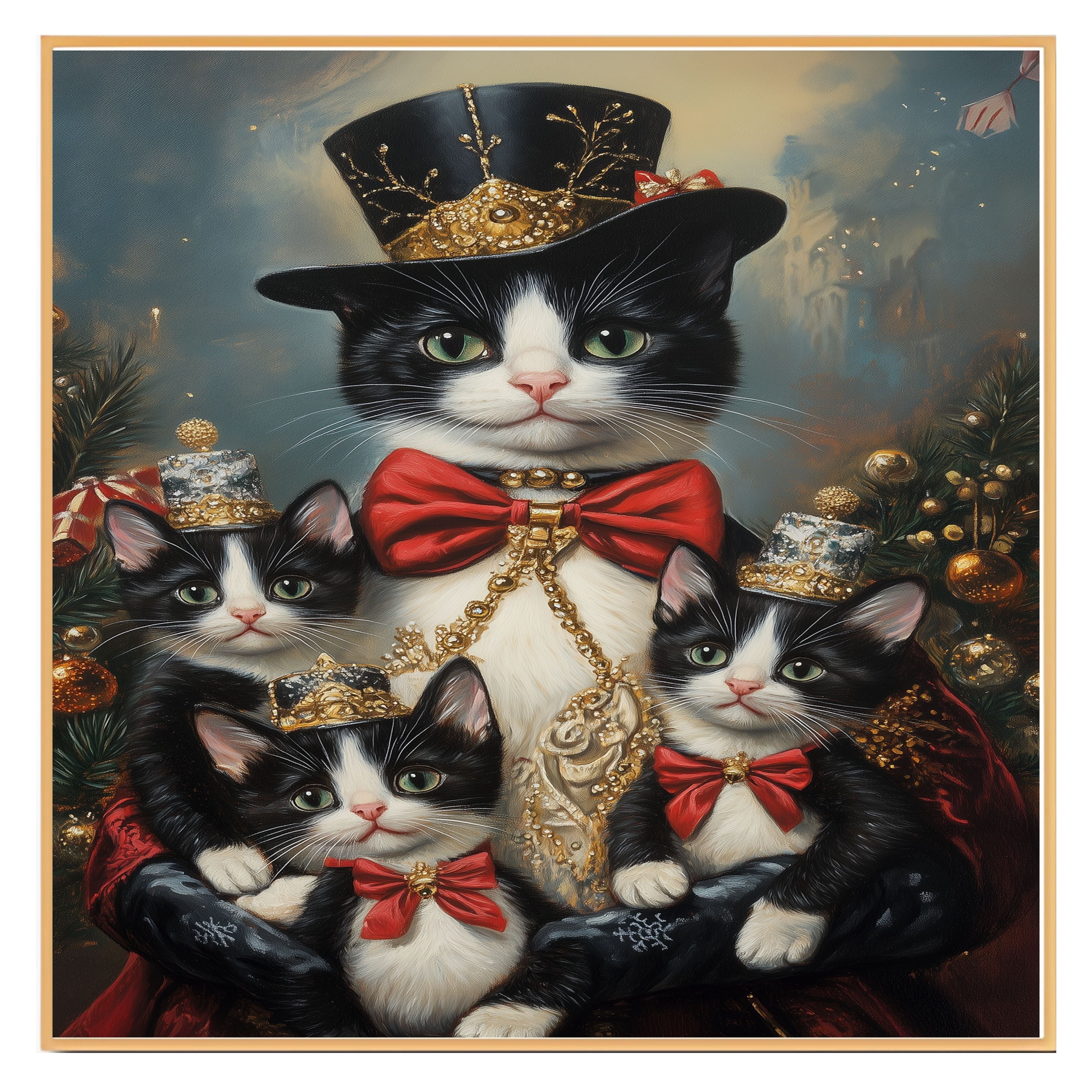 "Regal Yuletide Charm" showcases a tuxedo cat mom and her kittens dressed in elegant holiday attire, set against a festive, Victorian-inspired backdrop. This heartwarming scene exudes seasonal grace and holiday magic, making it a perfect addition to Christmas decor. Available on 1.5" thick canvas wrap, floating framed canvas, or flat rolled canvas.