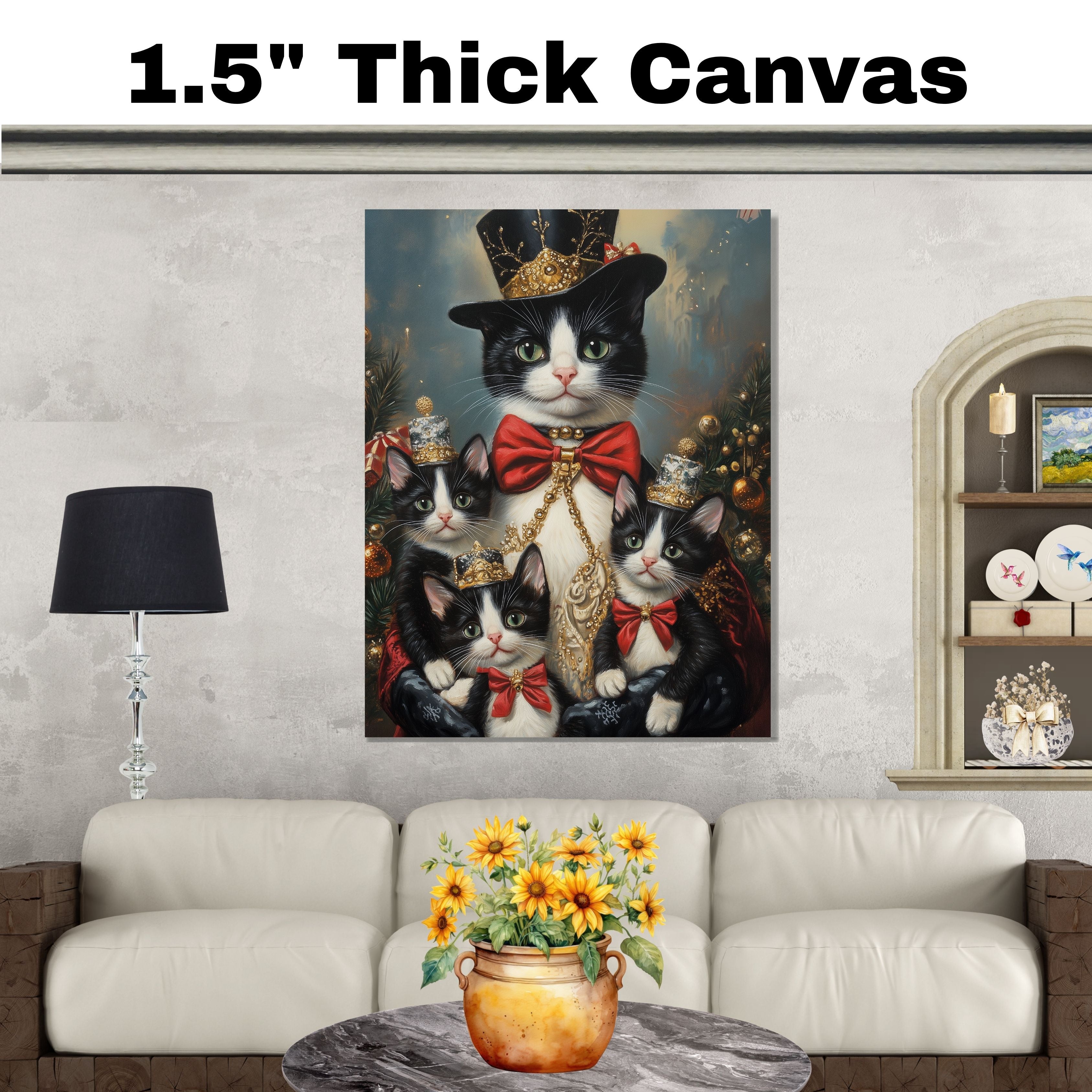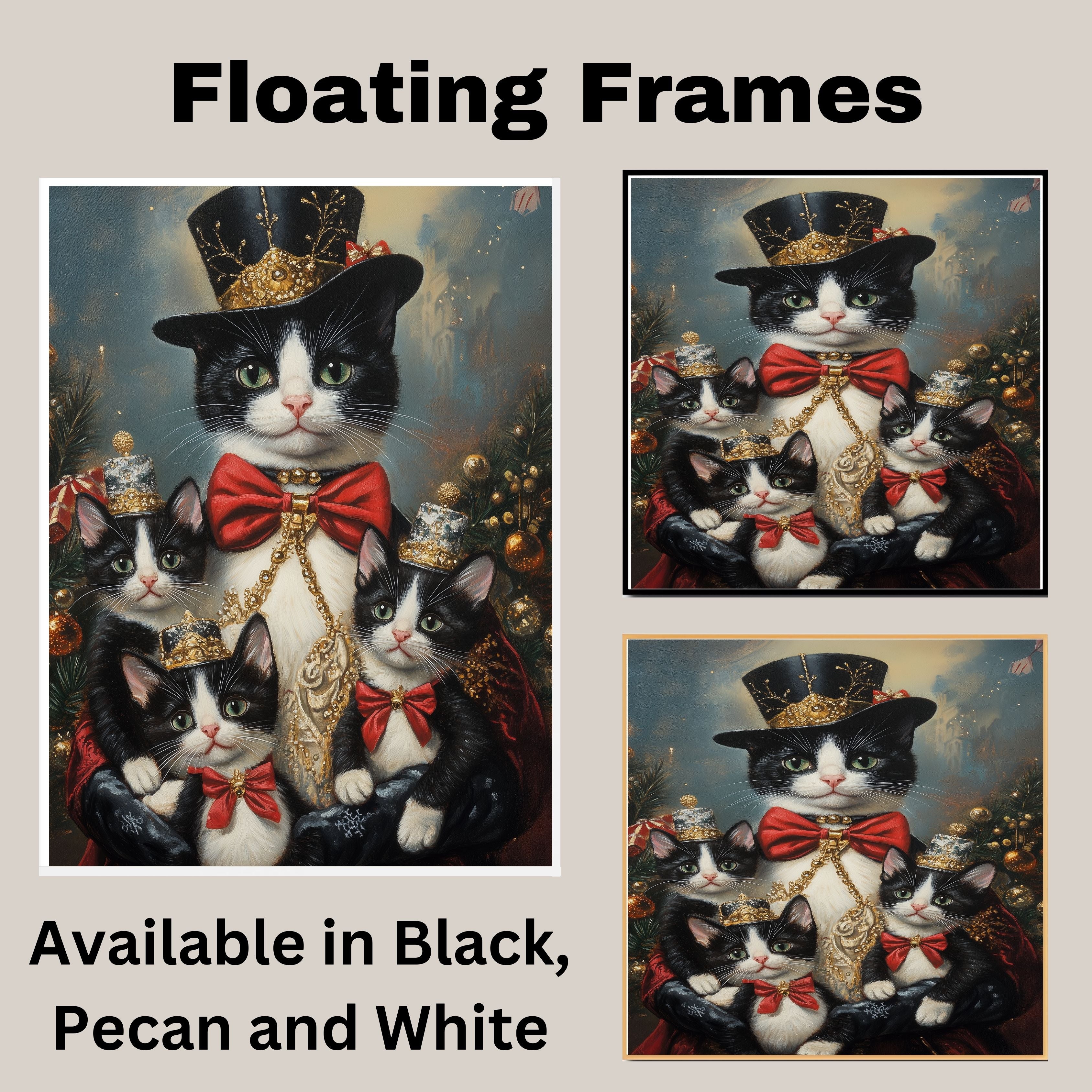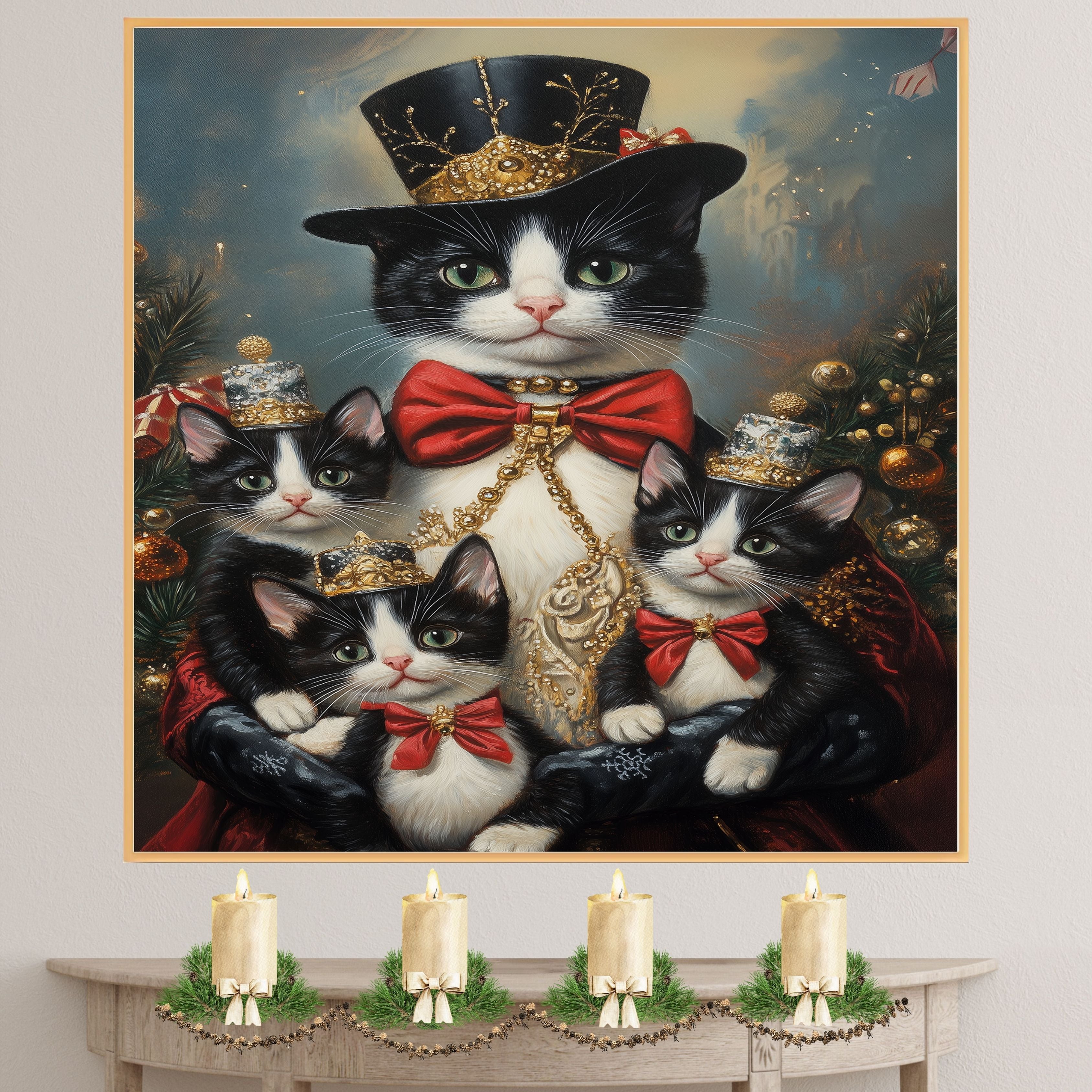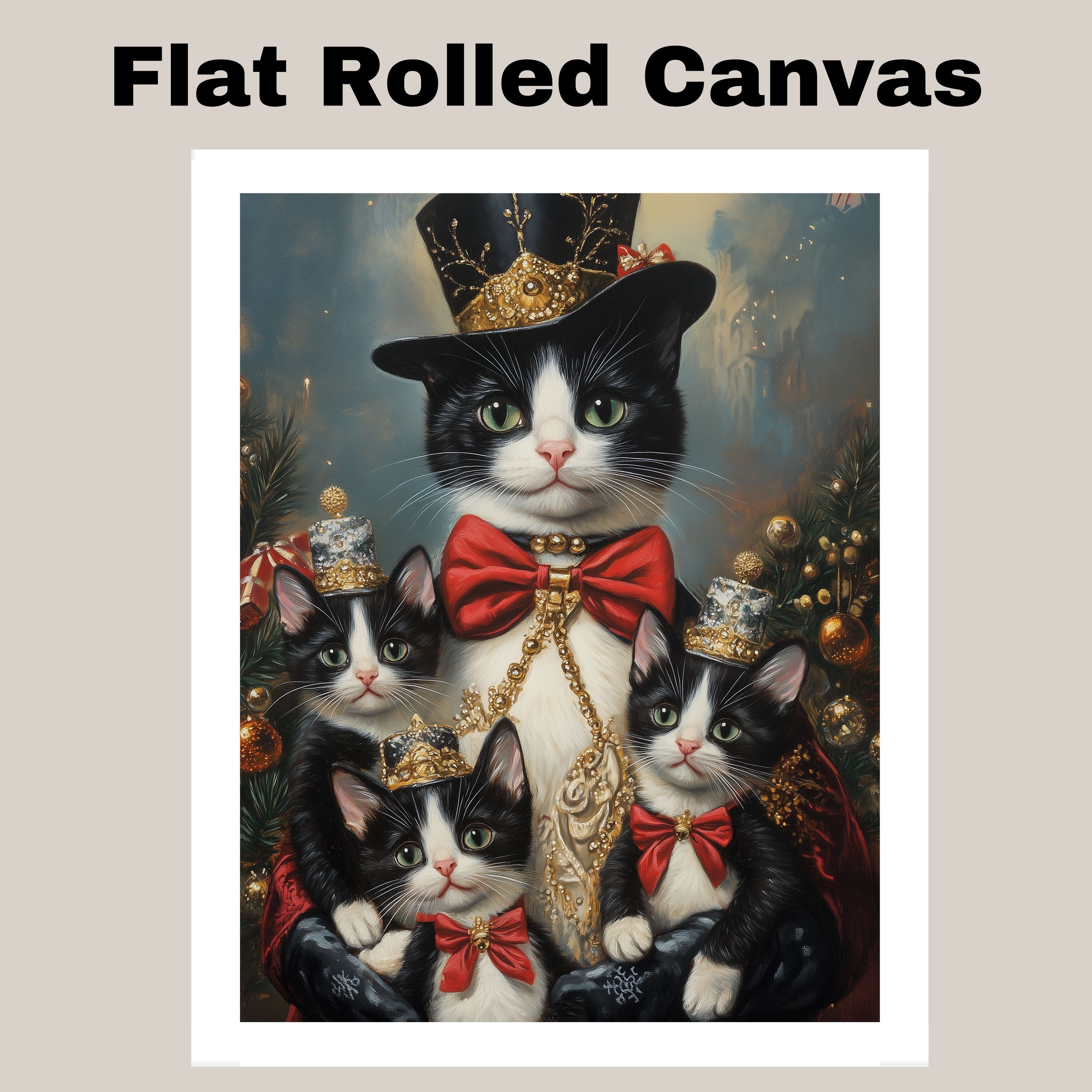 "Regal Yuletide Charm" showcases a tuxedo cat mom and her kittens dressed in elegant holiday attire, set against a festive, Victorian-inspired backdrop. This heartwarming scene exudes seasonal grace and holiday magic, making it a perfect addition to Christmas decor. Available on 1.5" thick canvas wrap, floating framed canvas, or flat rolled canvas.