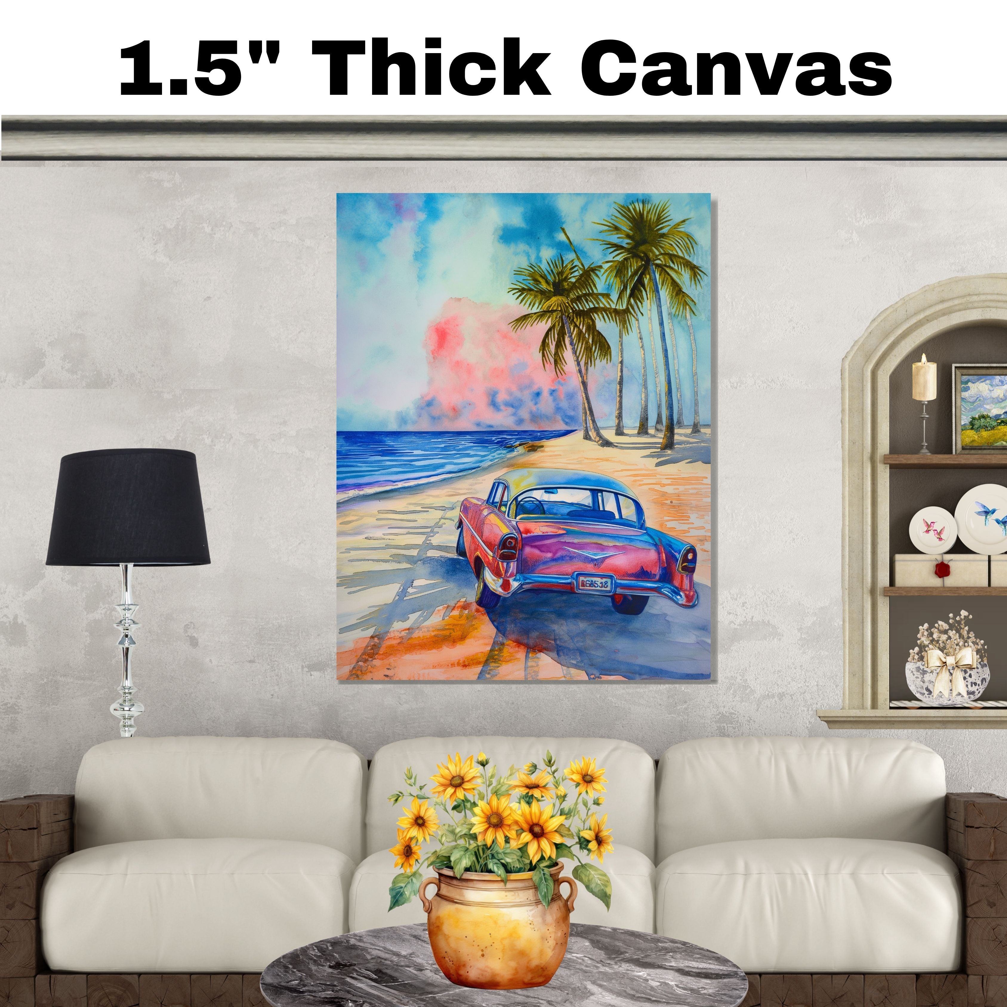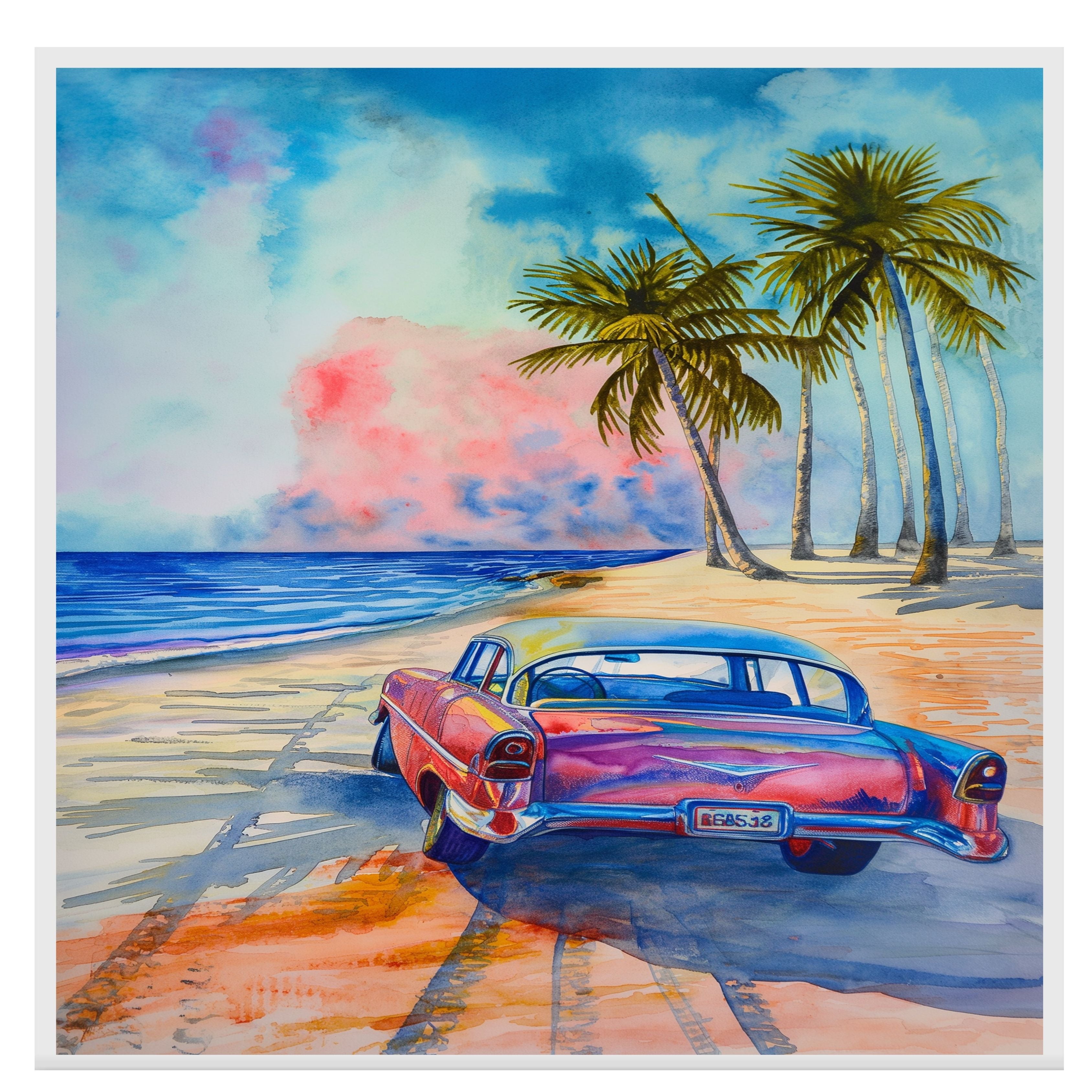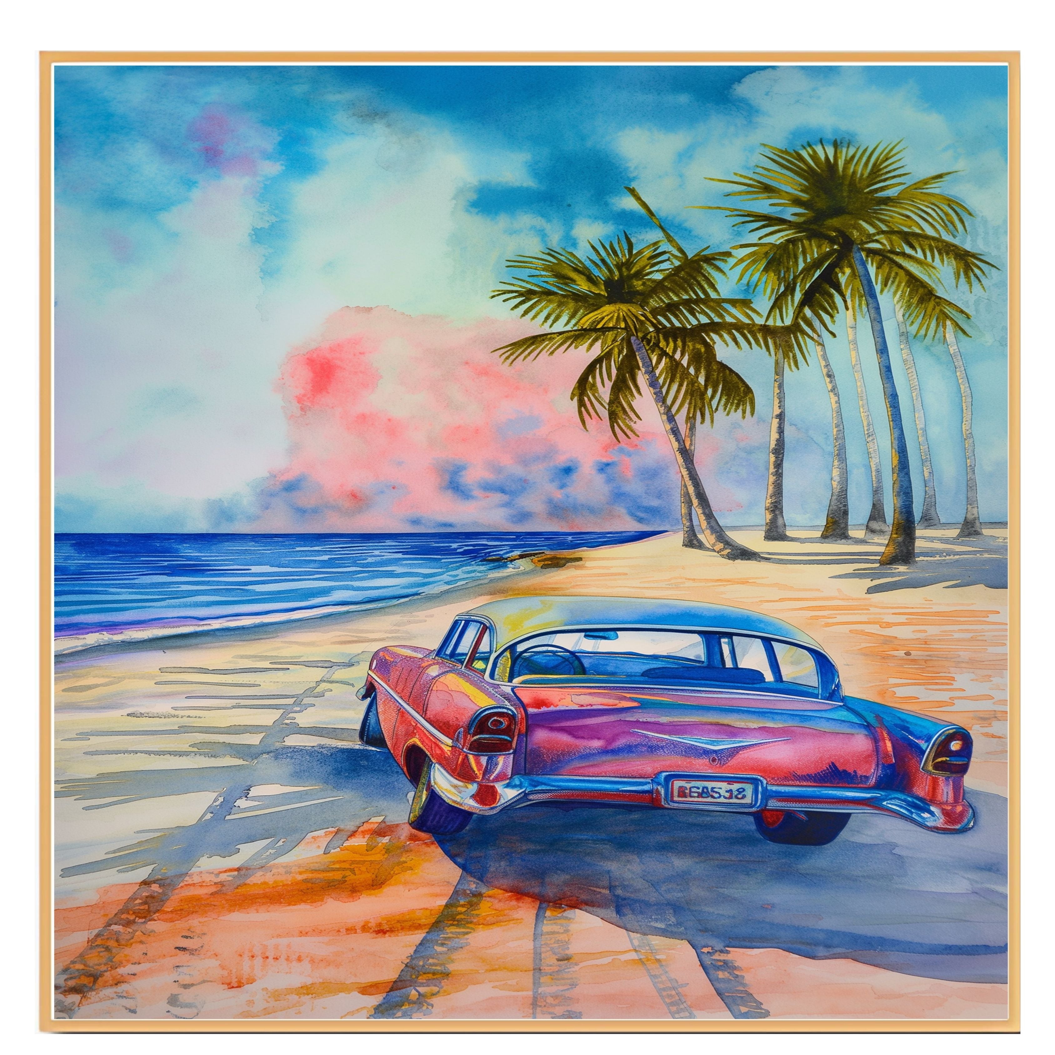 Capture the spirit of endless summer with this vibrant watercolor featuring a vintage car cruising a beach road lined with palm trees. The bold hues and dreamy ocean sky create a nostalgic, tropical escape. Perfect for fans of classic cars, beach life, and vibrant coastal scenes.