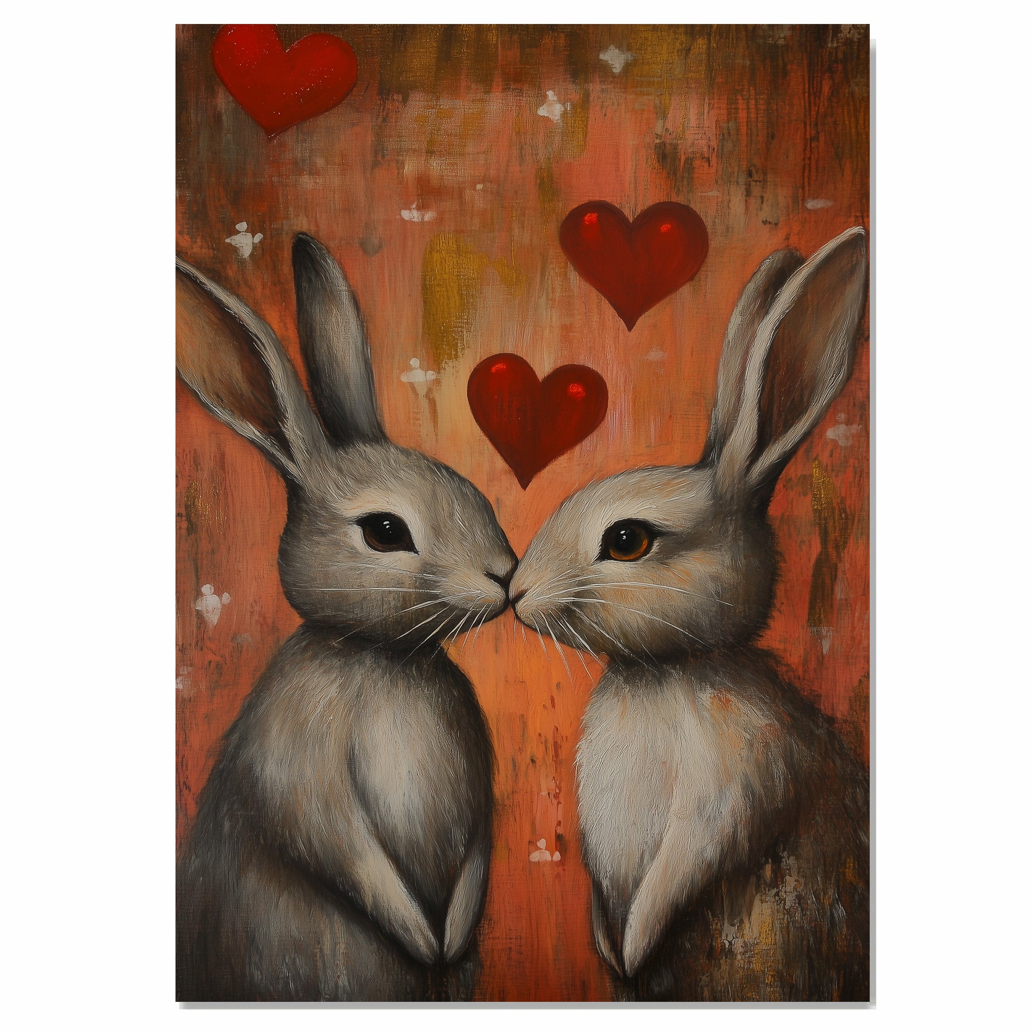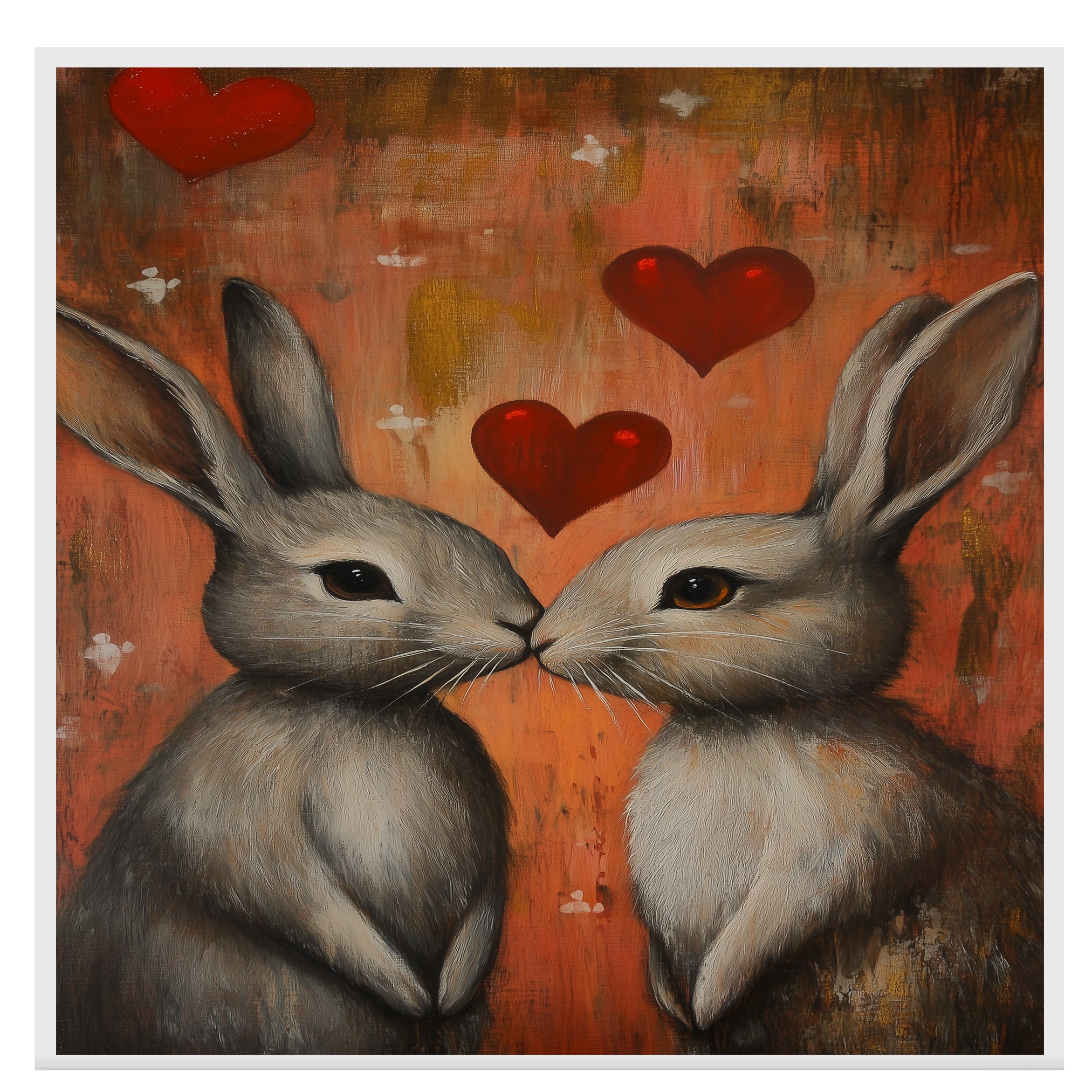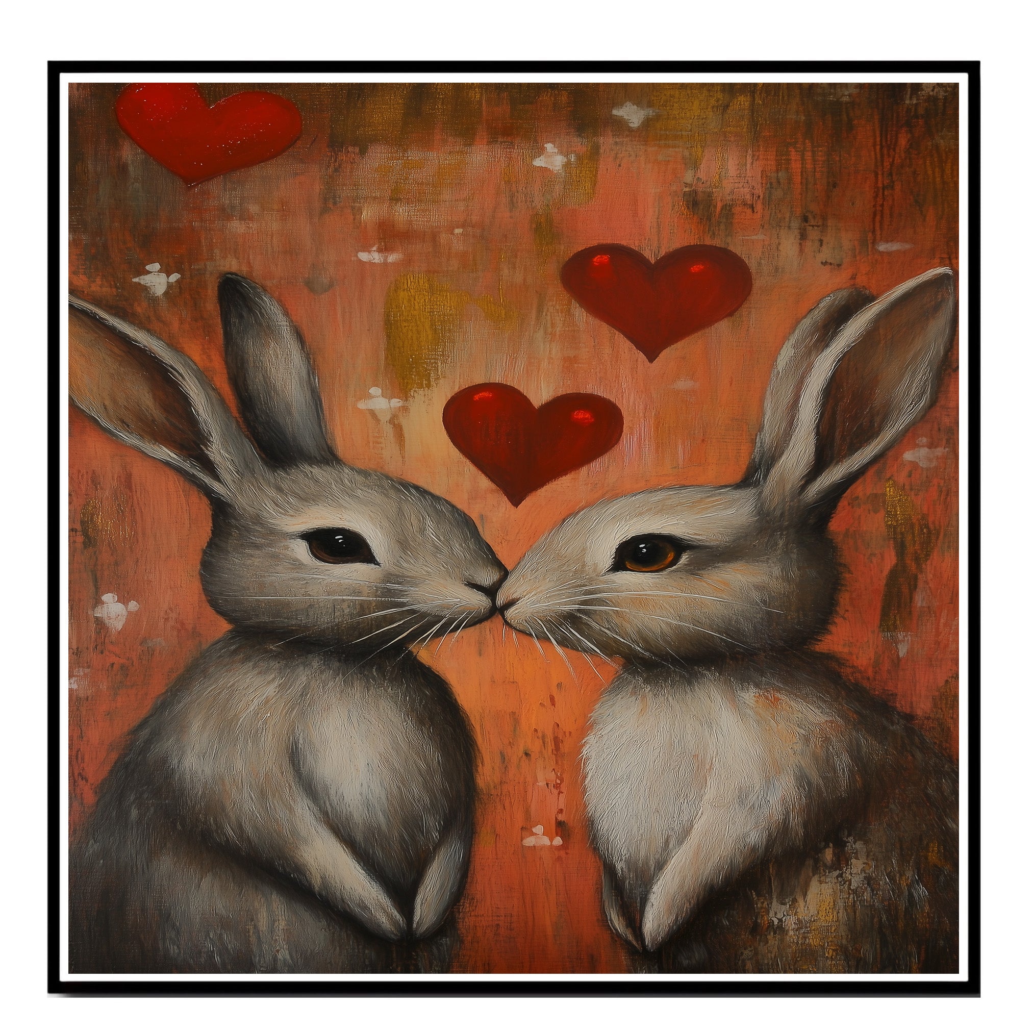 Bring warmth and love to your space with this heartwarming painting of two bunnies sharing a sweet nose kiss under floating red hearts. Set against a rustic textured background of deep oranges and earthy tones, this artwork is perfect for cozy home decor, animal lovers, or heartfelt gift giving.