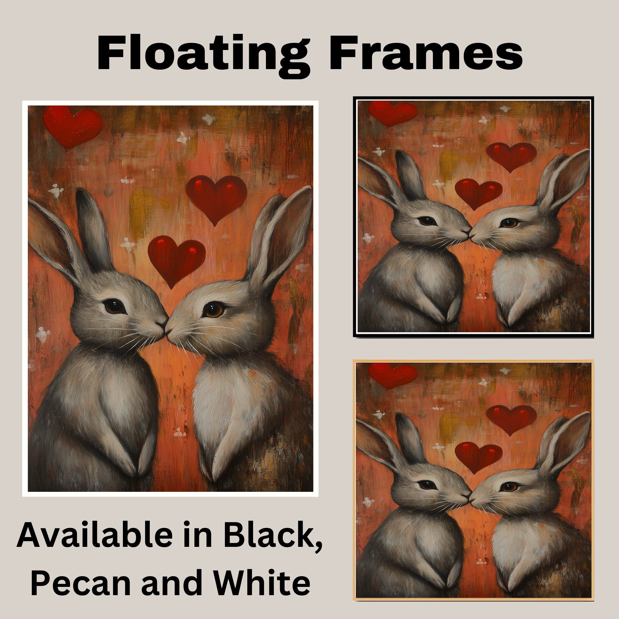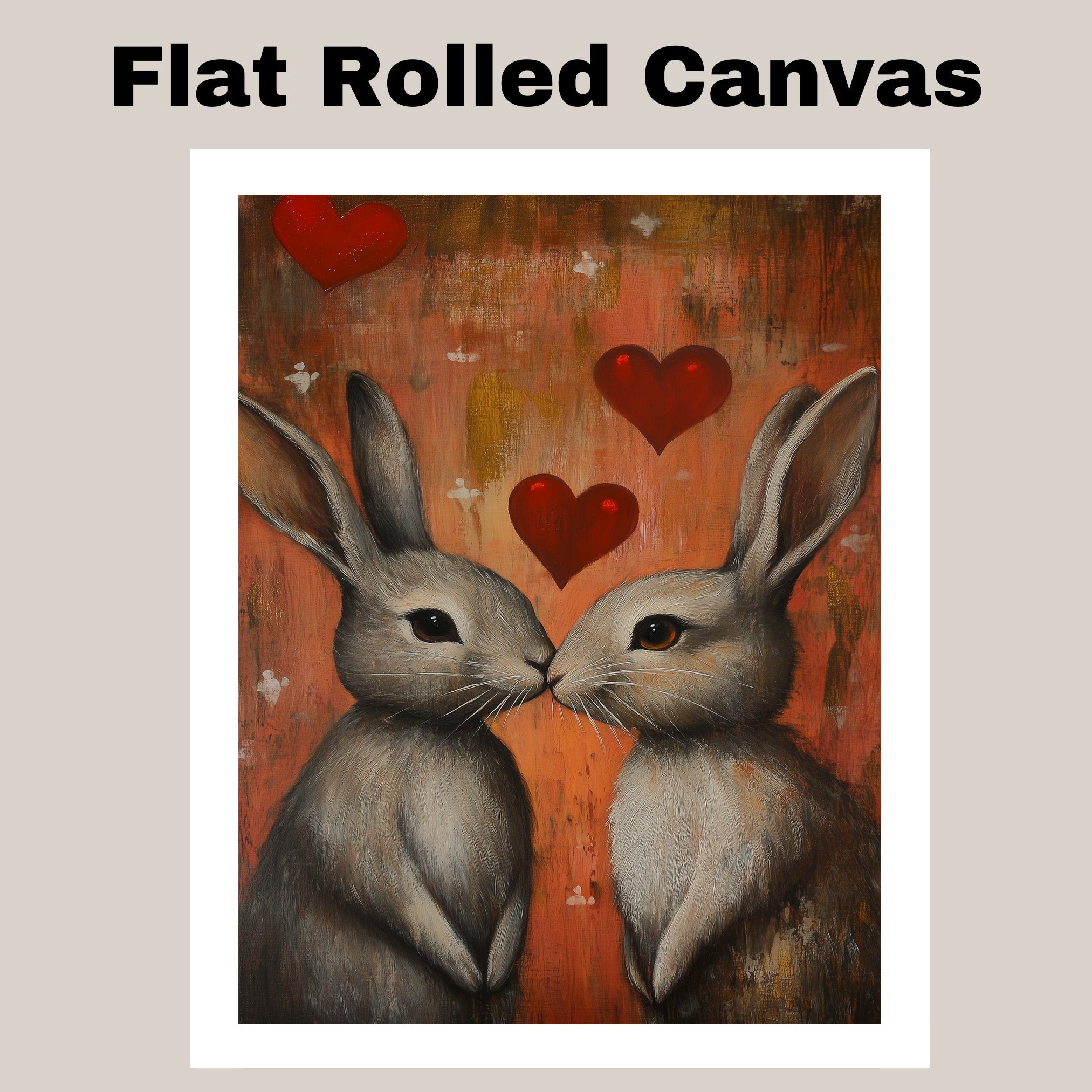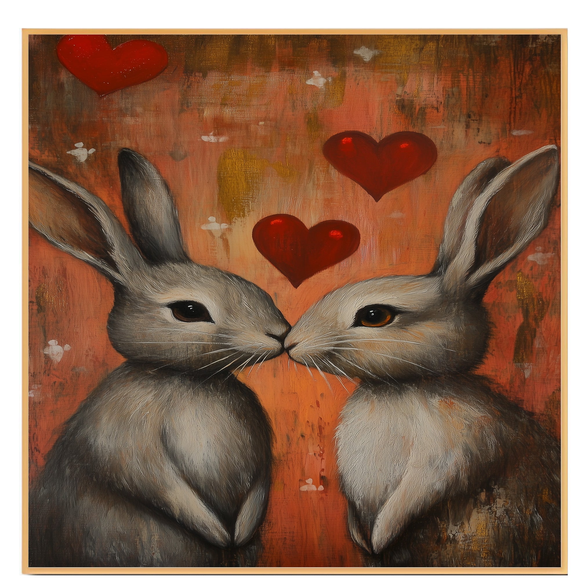 Bring warmth and love to your space with this heartwarming painting of two bunnies sharing a sweet nose kiss under floating red hearts. Set against a rustic textured background of deep oranges and earthy tones, this artwork is perfect for cozy home decor, animal lovers, or heartfelt gift giving.