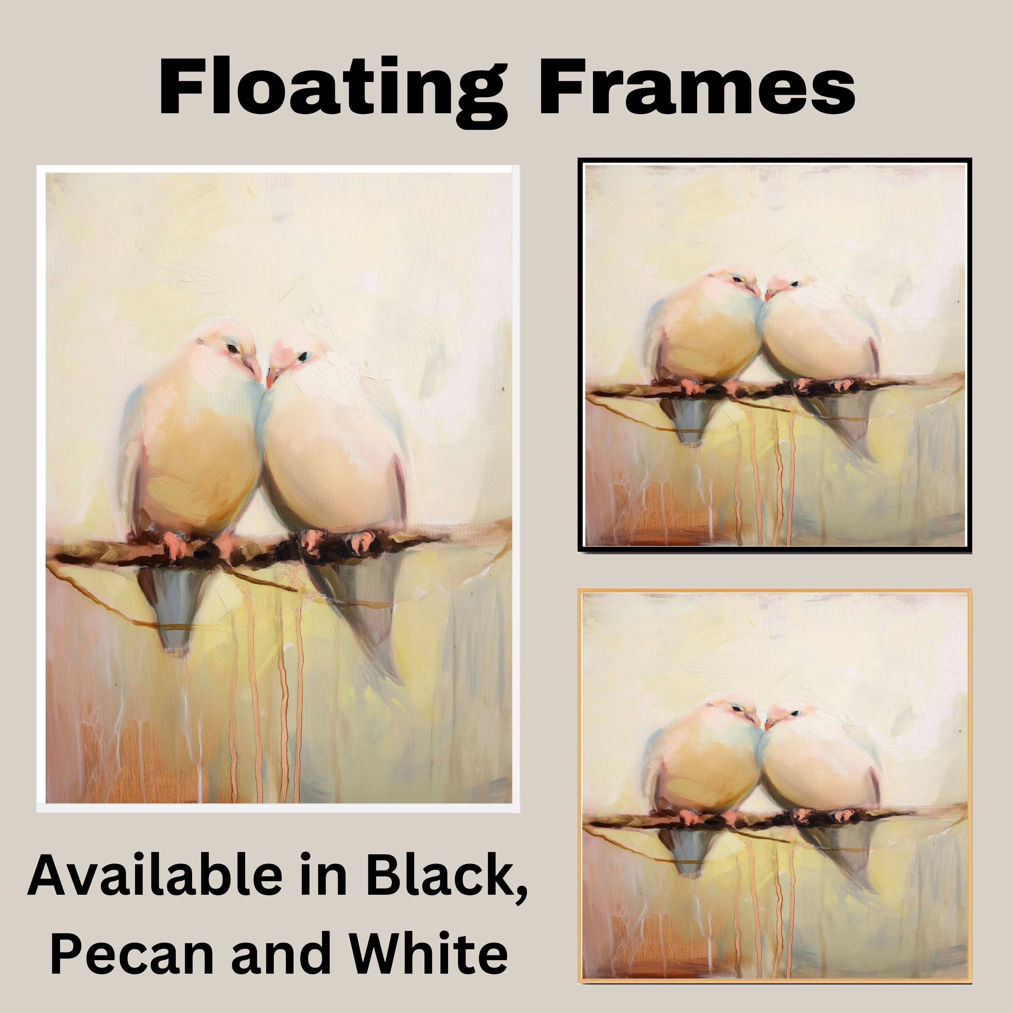 1.5" Thick Floating Framed Canvas: Available in Black, Pecan, and White Grain. Durable shrink-resistant frame. Comes with easy-to-install hanging kits, ready for immediate display.