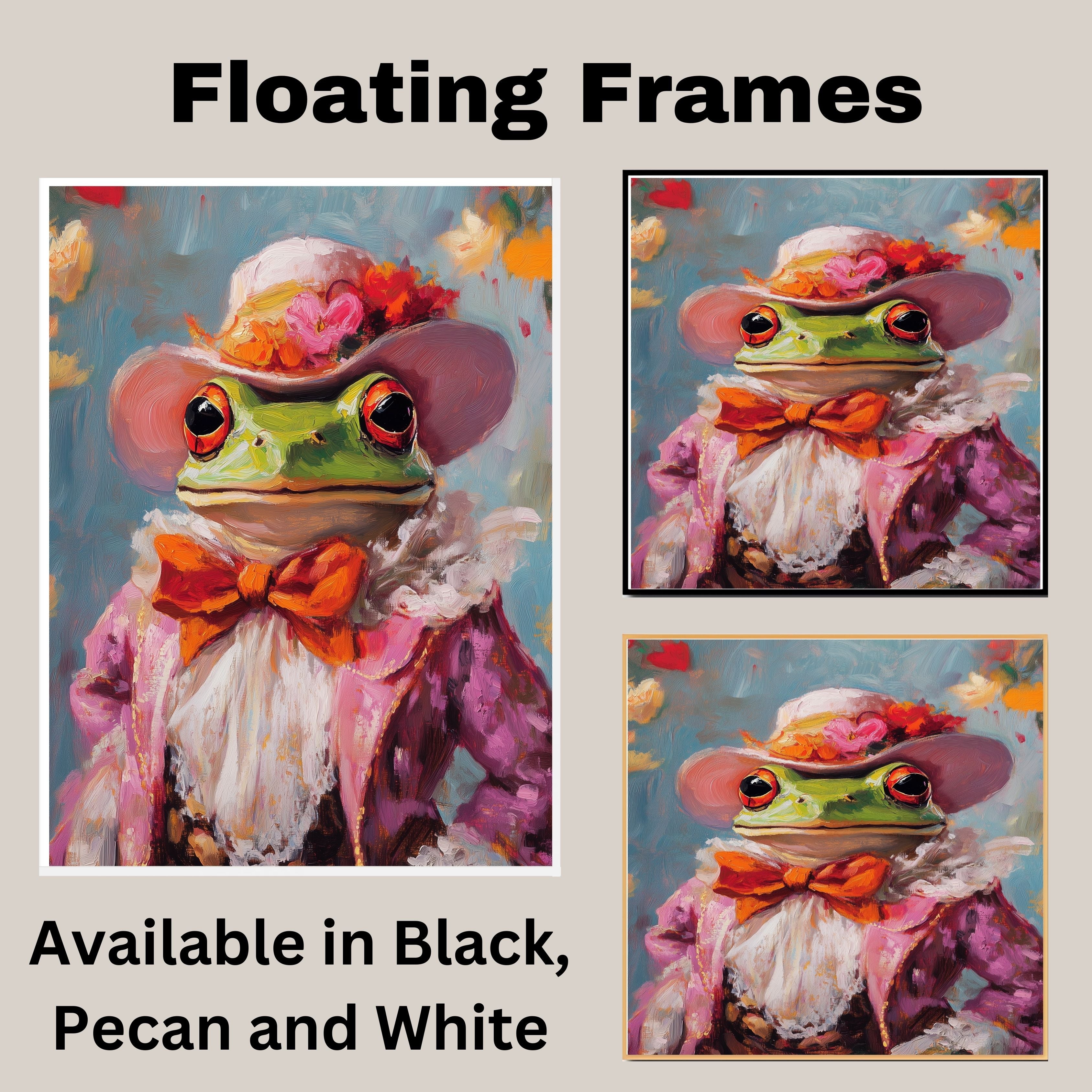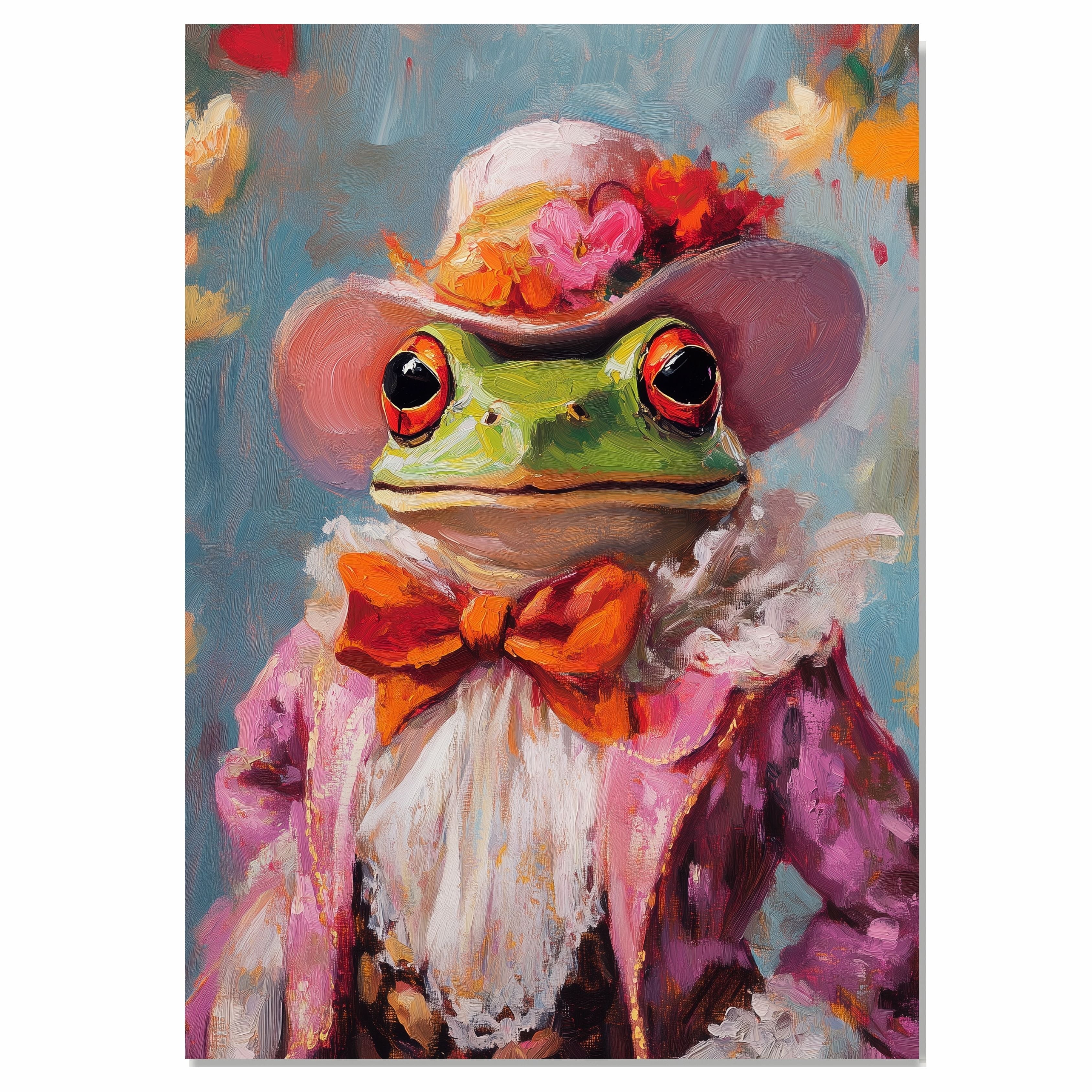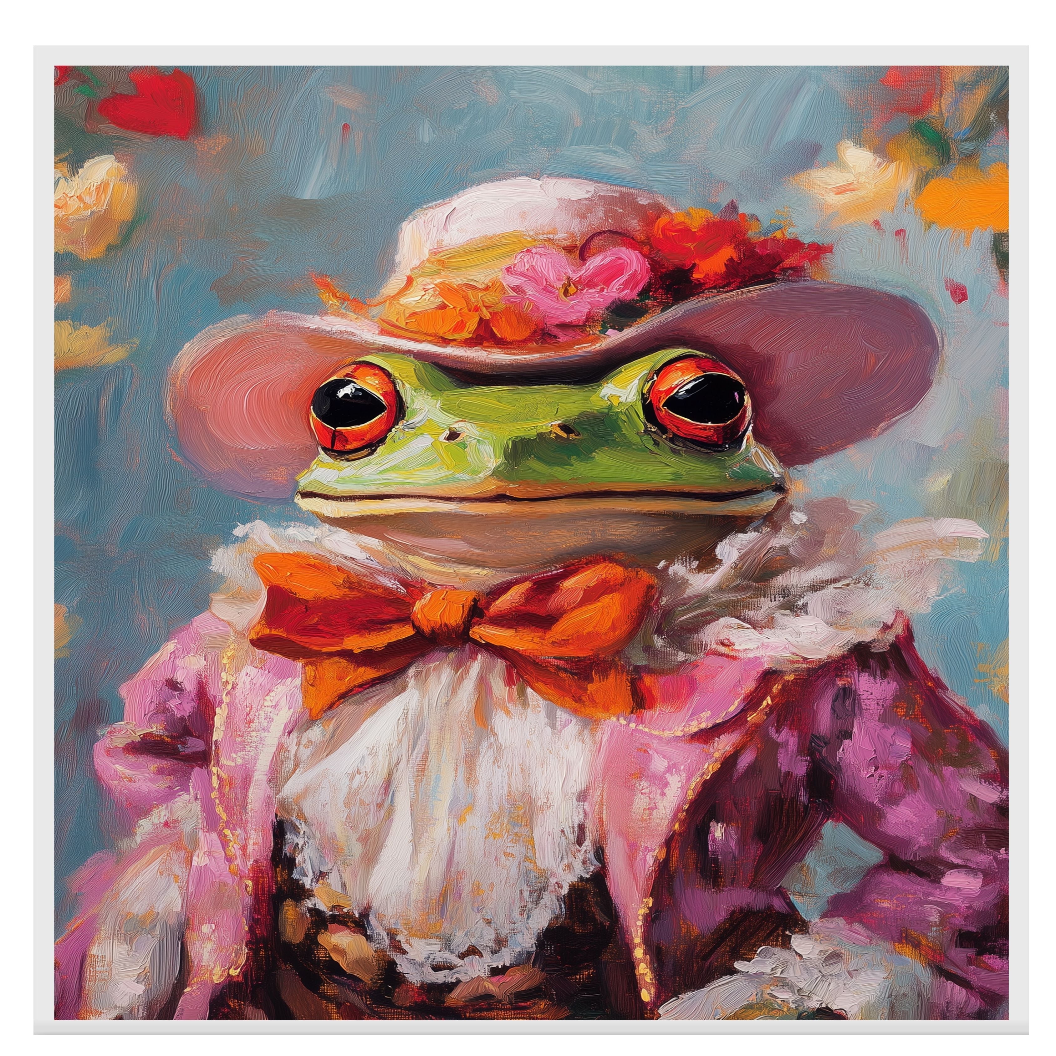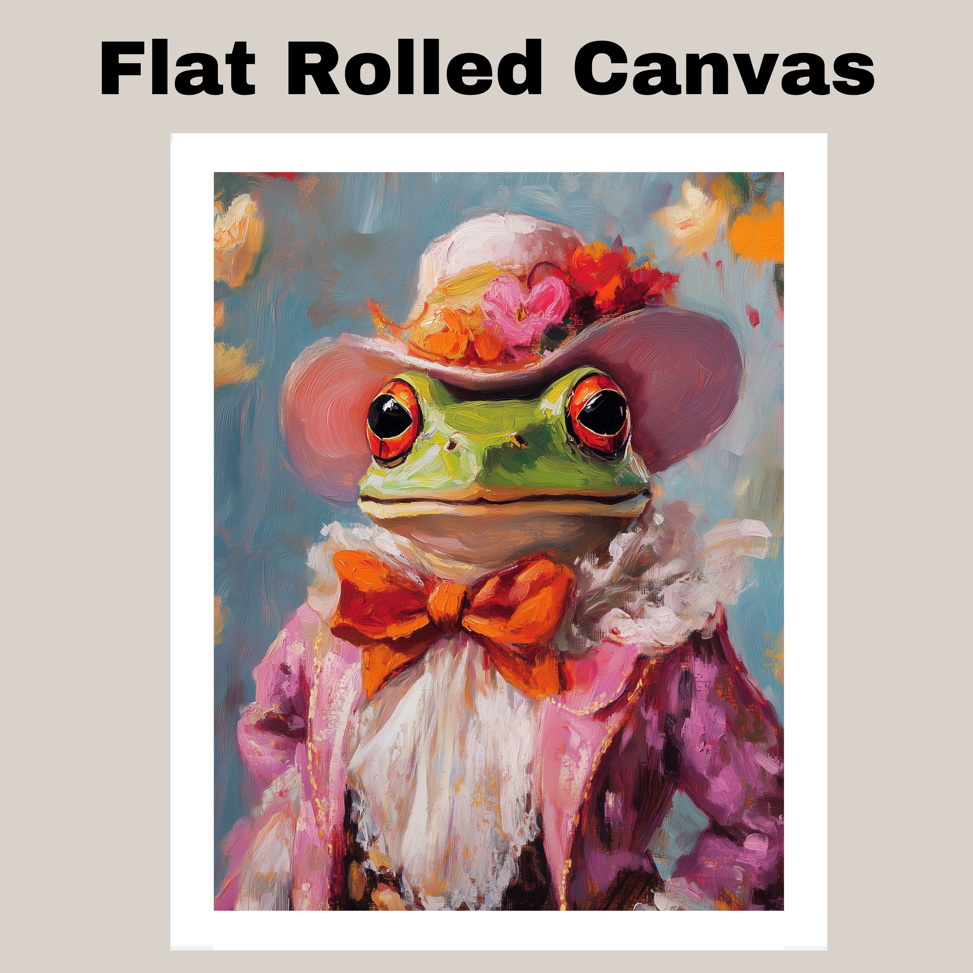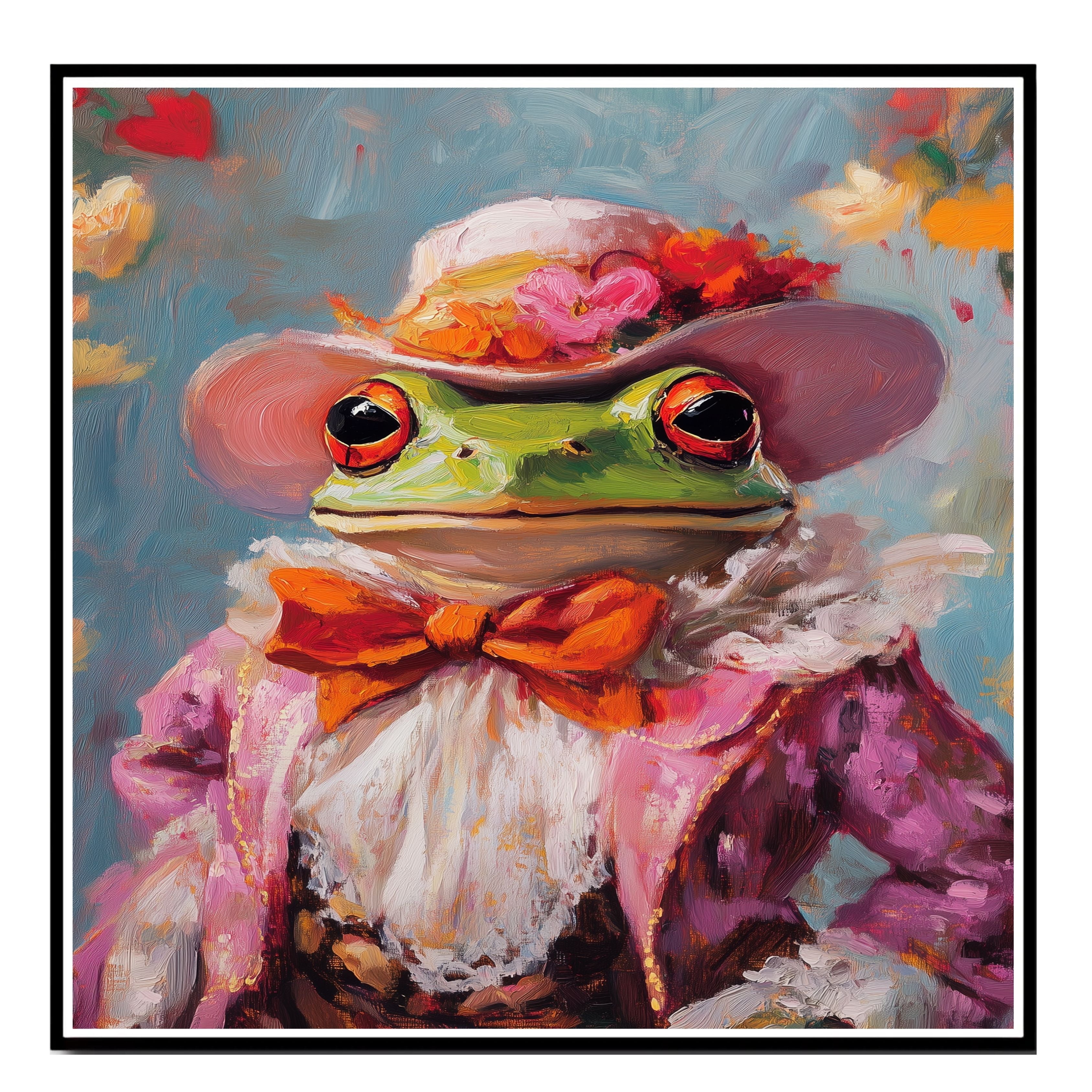 Our "Romantic Elegance" Canvas features a playful green frog dressed in a Victorian European suit and hat, effortlessly blending whimsy with sophistication. This heartfelt artwork captures the frogs charming character, exuding an aura of romance and timeless elegance. The delicate, vintage-inspired colors and intricate details create a delightful atmosphere, making it the perfect piece to add a touch of enchanting charm to any room. Available on a 1.5" thick canvas wrap, floating framed canvas, or flat rolled canvas, this delightful artwork makes a wonderful gift for frog lovers and those who appreciate playful, romantic art.