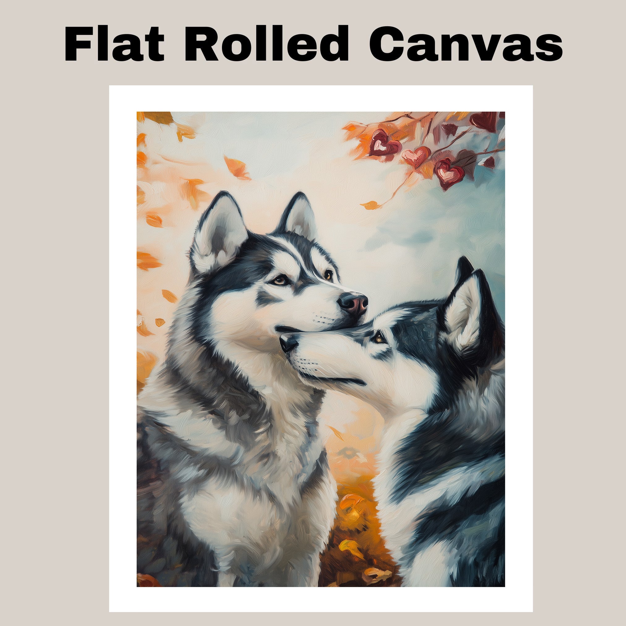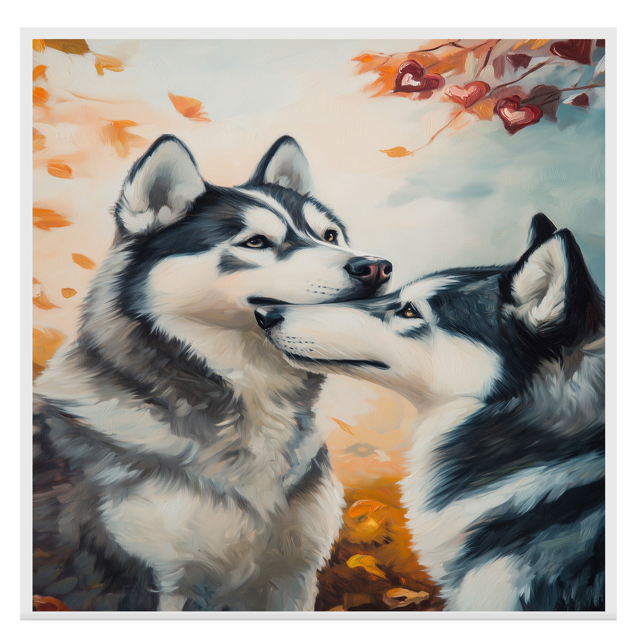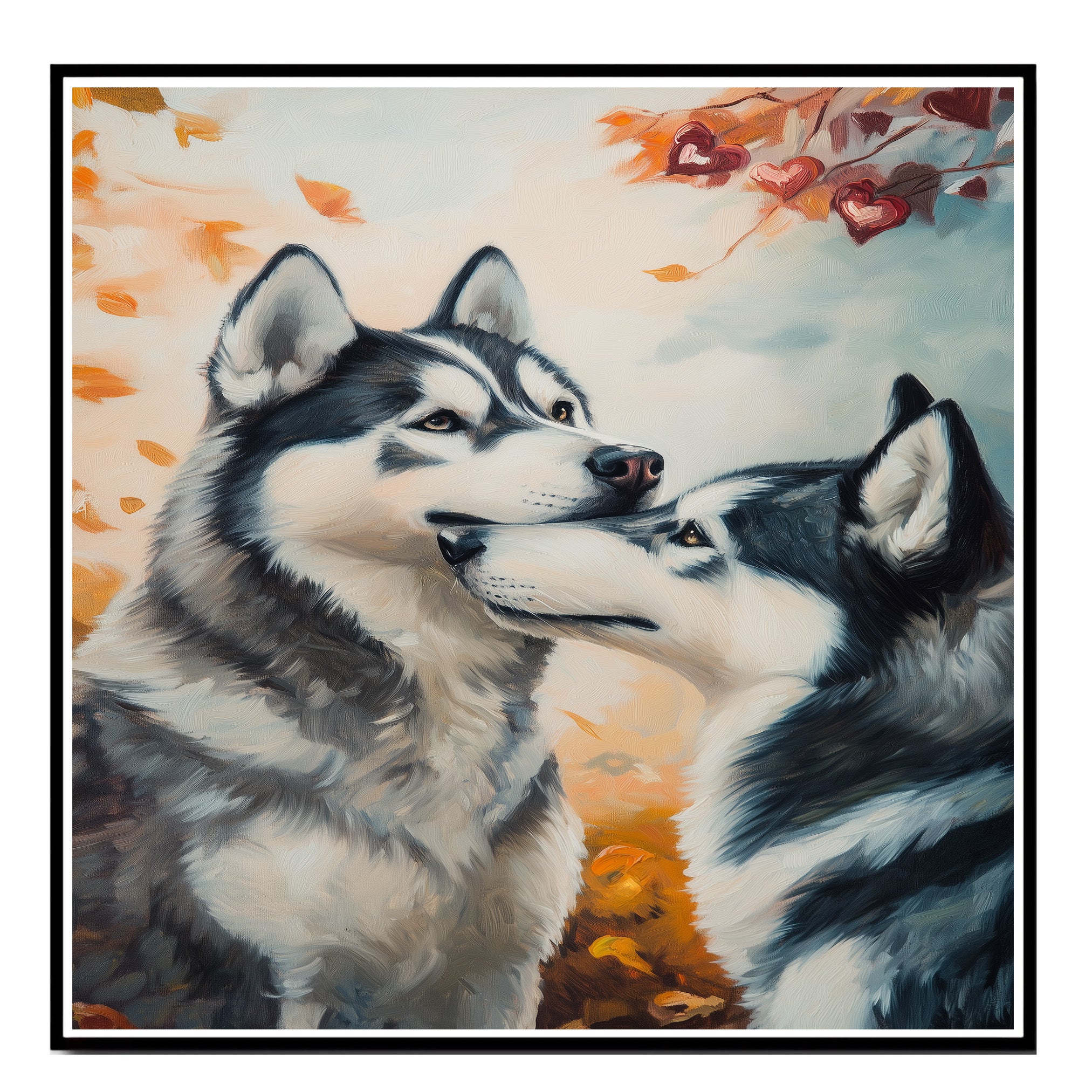 Celebrate love, loyalty, and the beauty of the seasons with this romantic painting of a Siberian Husky couple surrounded by falling leaves and delicate hearts. With soft brush strokes and warm autumn tones, this artwork adds rustic charm to any cozy home, pet lover’s space, or heartfelt gift collection.