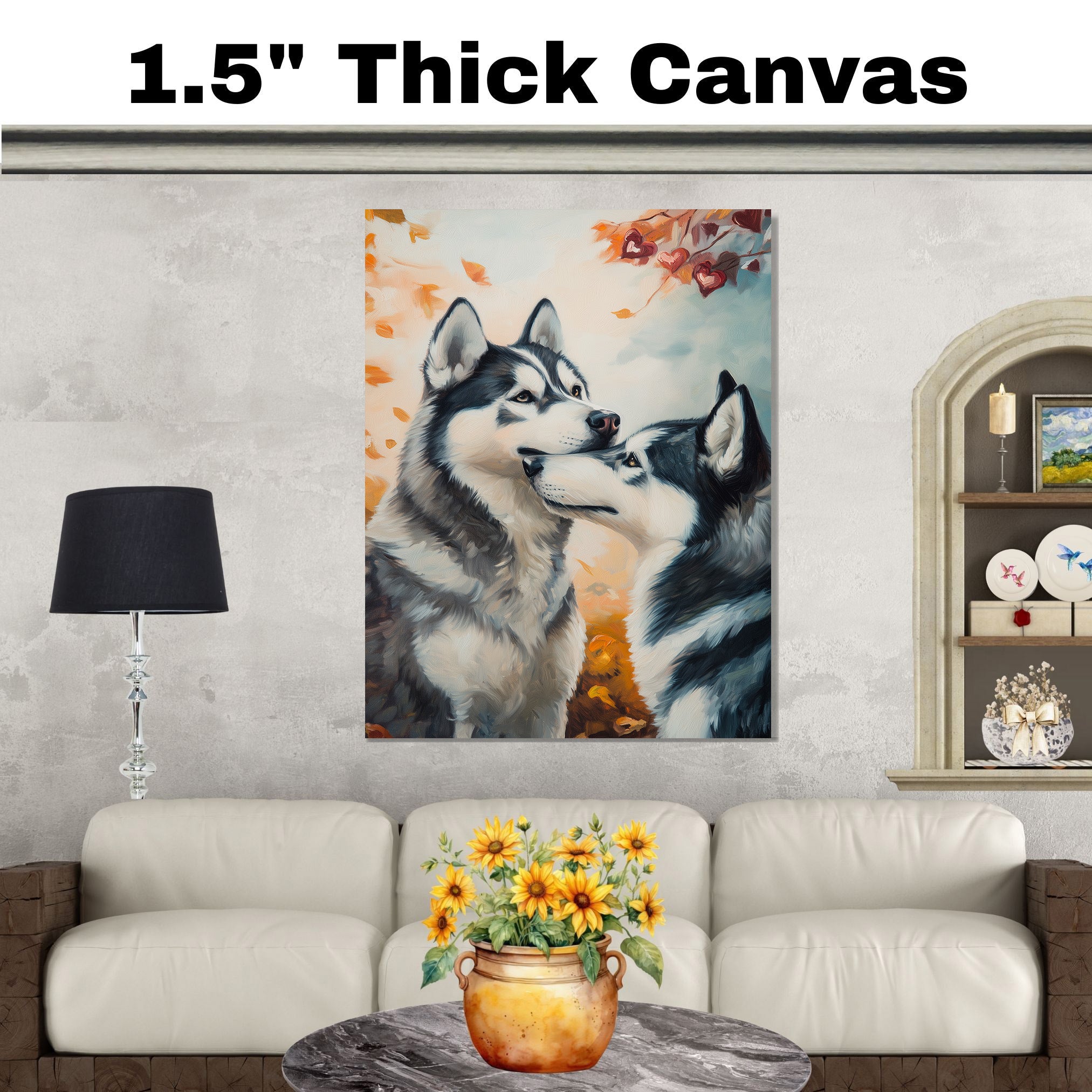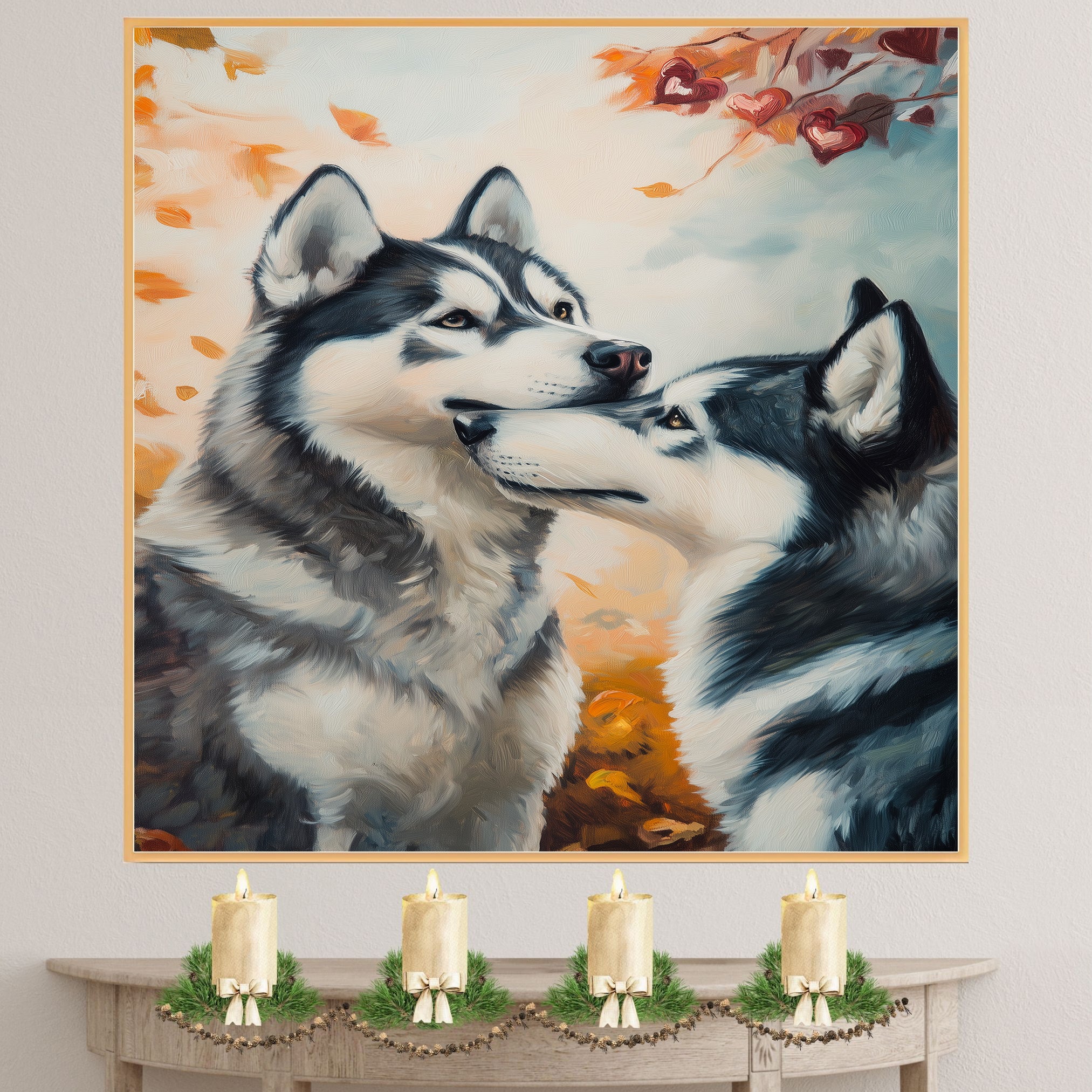 Romantic Siberian Husky Dog Couple with Hearts Fall Leaves Artwork for Dog Lovers Rustic Cozy Home and Gift Decor on Ready to Hang 1.5" Thick Canvas Wrap, Floating Framed Canvas, Flat Rolled Canvas