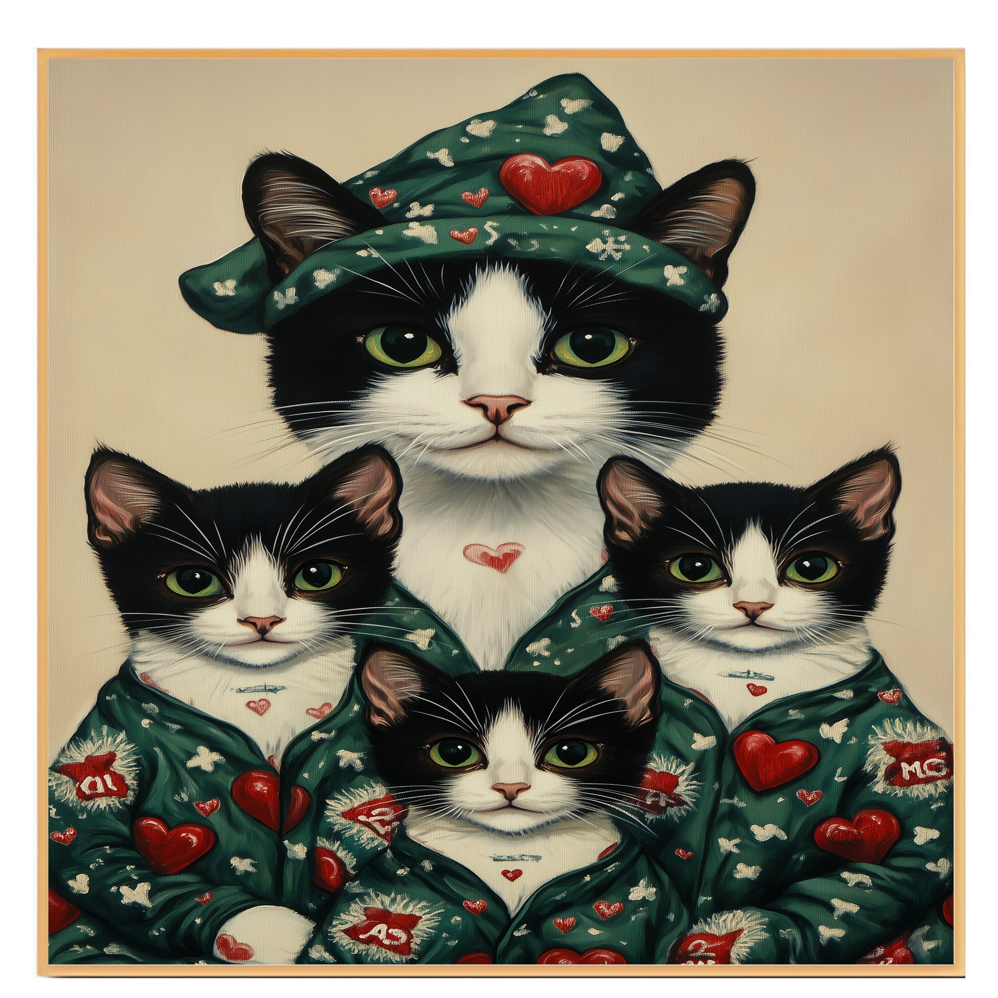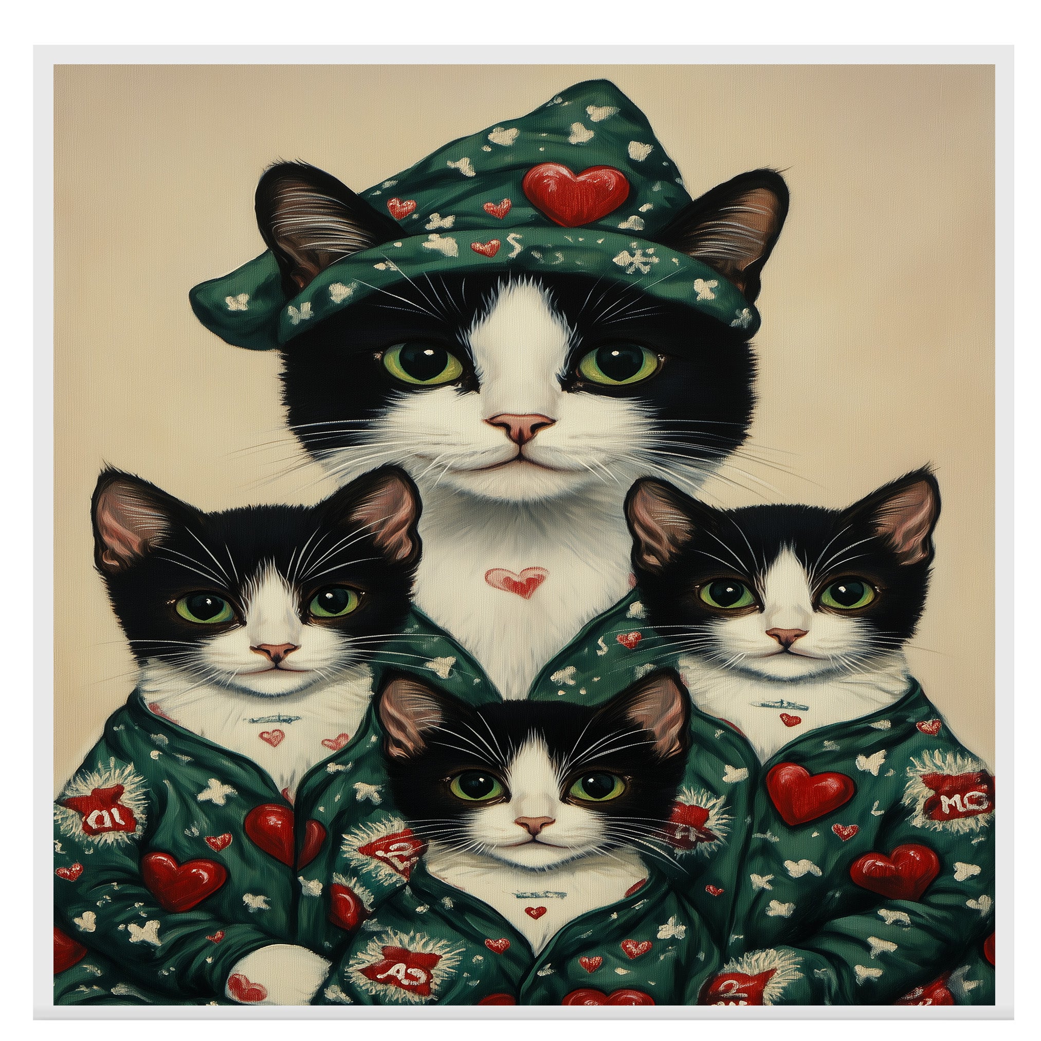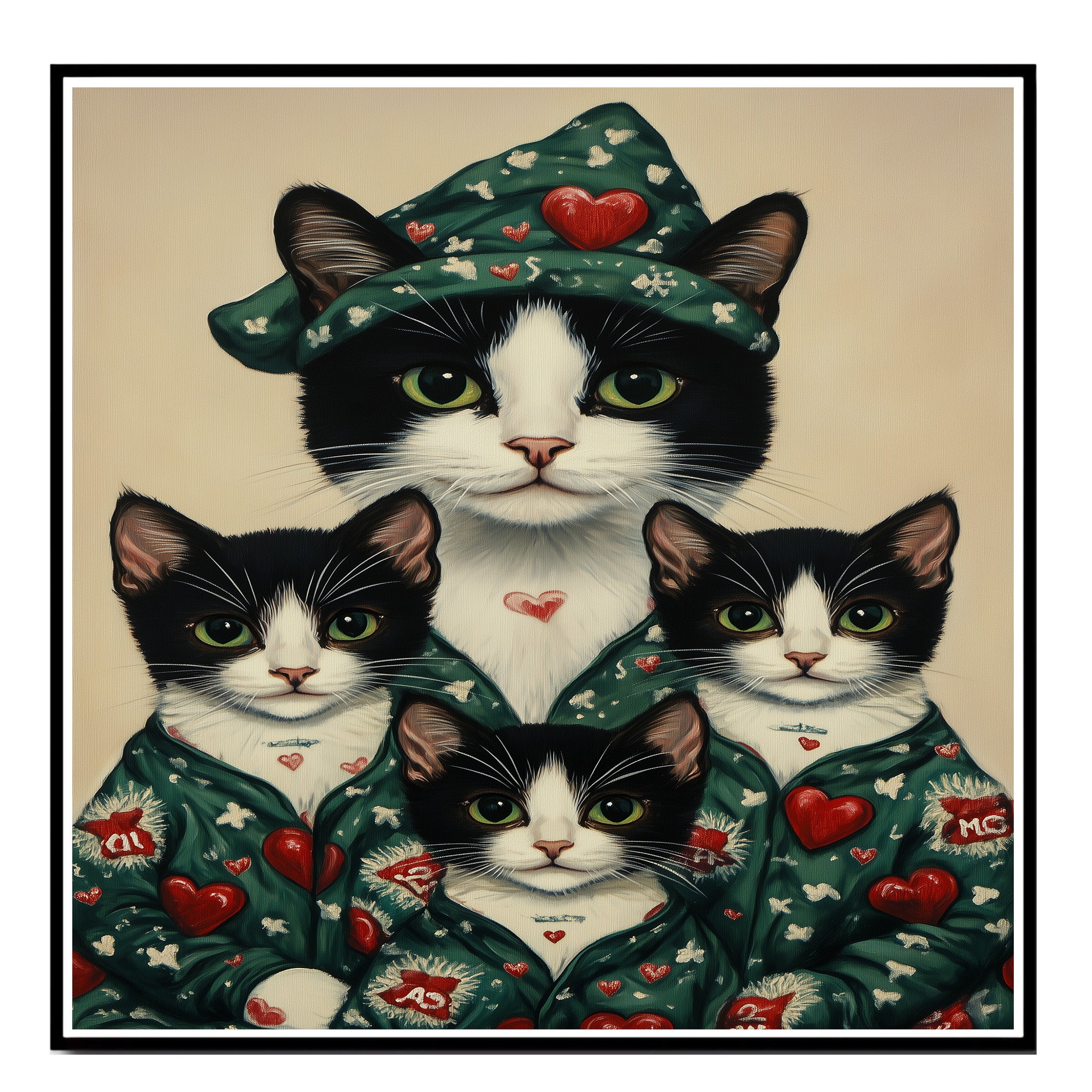 Celebrate love and companionship with this stunning artwork featuring two tuxedo cats against a vibrant red background filled with hearts. This romantic and playful painting captures the bond between two adorable cats, making it perfect for Valentine's Day, anniversaries, or everyday decor for cat lovers. A heartwarming addition to bedrooms, living rooms, and cozy corners.