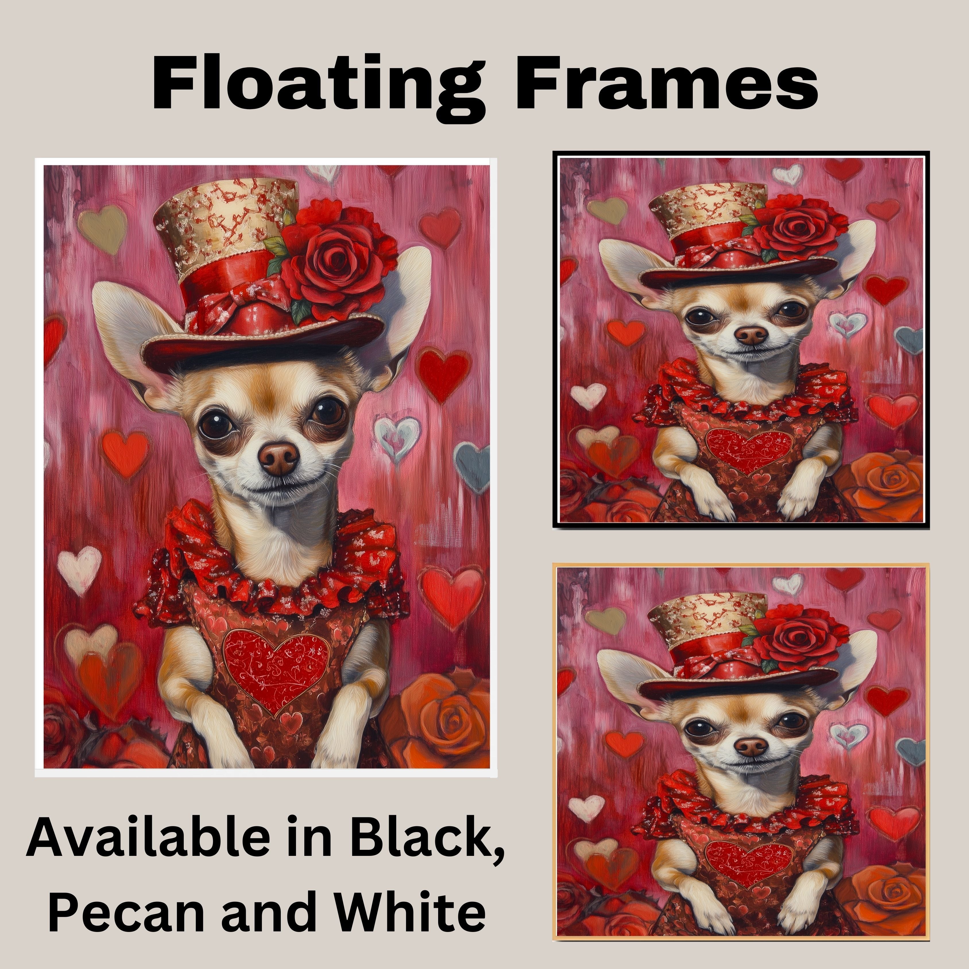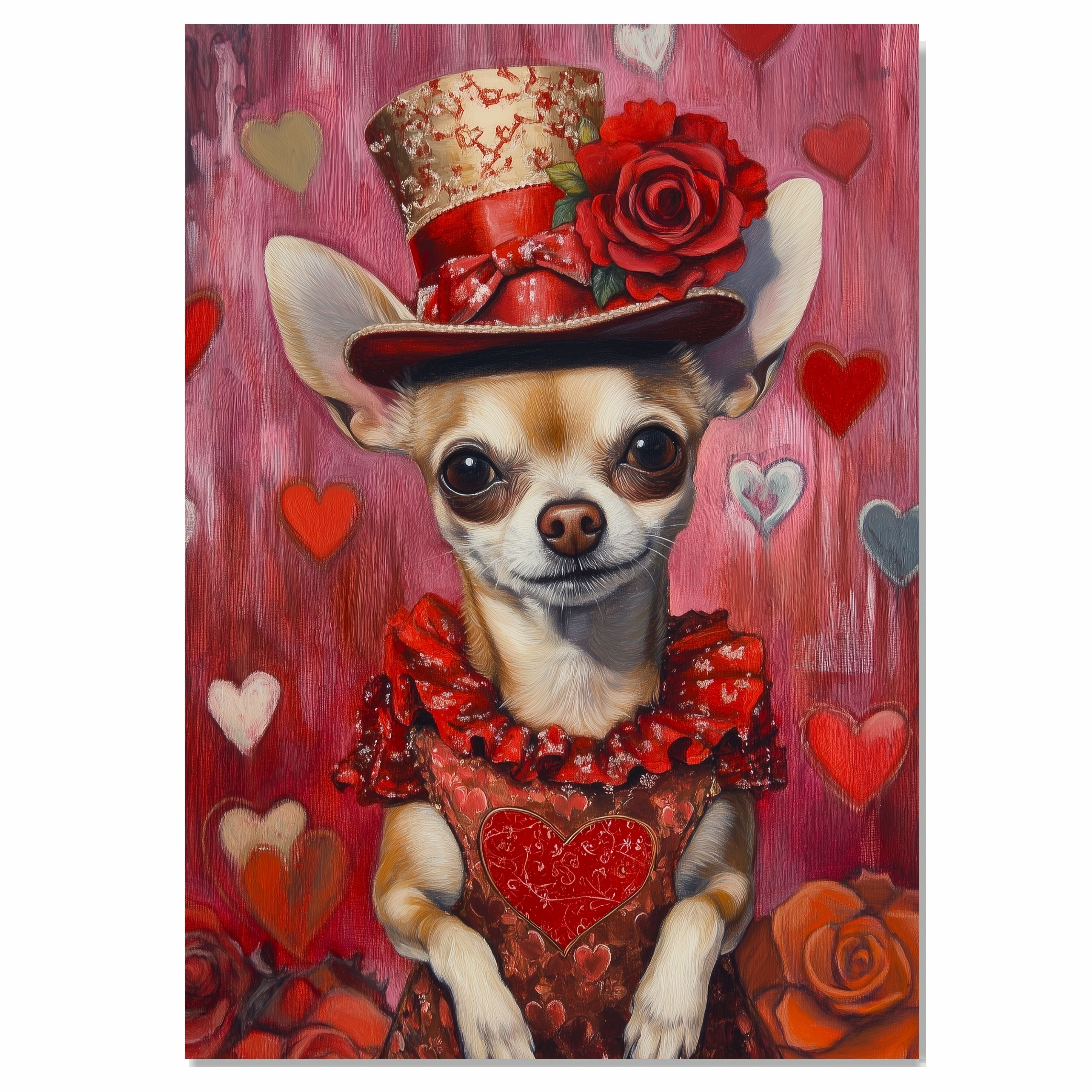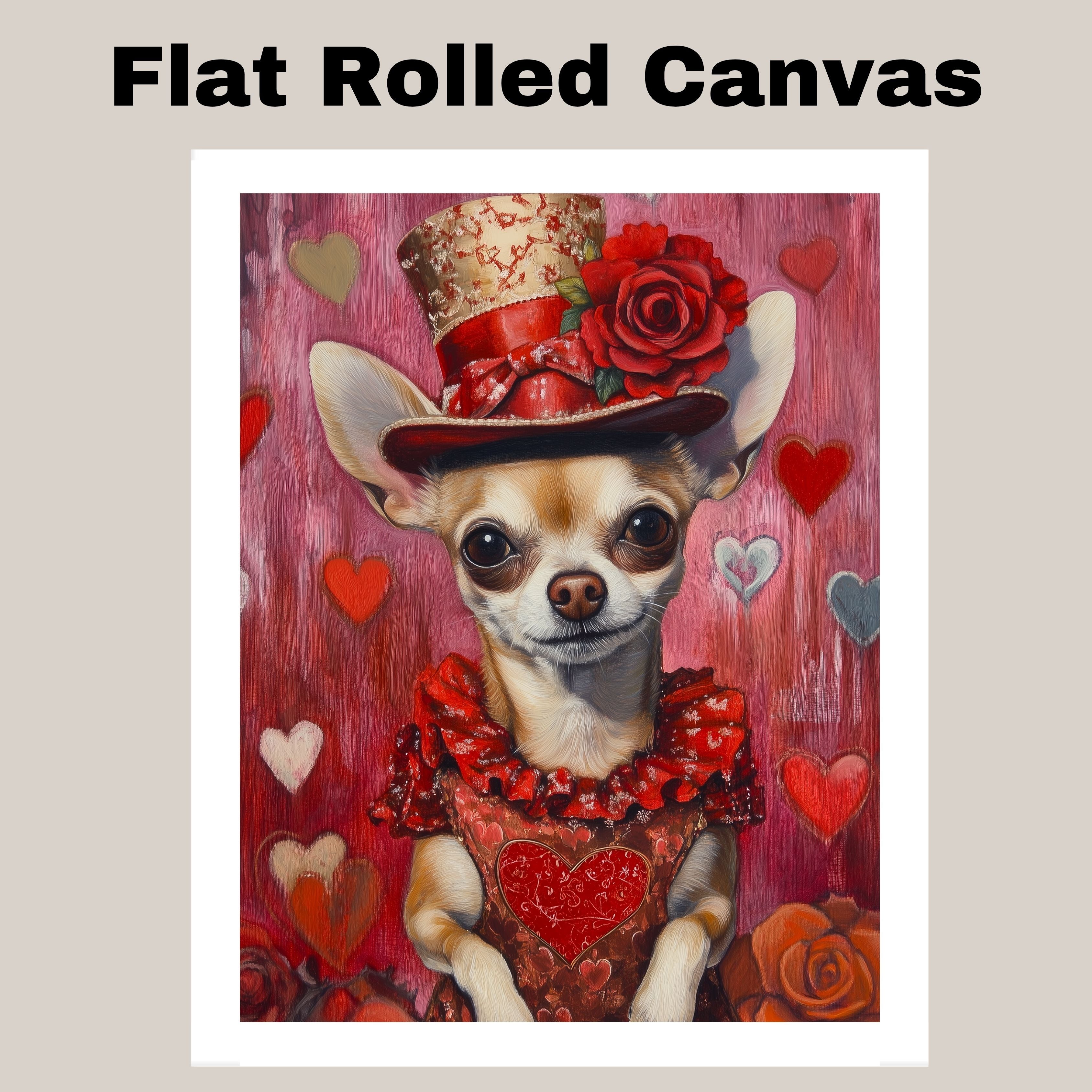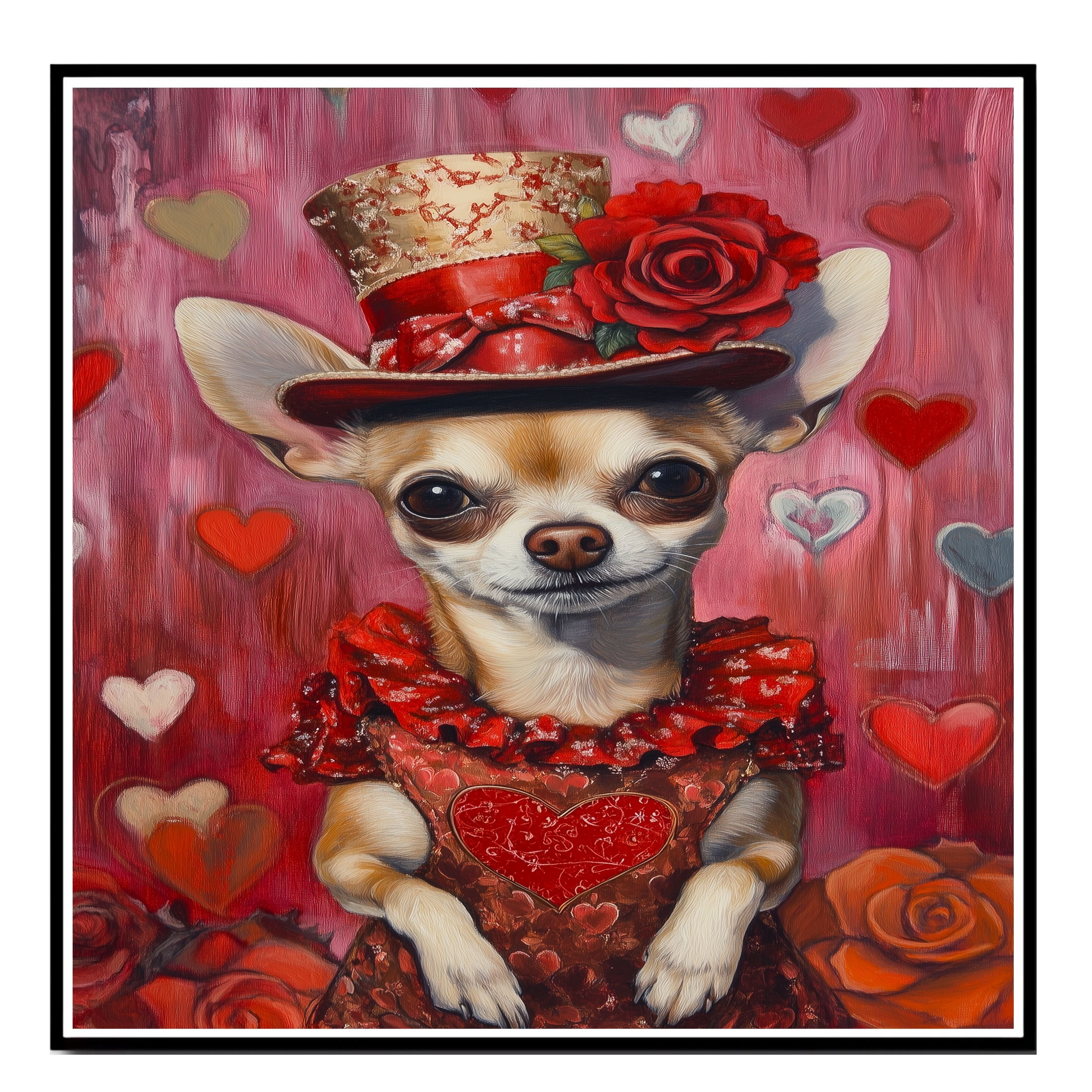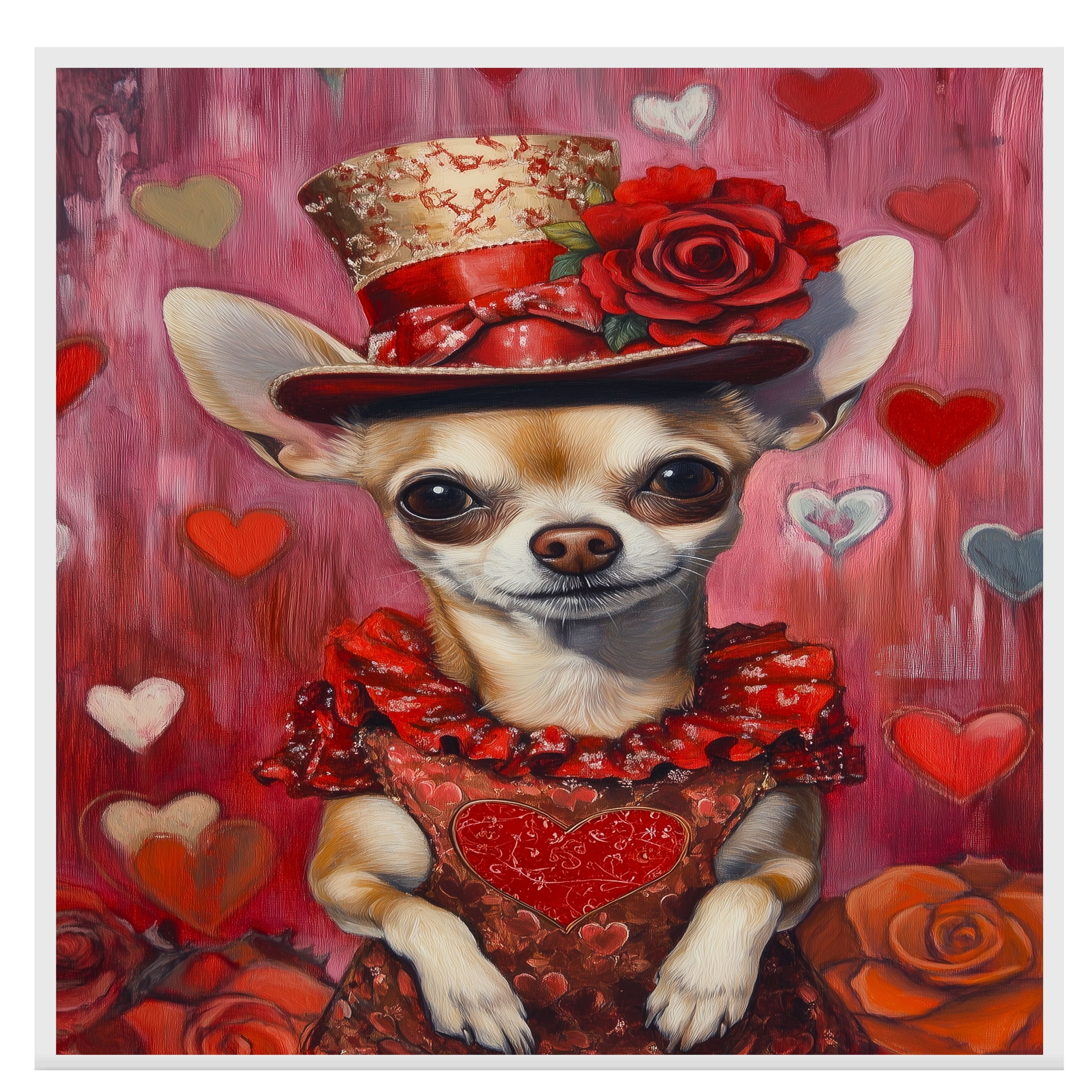 Our Elegant Devotion Canvas exudes timeless grace, featuring a poised Chihuahua adorned in a European-inspired red dress and matching hat, embodying charm and sophistication. With a heartfelt gaze, this refined portrait captures the essence of love and devotion, making it a captivating statement piece for any space. The rich hues and delicate details lend a romantic allure, evoking a sense of nostalgia and elegance. Available on a 1.5" thick canvas wrap, floating framed canvas, or as a flat rolled canvas, this exquisite artwork is perfect for dog lovers and those who appreciate classic beauty with a touch of sentiment.