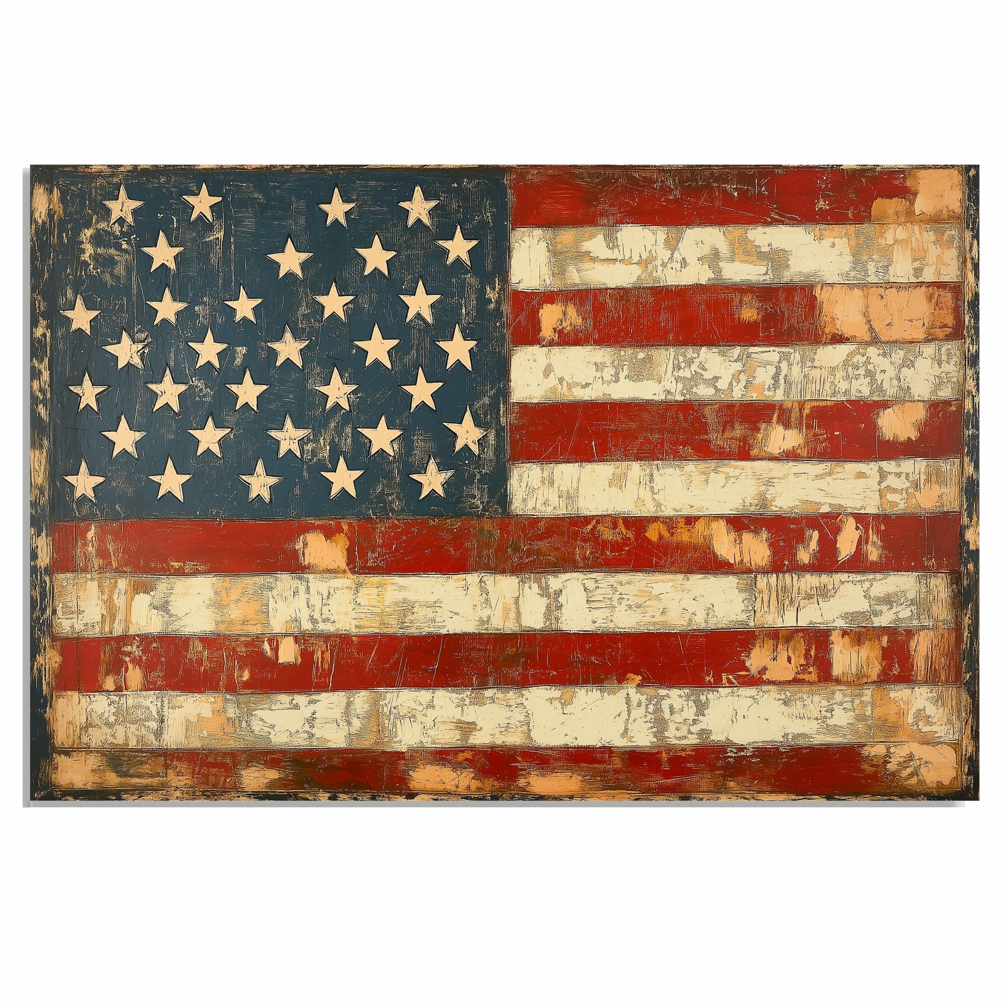 Celebrate American heritage with this bold folk art-style depiction of the U.S. flag. Featuring a rustic, distressed texture and muted red, white, and blue tones, this vintage-inspired piece evokes a timeless sense of patriotism. Perfect for adding classic Americana style to any setting, whether displayed year-round or during national holidays.