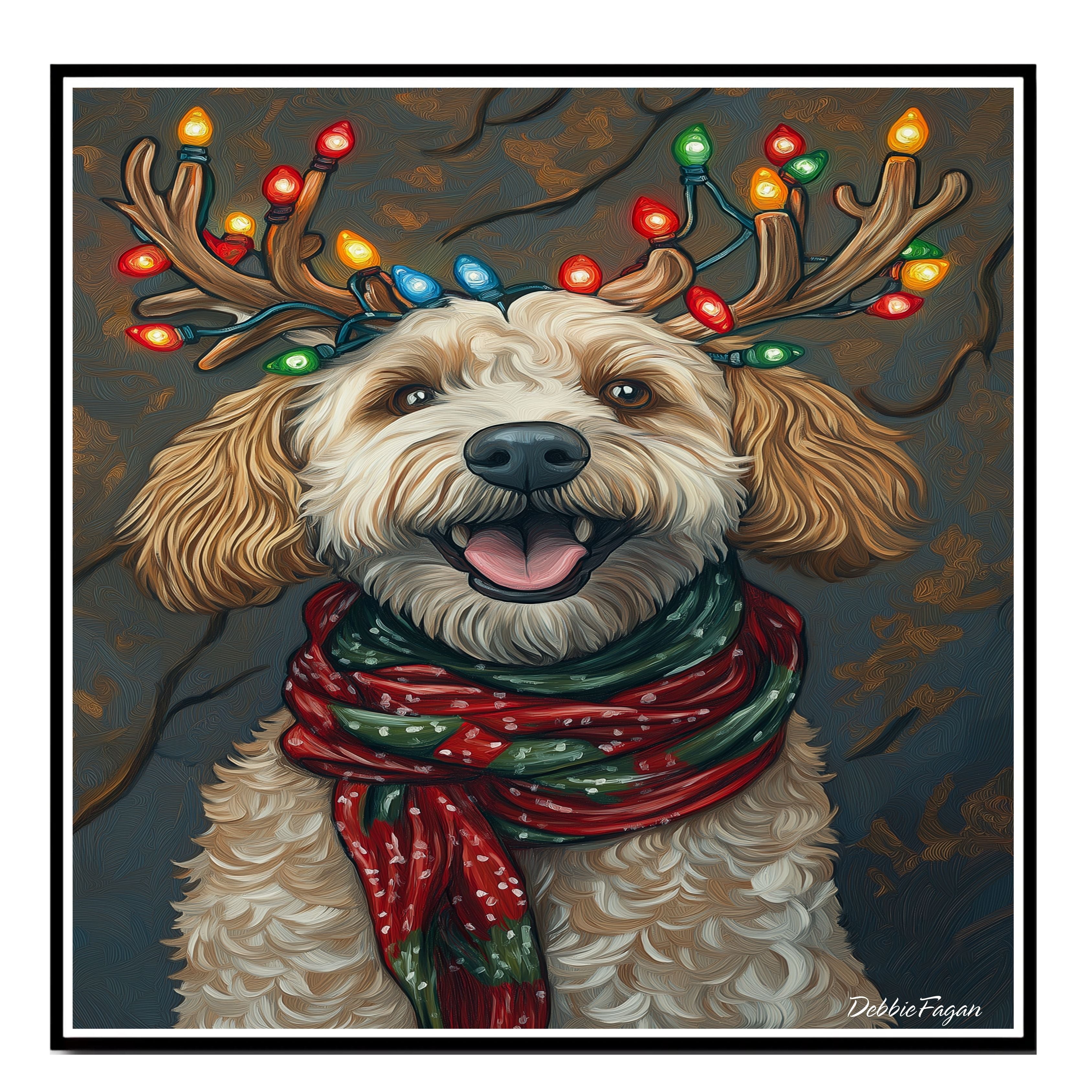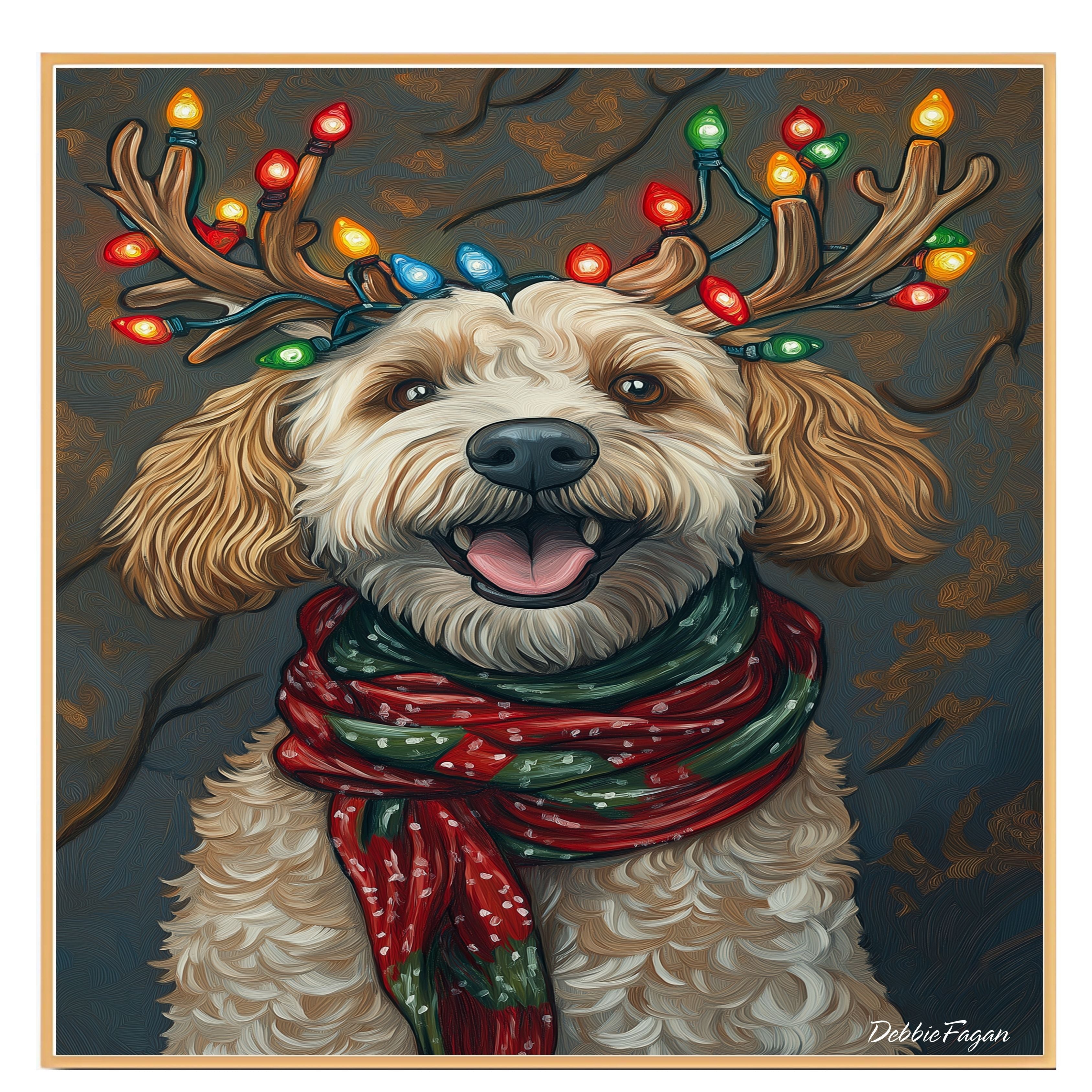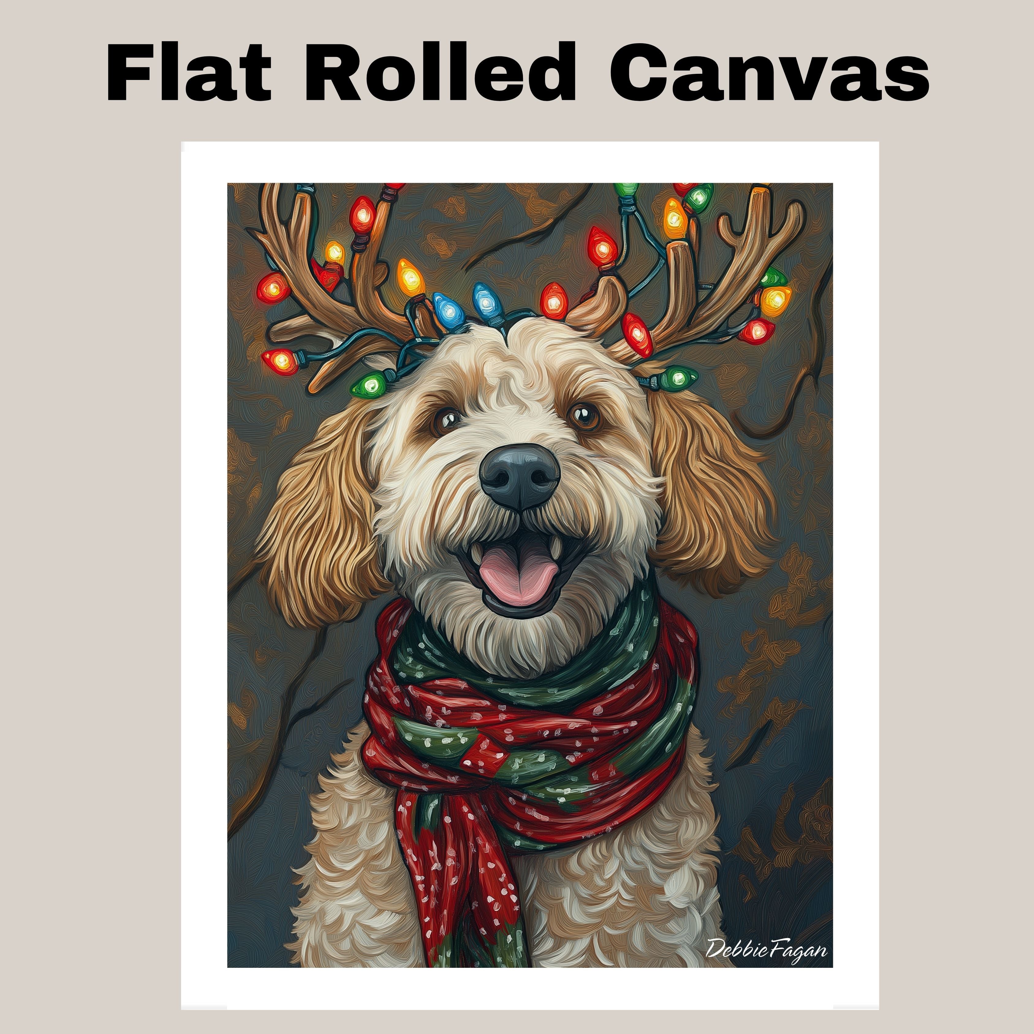 Our Bernedoodle Rustic Merriment Canvas adds a touch of cozy charm to your space, featuring an adorable Bernedoodle dog sporting festive antlers and a warm scarf against a rustic backdrop. Available on a 1.5" thick canvas wrap, floating framed canvas, or as a flat rolled canvas, this heartwarming artwork titled Rustic Merriment captures the joyful spirit of the holiday season. With its blend of rustic warmth and festive cheer, this piece is perfect for brightening your holiday decor and makes a delightful focal point in any room. Whether you're decorating for the season or searching for the perfect gift, this canvas brings a touch of whimsy and elegance to your home.