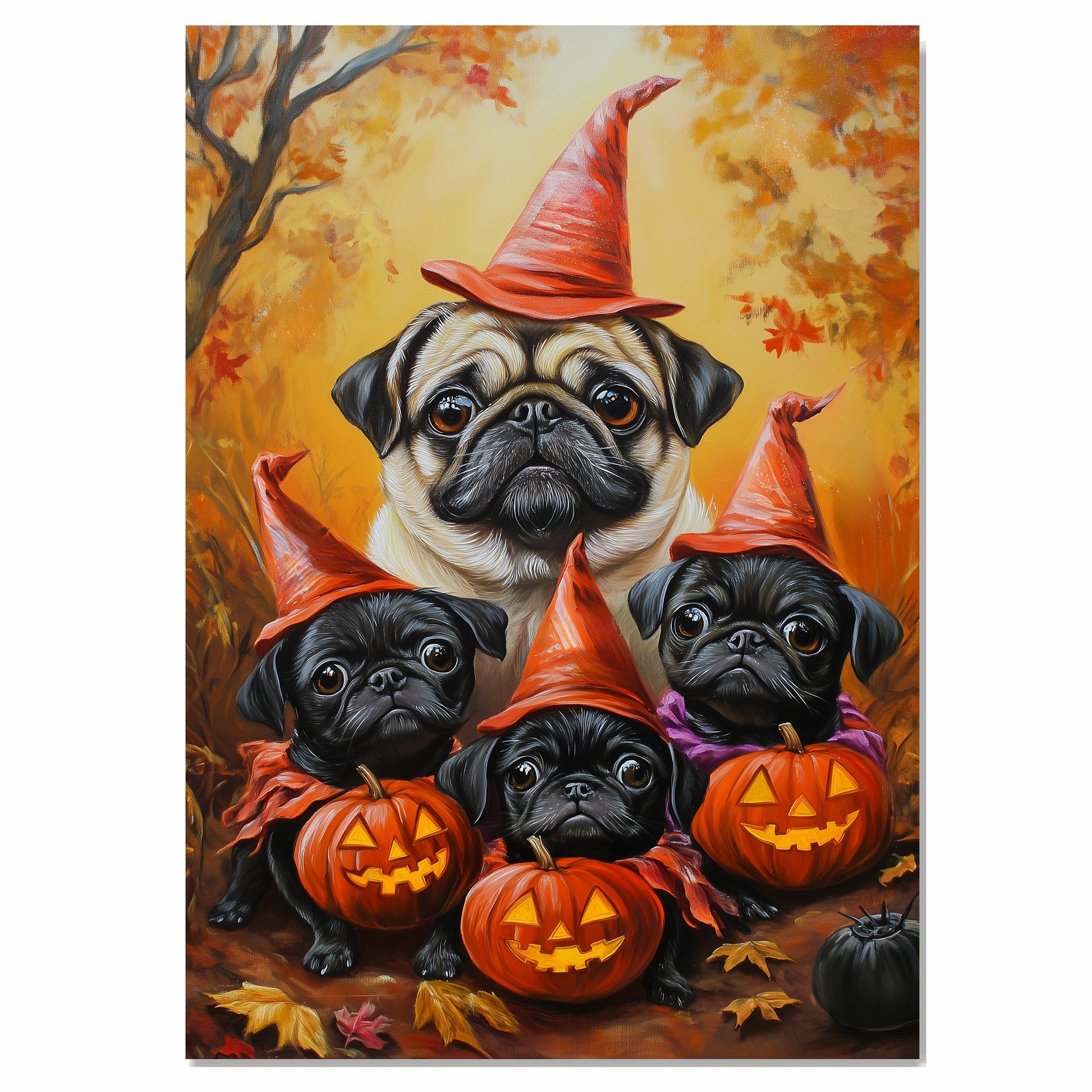 Rustic Pug Dog Halloween Canvas Wall Art with Pumpkins and Fall Lights Cozy Autumn Farmhouse Decor for Pet Lovers and Dog Moms on Ready to Hang 1.5" Thick Canvas Wrap, Floating Framed Canvas, Flat Rolled Canvas