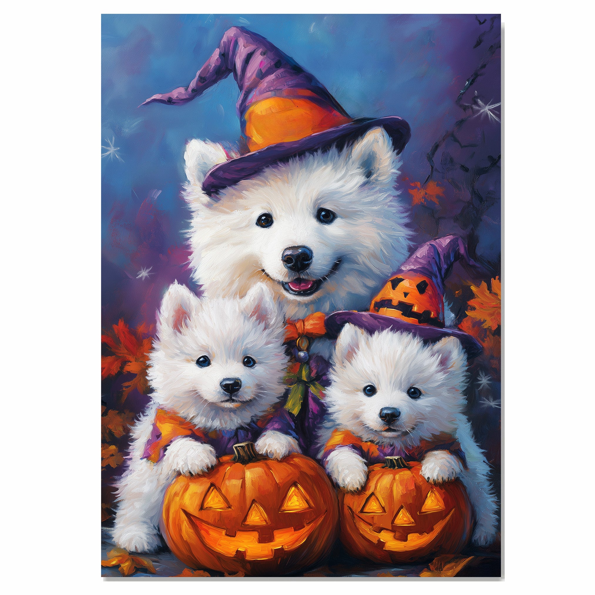 Samoyed Dog Halloween Wall Art Rustic Fall Canvas with Pumpkins Witch Hats and Autumn Leaves Farmhouse Pet Decor for Home or Bathroom on Ready to Hang 1.5" Thick Canvas Wrap, Floating Framed Canvas, Flat Rolled Canvas