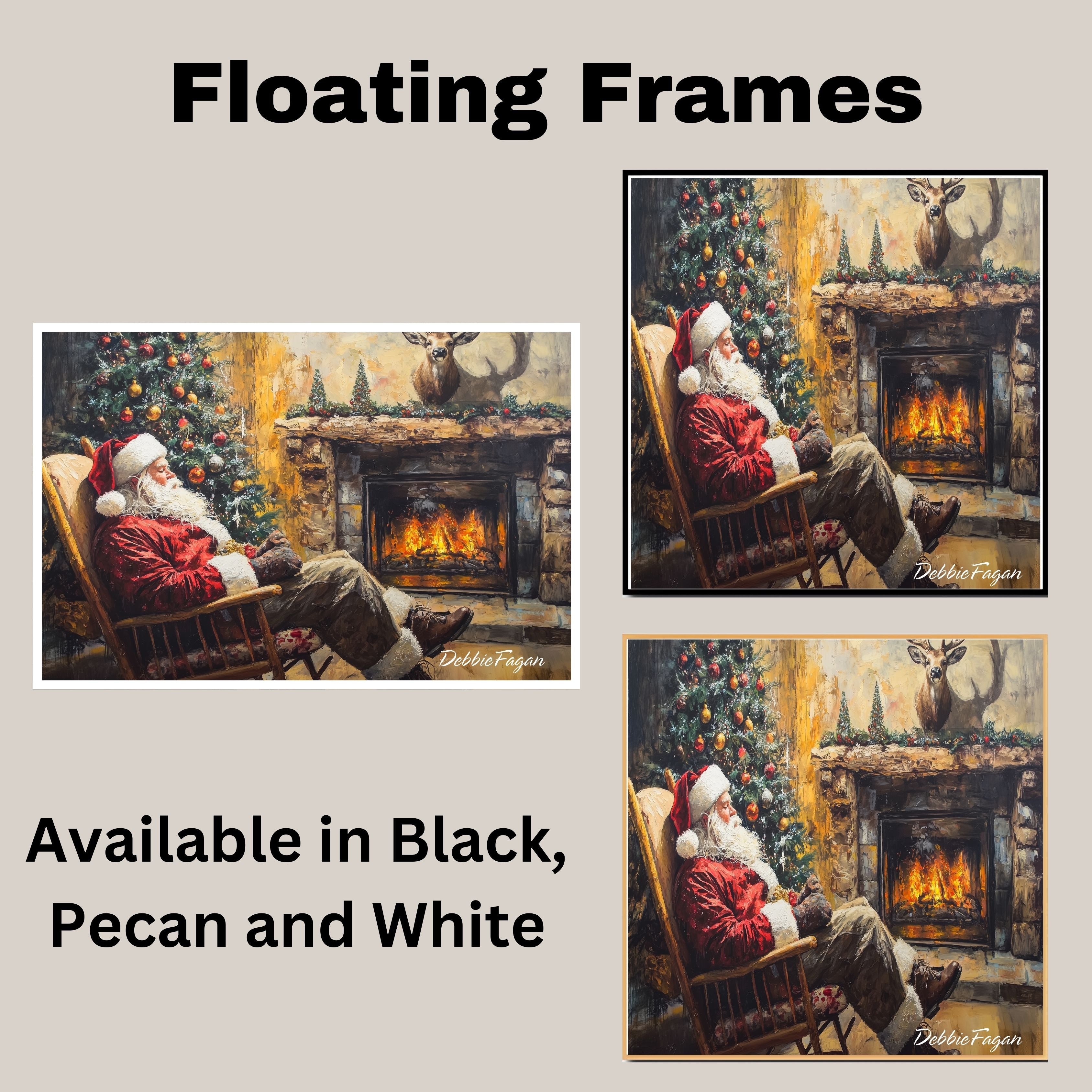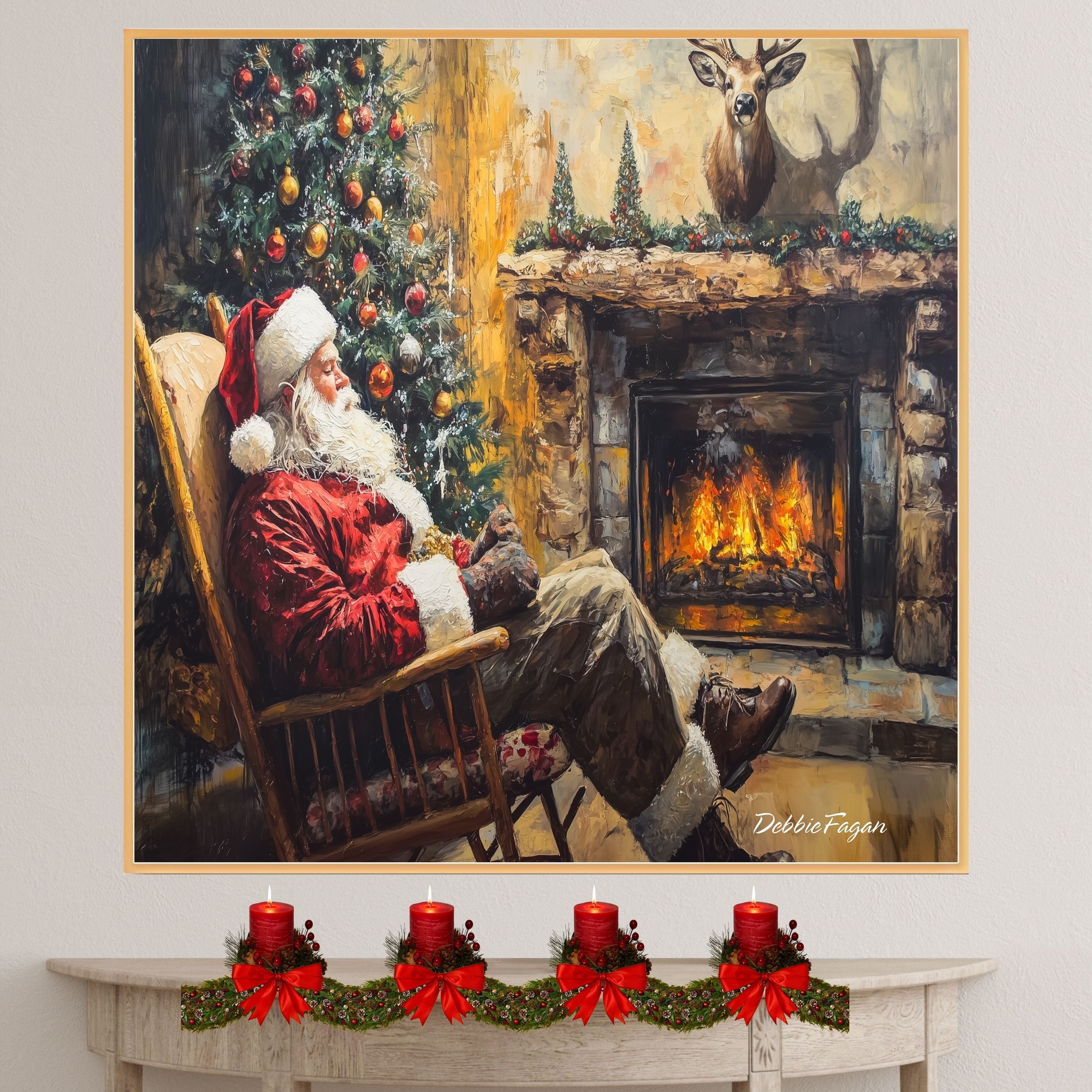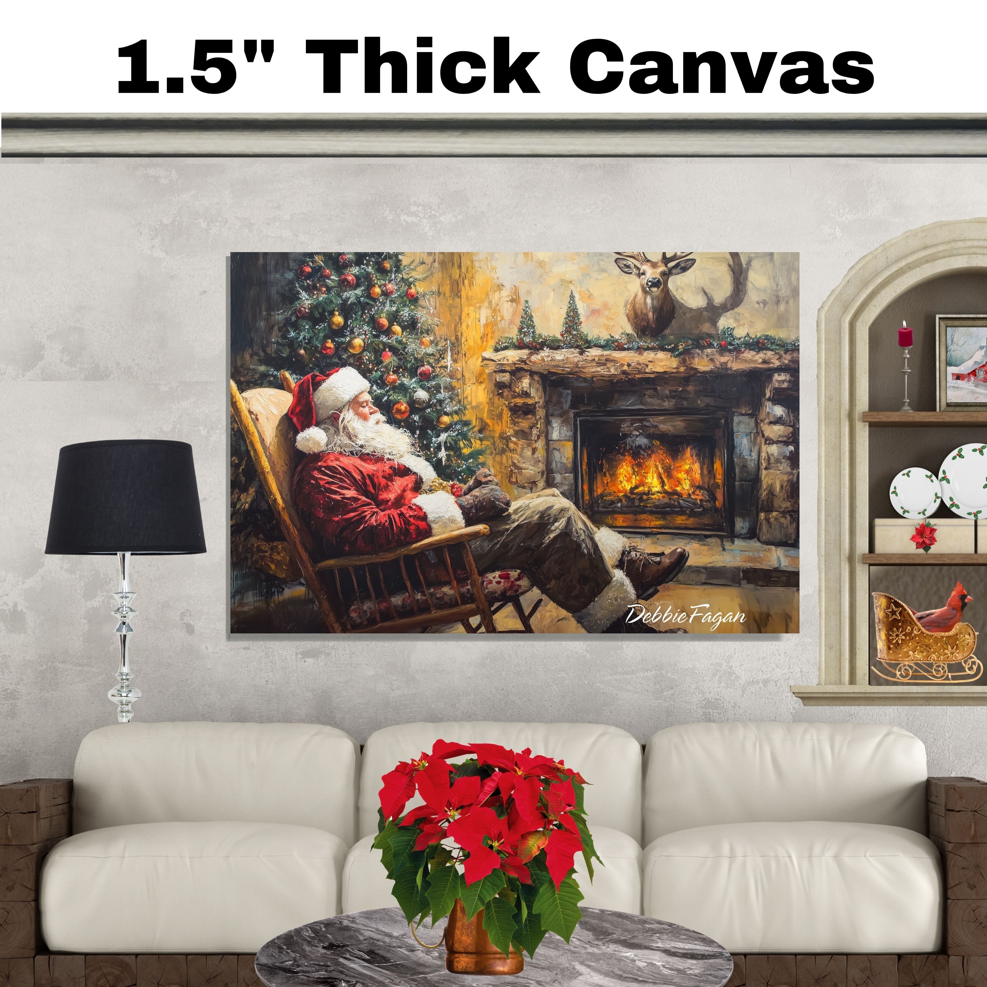Santa Claus by the Fireplace with Stockings – Cozy Christmas Wall Art Print on Ready to Hang 1.5" Thick Canvas Wrap, Floating Framed Canvas, Flat Rolled Canvas