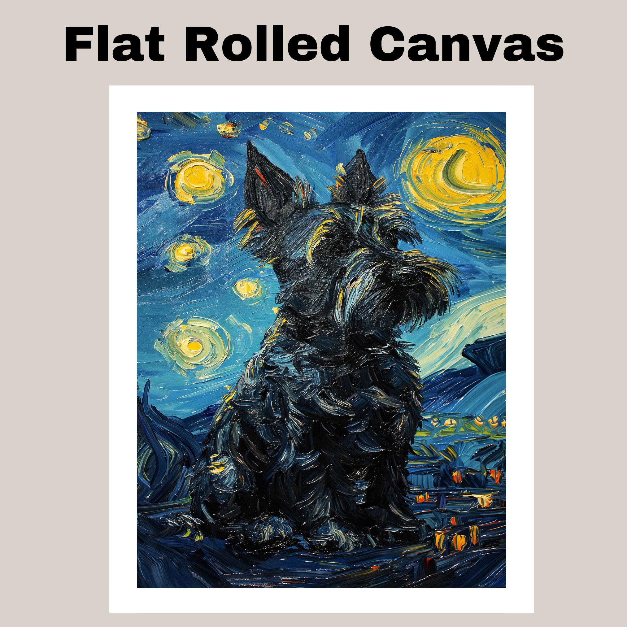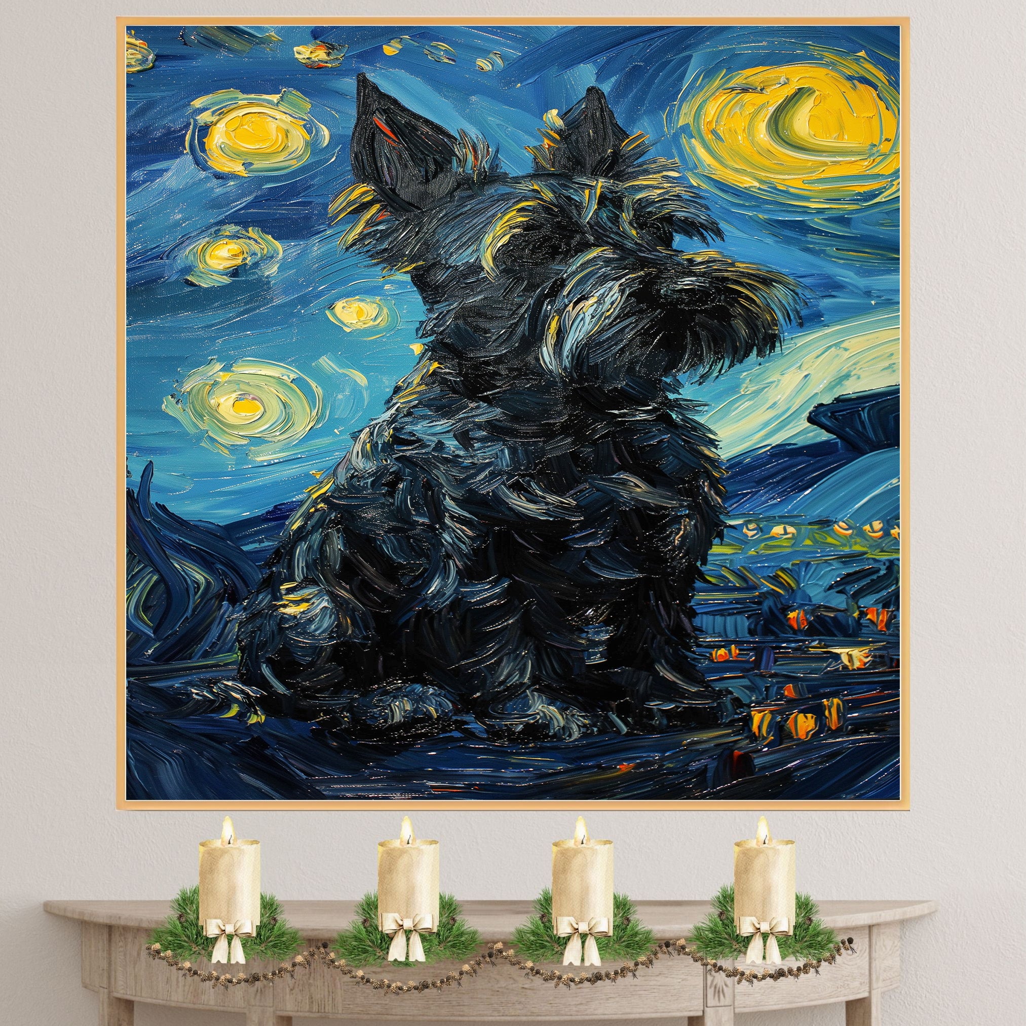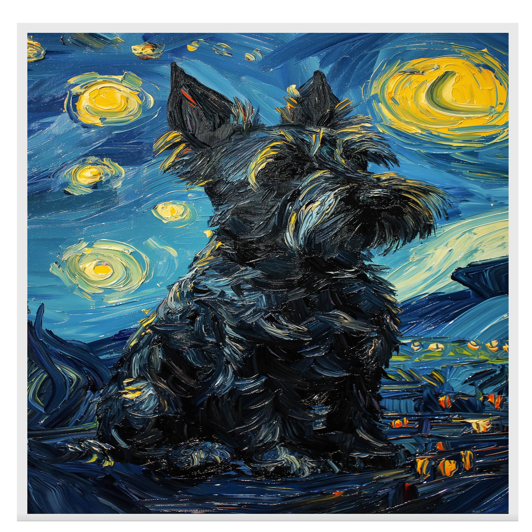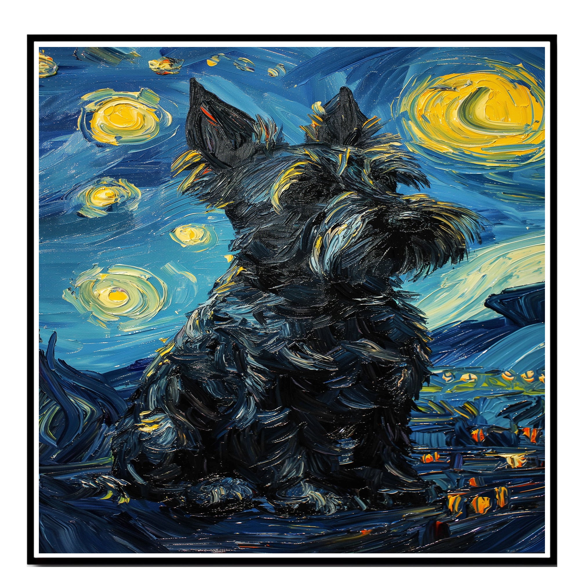 Celebrate timeless style with this expressive Scottish Terrier artwork inspired by Van Gogh’s Starry Night. Featuring bold brushwork, swirling skies, and the noble profile of a Scottie, this piece combines classic art with canine personality. Perfect for dog lovers, art collectors, or anyone who appreciates dramatic color and texture, this unique composition adds sophistication and charm to any room.