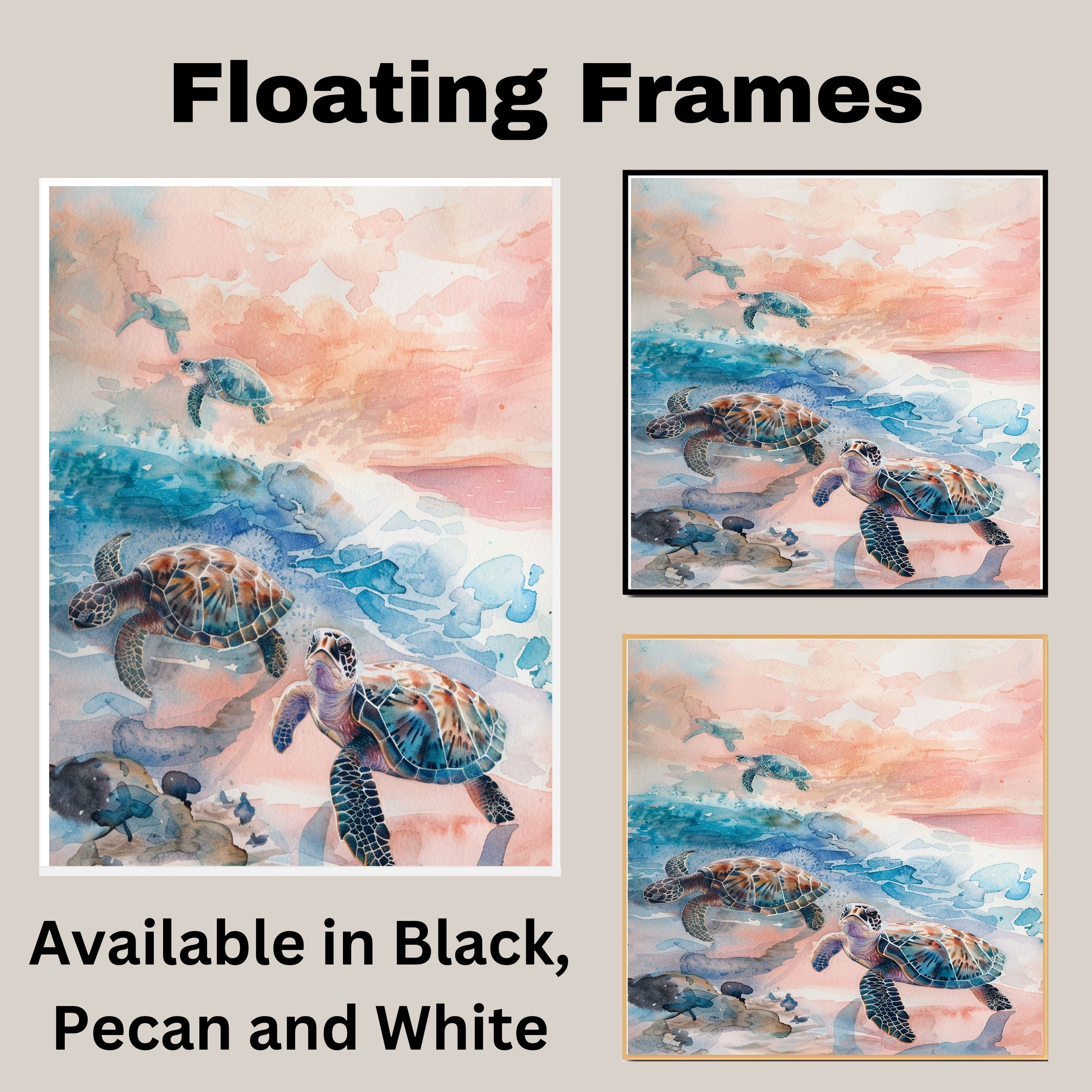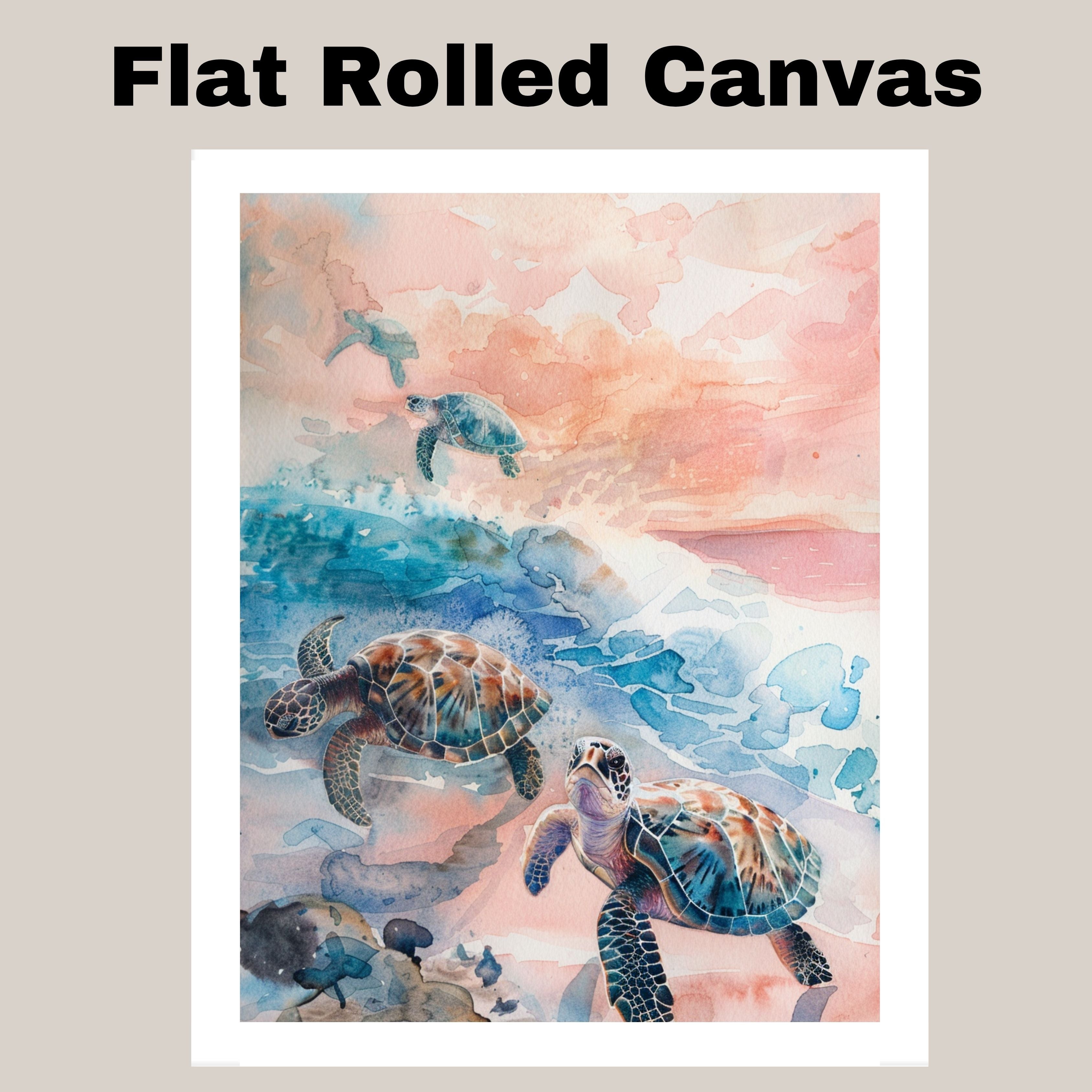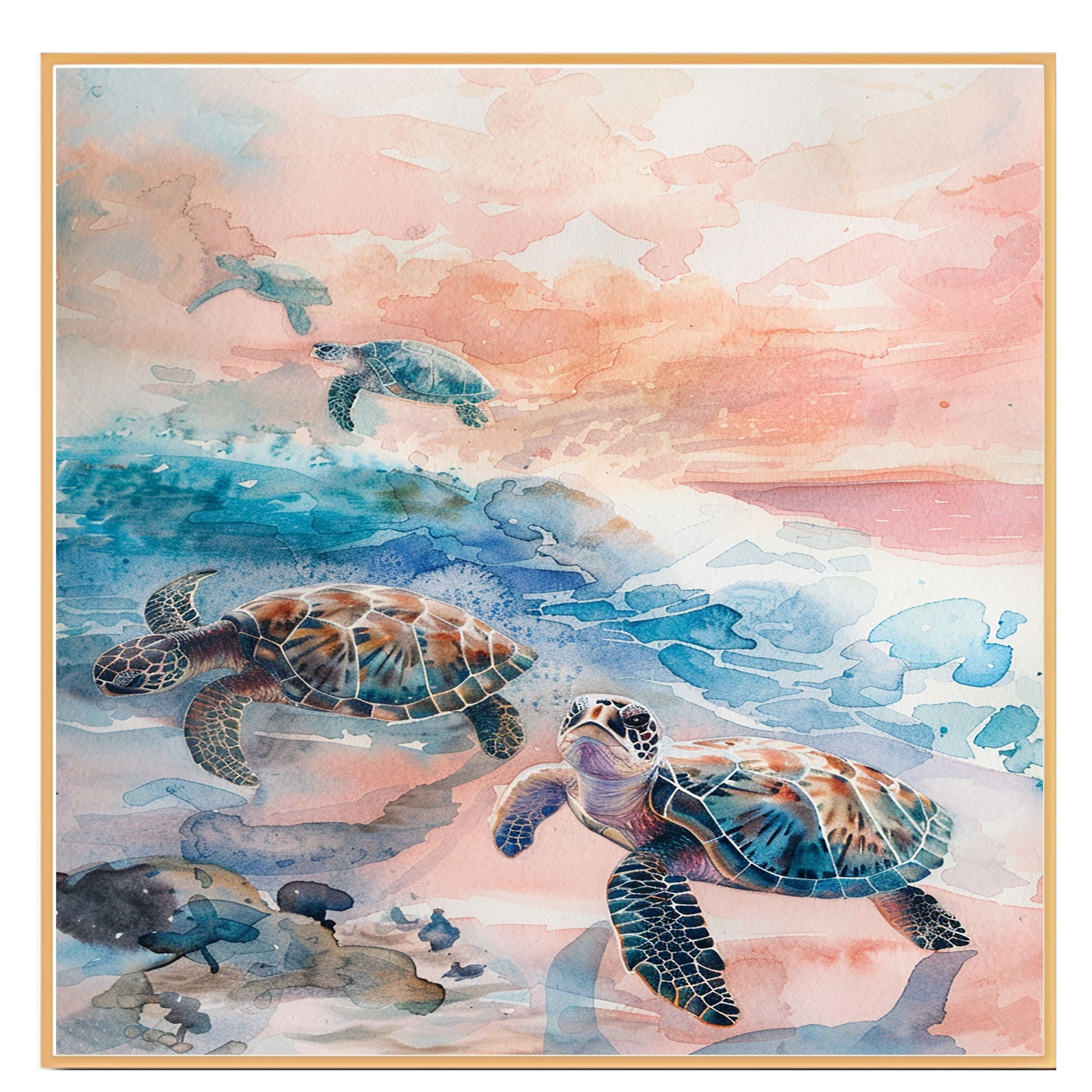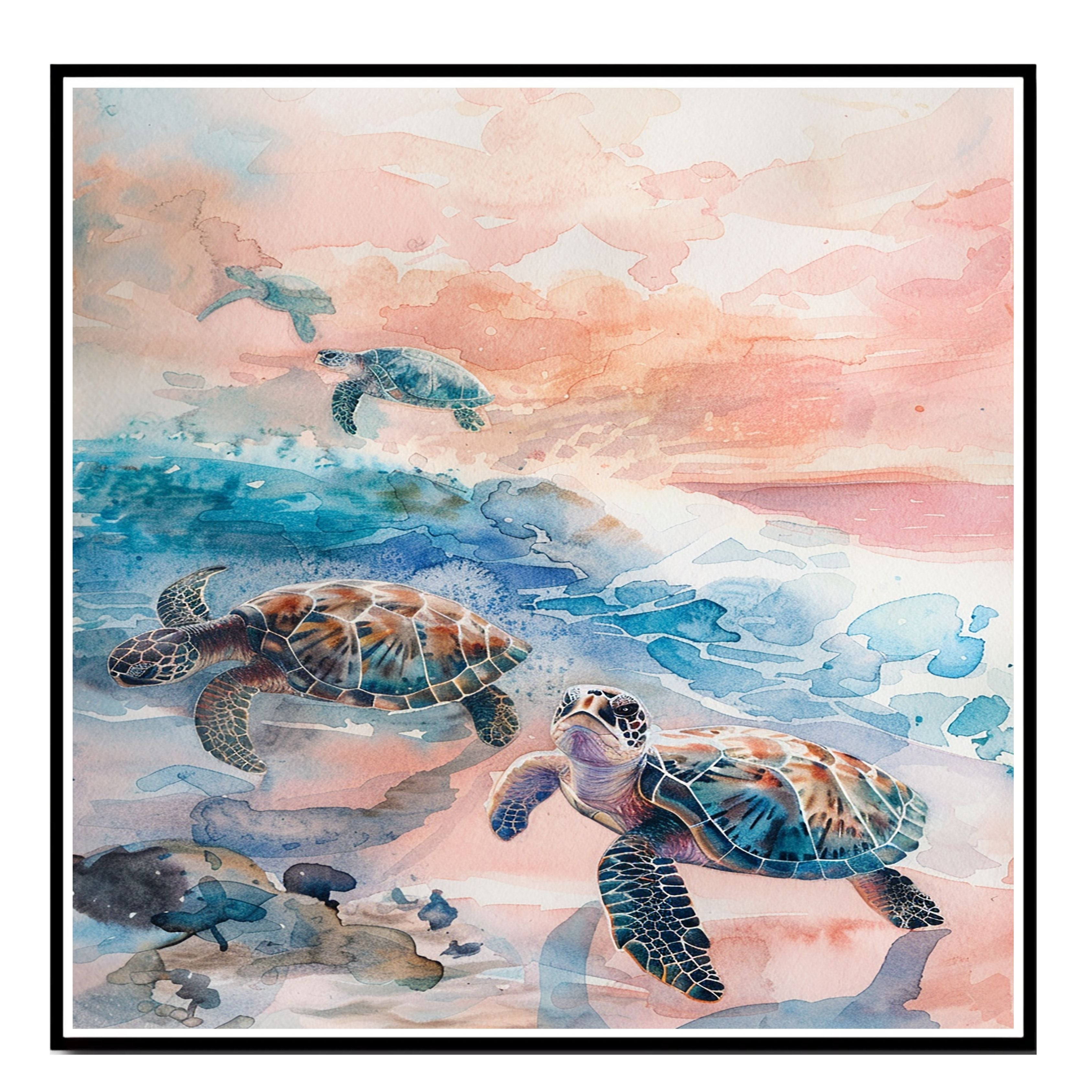 This enchanting watercolor artwork features sea turtles gliding through a pastel-hued ocean with soft waves and a glowing sunset sky. The harmonious blend of blue, coral, and peach tones evokes a sense of calm and wonder. Perfect for those who love marine life and beachside serenity, this piece adds a touch of nature's grace to any space.