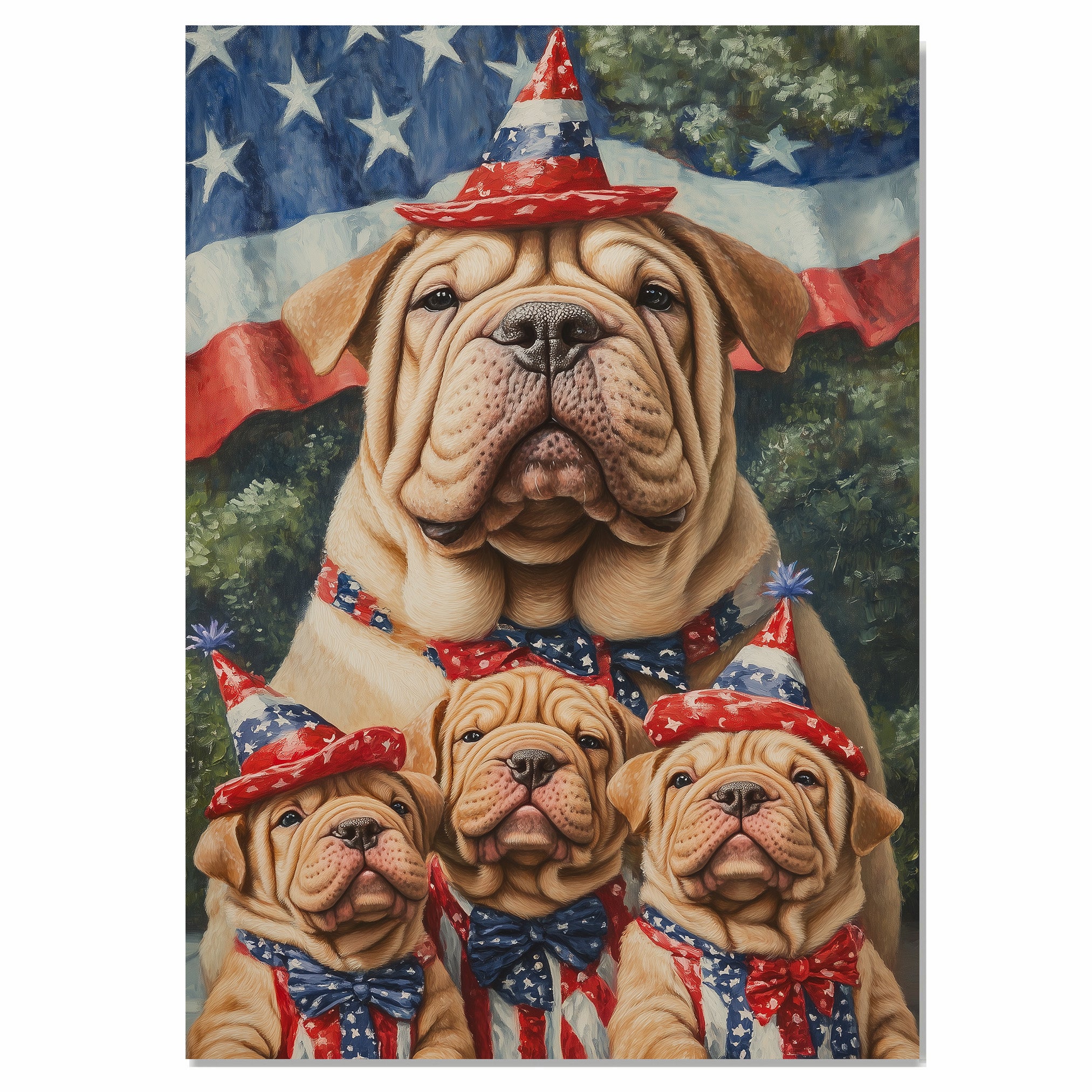 Celebrate the Fourth of July with charm and pride through this heartwarming oil-style painting of a Shar Pei mother and her three wrinkly pups. Dressed in red, white, and blue party hats and bowties, with a bold American flag waving behind them, this artwork is a perfect addition for patriotic decor and dog lovers.